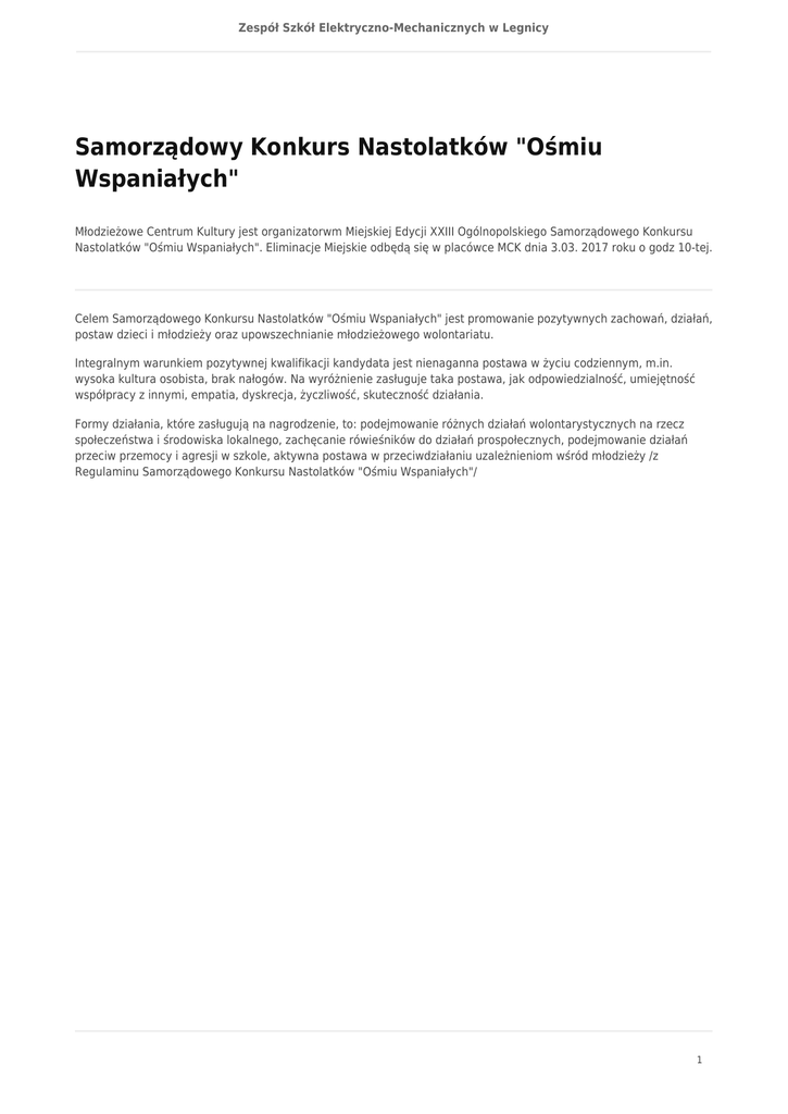 Zespół Szkół Elektryczno-Mechanicznych w Legnicy Samorządowy Konkurs Nastolatków "Ośmiu Wspaniałych" Młodzieżowe Centrum Kultury jest organizatorwm Miejskiej Edycji XXIII Ogólnopolskiego Samorządowego Konkursu Nastolatków "Ośmiu Wspaniałych". Eliminacje Miejskie odbędą się w placówce MCK dnia 3.03. 2017 roku o godz 10-tej. Celem Samorządowego Konkursu Nastolatków "Ośmiu Wspaniałych" jest promowanie pozytywnych zachowań, działań, postaw dzieci i młodzieży oraz upowszechnianie młodzieżowego wolontariatu. Integralnym warunkiem pozytywnej kwalifikacji kandydata jest nienaganna postawa w życiu codziennym, m.in. wysoka kultura osobista, brak nałogów. Na wyróżnienie zasługuje taka postawa, jak odpowiedzialność, umiejętność współpracy z innymi, empatia, dyskrecja, życzliwość, skuteczność działania. Formy działania, które zasługują na nagrodzenie, to: podejmowanie różnych działań wolontarystycznych na rzecz społeczeństwa i środowiska lokalnego, zachęcanie rówieśników do działań prospołecznych, podejmowanie działań przeciw przemocy i agresji w szkole, aktywna postawa w przeciwdziałaniu uzależnieniom wśród młodzieży /z Regulaminu Samorządowego Konkursu Nastolatków "Ośmiu Wspaniałych"/ 1