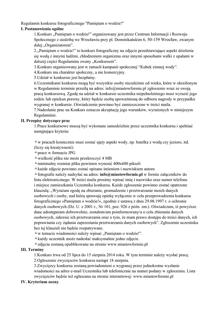 Regulamin konkursu fotograficznego "Pamiętam o wodzie!" I. Postanowienia ogólne 1.Konkurs „Pamiętam o wodzie!” organizowany jest przez Centrum Informacji i Rozwoju Społecznego z siedzibą we Wrocławiu przy pl. Dominikańskim 6, 50-159 Wrocław, zwanym dalej „Organizatorem”. 2.„Pamiętam o wodzie!” to konkurs fotograficzny na zdjęcie przedstawiające aspekt dzielenia się wodą z innymi ludźmi, chłodzeniem organizmu oraz innymi sposobami walki z upałami w dalszej części Regulaminu zwany „Konkursem”. 3.Konkurs organizowany jest w ramach kampanii społecznej “Kubek zimnej wody”. 4.Konkurs ma charakter społeczny, a nie komercyjny. 5.Udział w konkursie jest bezpłatny. 6.Uczestnikami konkursu mogą być wszystkie osoby niezależnie od wieku, które w określonym w Regulaminie terminie prześlą na adres: [email protected] zgłoszenie wraz ze swoją pracą konkursową. Zgodę na udział w konkursie uczestnika niepełnoletniego musi wyrazić jego rodzic lub opiekun prawny, który będzie osobą upoważnioną do odbioru nagrody w przypadku wygranej w konkursie. Oświadczenie powinno być zamieszczone w treści maila. 7.Nadesłanie prac na Konkurs oznacza akceptację jego warunków, wyrażonych w niniejszym Regulaminie. II. Przepisy dotyczące prac 1.Prace konkursowe muszą być wykonane samodzielnie przez uczestnika konkursu i spełniać następujące kryteria: ñw pracach koniecznie musi zostać ujęty aspekt wody, np. butelka z wodą czy jezioro, itd. (liczy się kreatywność) ñprace w formacie JPG ñwielkość pliku nie może przekroczyć 4 MB ñminimalny rozmiar pliku powinien wynosić 400x600 pikseli ñkażde zdjęcie powinno zostać opisane imieniem i nazwiskiem autora ñfotografie należy nadsyłać na adres: [email protected] w formie załączników do listu elektronicznego. W treści maila prosimy wpisać imię i nazwisko oraz numer telefonu i miejsce zamieszkania Uczestnika konkursu. Każde zgłoszenie powinno zostać opatrzone klauzulą: „Wyrażam zgodę na zbieranie, gromadzenie i przetwarzanie moich danych osobowych i osoby, nad którą sprawuję opiekę wyłącznie w celu przeprowadzenia konkursu fotograficznego »Pamiętam o wodzie!«, zgodnie z ustawą z dnia 29.08.1997 r. o ochronie danych osobowych (Dz. U. z 2001 r., Nr 101, poz. 926 z późn. zm.). Oświadczam, iż powyższe dane udostępniam dobrowolnie, zostałem/am poinformowany/a o celu zbierania danych osobowych, zakresie ich przetwarzania oraz o tym, że mam prawo dostępu do treści danych, ich poprawiania czy żądania zaprzestania przetwarzania danych osobowych”. Zgłoszenie uczestnika bez tej klauzuli nie będzie rozpatrywane. ñw temacie wiadomości należy wpisać „Pamiętam o wodzie!”. ñkażdy uczestnik może nadesłać maksymalnie jedno zdjęcie. ñzdjęcia zostaną opublikowane na stronie www.miastowformie.pl III. Terminy 1.Konkurs trwa od 25 lipca do 15 sierpnia 2014 roku. W tym terminie należy wysłać pracę. 2.Ogłoszenie zwycięzców konkursu nastąpi 18 sierpnia. 3.Zwycięzcy konkursu zostaną powiadomieni o wygranej przez jednokrotne wysłanie wiadomości na adres e-mail Uczestnika lub telefonicznie na numer podany w zgłoszeniu. Lista zwycięzców będzie też ogłaszana na stronie internetowej: www.miastowformie.pl IV. Kryterium oceny 1. Oceny prac konkursowych dokona powołana przez Organizatorów Komisja Konkursowa, która uwzględni pomysłowość i jakość zdjęć. 2. Spośród wszystkich zgłoszonych zdjęć Komisja Konkursowa wyróżni trzy najlepsze. 3. Decyzje podjęte przez Komisję Konkursową są ostateczne i prawnie wiążące dla wszystkich uczestników konkursu. IV. Nagrody 1.Nagrody przewidziane są dla wszystkich uczestników konkursu. 2.Wygrane zdjęcia zostaną opublikowane na portalu www.miastowformie.pl 3.Przewidywane nagrody za poszczególne miejsca to: • Pierwsze miejsce: zestaw Staropolanki z dostawą do domu (10 zgrzewek 1.5l wody łącznie 60 butelek) oraz 5 biletów dwugodzinnych do Wrocławskiego Parku Wodnego. • Drugie miejsce: 3 bilety dwugodzinne do Wrocławskiego Parku Wodnego • Trzecie miejsce: 2 bilety dwugodzinne do Wrocławskiego Parku Wodnego • Natomiast pozostali uczestnicy zostaną obdarowani nagrodą pocieszenia. 4.Nagroda rzeczowa nie podlega zamianie na inną ani zamianie na ekwiwalent pieniężny. 5.Przyjmuje się, że osobą uprawnioną do odbioru nagrody jest osoba, której dane wskazane są w zgłoszeniu jako „Uczestnik” lub osoba wskazana jako „Opiekun”, która wyraziła zgodę na udział w konkursie osoby niepełnoletniej. V. Wykorzystanie prac nadesłanych na konkurs 1.Udział w konkursie jest dobrowolny. 2.Zgłoszenie prac do konkursu jest równoznaczne z nieodpłatnym przekazaniem autorskich praw majątkowych na rzecz Organizatora oraz zgodą na nieodpłatne prezentowanie zdjęć na wystawach, w druku oraz w Internecie. Zdjęcie nadesłane na konkurs będą wykorzystywane do celów promocji i organizacji konkursu oraz w materiałach dot. kolejnych edycji kampanii „Kubek zimnej wody”. 3.Osoba zgłaszająca zdjęcie do konkursu bierze odpowiedzialność za zgodę dotyczącą wykorzystania wizerunku osób występujących na zdjęciach. 4.Osoby biorące udział w konkursie zgadzają się, w przypadku wygrania nagrody, na opublikowanie imienia, nazwiska i miejscowości zamieszkania w publikacjach i na stronie internetowej www.miastowformie.pl. VI. Postanowienia końcowe 1.Jeżeli zgłoszenie będzie wypełnione niezgodnie z postanowieniami niniejszego Regulaminu, praca konkursowa nie będzie rozpatrywana. 2.Organizatorzy zastrzegają sobie prawo do przerwania lub odwołania konkursu z przyczyn niezależnych od Organizatorów. 3.Organizatorzy zastrzegają sobie prawo do zmiany regulaminu, o czym Uczestnicy zostaną poinformowani.