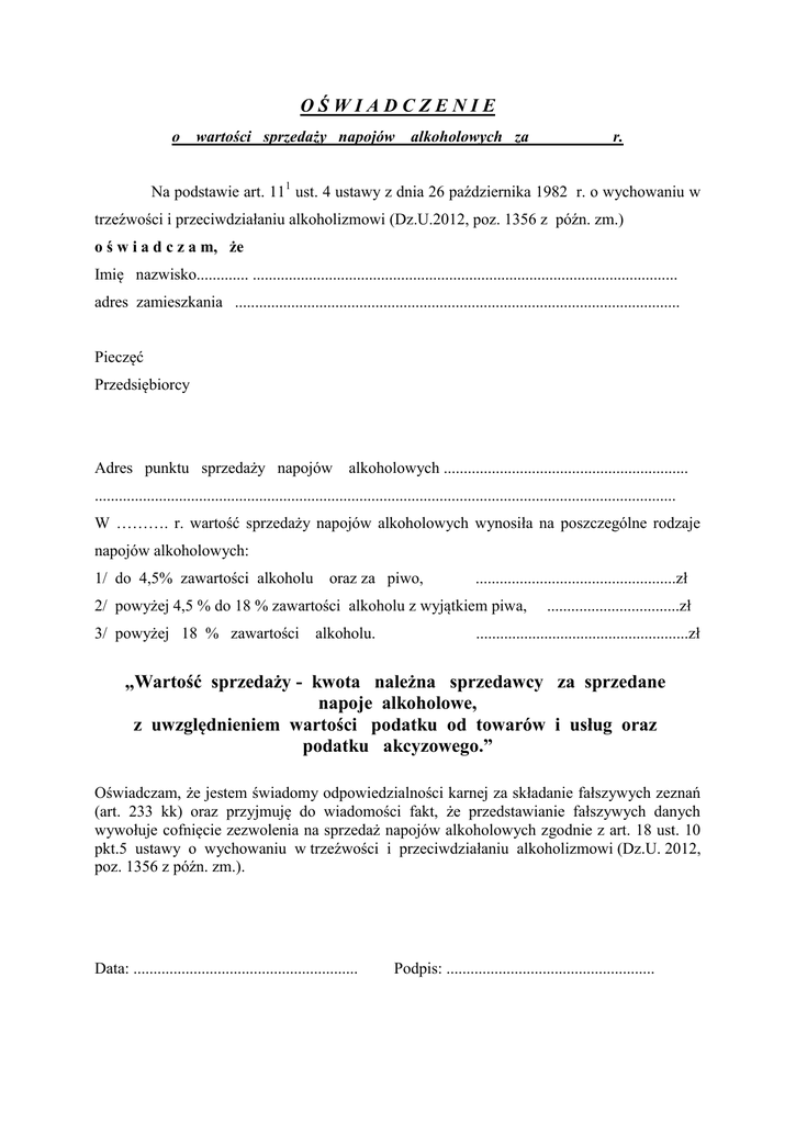 OŚWIADCZENIE o wartości sprzedaży napojów alkoholowych za r. Na podstawie art. 111 ust. 4 ustawy z dnia 26 października 1982 r. o wychowaniu w trzeźwości i przeciwdziałaniu alkoholizmowi (Dz.U.2012, poz. 1356 z późn. zm.) o ś w i a d c z a m, że Imię nazwisko............. .......................................................................................................... adres zamieszkania ............................................................................................................... Pieczęć Przedsiębiorcy Adres punktu sprzedaży napojów alkoholowych ............................................................. ................................................................................................................................................. W ………. r. wartość sprzedaży napojów alkoholowych wynosiła na poszczególne rodzaje napojów alkoholowych: 1/ do 4,5% zawartości alkoholu oraz za piwo, ..................................................zł 2/ powyżej 4,5 % do 18 % zawartości alkoholu z wyjątkiem piwa, 3/ powyżej 18 % zawartości alkoholu. .................................zł .....................................................zł „Wartość sprzedaży - kwota należna sprzedawcy za sprzedane napoje alkoholowe, z uwzględnieniem wartości podatku od towarów i usług oraz podatku akcyzowego.” Oświadczam, że jestem świadomy odpowiedzialności karnej za składanie fałszywych zeznań (art. 233 kk) oraz przyjmuję do wiadomości fakt, że przedstawianie fałszywych danych wywołuje cofnięcie zezwolenia na sprzedaż napojów alkoholowych zgodnie z art. 18 ust. 10 pkt.5 ustawy o wychowaniu w trzeźwości i przeciwdziałaniu alkoholizmowi (Dz.U. 2012, poz. 1356 z późn. zm.). Data: ........................................................ Podpis: ....................................................