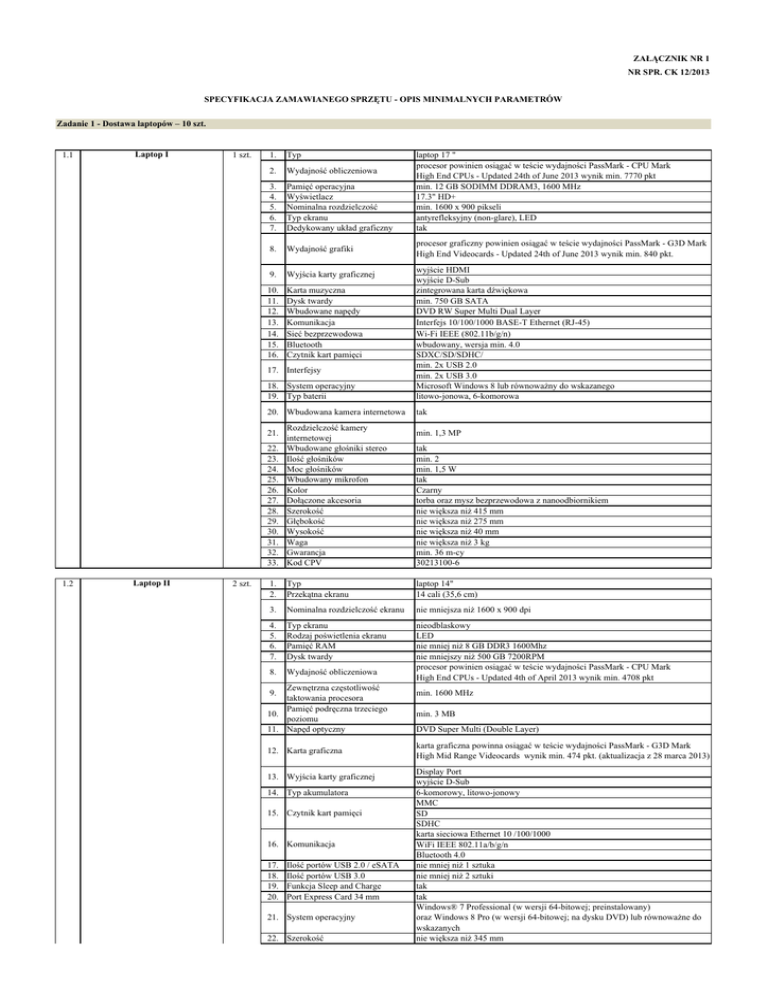 ZAŁĄCZNIK NR 1 NR SPR. CK 12/2013 SPECYFIKACJA ZAMAWIANEGO SPRZĘTU - OPIS MINIMALNYCH PARAMETRÓW Zadanie 1 - Dostawa laptopów – 10 szt. 1.1 Laptop I 1 szt. 1. Typ 2. Wydajność obliczeniowa 3. 4. 5. 6. 7. Pamięć operacyjna Wyświetlacz Nominalna rozdzielczość Typ ekranu Dedykowany układ graficzny 8. Wydajność grafiki 9. Wyjścia karty graficznej 10. 11. 12. 13. 14. 15. 16. Karta muzyczna Dysk twardy Wbudowane napędy Komunikacja Sieć bezprzewodowa Bluetooth Czytnik kart pamięci 18. System operacyjny 19. Typ baterii 20. Wbudowana kamera internetowa tak 22. 23. 24. 25. 26. 27. 28. 29. 30. 31. 32. 33. Rozdzielczość kamery internetowej Wbudowane głośniki stereo Ilość głośników Moc głośników Wbudowany mikrofon Kolor Dołączone akcesoria Szerokość Głębokość Wysokość Waga Gwarancja Kod CPV tak min. 2 min. 1,5 W tak Czarny torba oraz mysz bezprzewodowa z nanoodbiornikiem nie większa niż 415 mm nie większa niż 275 mm nie większa niż 40 mm nie większa niż 3 kg min. 36 m-cy 30213100-6 1. 2. Typ Przekątna ekranu laptop 14" 14 cali (35,6 cm) 3. Nominalna rozdzielczość ekranu nie mniejsza niż 1600 x 900 dpi 4. 5. 6. 7. Typ ekranu Rodzaj poświetlenia ekranu Pamięć RAM Dysk twardy 8. Wydajność obliczeniowa nieodblaskowy LED nie mniej niż 8 GB DDR3 1600Mhz nie mniejszy niż 500 GB 7200RPM procesor powinien osiągać w teście wydajności PassMark - CPU Mark High End CPUs - Updated 4th of April 2013 wynik min. 4708 pkt 21. Laptop II 2 szt. procesor graficzny powinien osiągać w teście wydajności PassMark - G3D Mark High End Videocards - Updated 24th of June 2013 wynik min. 840 pkt. wyjście HDMI wyjście D-Sub zintegrowana karta dźwiękowa min. 750 GB SATA DVD RW Super Multi Dual Layer Interfejs 10/100/1000 BASE-T Ethernet (RJ-45) Wi-Fi IEEE (802.11b/g/n) wbudowany, wersja min. 4.0 SDXC/SD/SDHC/ min. 2x USB 2.0 min. 2x USB 3.0 Microsoft Windows 8 lub równoważny do wskazanego litowo-jonowa, 6-komorowa 17. Interfejsy 1.2 laptop 17 " procesor powinien osiągać w teście wydajności PassMark - CPU Mark High End CPUs - Updated 24th of June 2013 wynik min. 7770 pkt min. 12 GB SODIMM DDRAM3, 1600 MHz 17.3" HD+ min. 1600 x 900 pikseli antyrefleksyjny (non-glare), LED tak Zewnętrzna częstotliwość taktowania procesora Pamięć podręczna trzeciego 10. poziomu 11. Napęd optyczny 9. 12. Karta graficzna 13. Wyjścia karty graficznej 14. Typ akumulatora 15. Czytnik kart pamięci 16. Komunikacja 17. 18. 19. 20. Ilość portów USB 2.0 / eSATA Ilość portów USB 3.0 Funkcja Sleep and Charge Port Express Card 34 mm 21. System operacyjny 22. Szerokość min. 1,3 MP min. 1600 MHz min. 3 MB DVD Super Multi (Double Layer) karta graficzna powinna osiągać w teście wydajności PassMark - G3D Mark High Mid Range Videocards wynik min. 474 pkt. (aktualizacja z 28 marca 2013) Display Port wyjście D-Sub 6-komorowy, litowo-jonowy MMC SD SDHC karta sieciowa Ethernet 10 /100/1000 WiFi IEEE 802.11a/b/g/n Bluetooth 4.0 nie mniej niż 1 sztuka nie mniej niż 2 sztuki tak tak Windows® 7 Professional (w wersji 64-bitowej; preinstalowany) oraz Windows 8 Pro (w wersji 64-bitowej; na dysku DVD) lub równoważne do wskazanych nie większa niż 345 mm 23. 24. 25. 26. 27. 28. 29. 1.3 Laptop III 3 szt. Długość Wysokość Waga Torba Mysz Gwarancja Kod CPV nie większa niż 240 mm nie większa niż 28 mm nie większa niż 2,5 kg w zestawie koloru czarnego, dopasowana do wielkości laptopa w zestawie koloru czarnego, bezprzewodowa min. 36 m-cy 30213100-6 10. Wbudowane głośniki stereo laptop 14,1" procesor powinien osiągać w teście wydajności PassMark - CPU Mark High End CPUs - Updated 4th of April 2013 wynik min. 3828 pkt. min. 4 GB pamięci DDR3 SDRAM 1600 MHz ekran LED HD+ o przekątnej 35,6 cm (14"; 1600x900), z powłoką antyrefleksyjną dysk min. SATA II 500 GB, 7200 obr./min DVD+/-RW SuperMulti DL 1 port 1394a 1 gniazdo zasilania prądem zmiennym 1 złącze DisplayPort 1 złącze dokowania 1 port combo eSATA/USB 2.0 1 gniazdo RJ-45 1 złącze akumulatora dodatkowego 1 wyjście stereo słuchawkowe/liniowe 1 wejście stereo mikrofonowe 1 port USB 2.0 1 port VGA 2 porty USB 3.0 karta sieciowa 10/100/1000 1 gniazdo kart Express Card/54 1 czytnik kart SD/MMC tak 11. kamera internetowa min. 720p HD 1. Typ 2. Wydajność obliczeniowa 3. Pamięć operacyjna 4. Wyświetlacz 5. 6. Napęd wewnętrzny Napęd optyczny 7. Porty (minimum) 8. Interfejs sieciowy 9. Gniazda rozszerzeń Wbudowany aparat fotograficzny 12. Klawiatura 13. Urządzenie wskazujące 14. Łączność bezprzewodowa pełnowymiarowa klawiatura odporna na zalanie z otworami odpływowymi tabliczka dotykowa z przyciskiem wł./wył., przewijanie w dwóch kierunkach, sterowanie palcami, dwa przyciski wyboru karta sieciowa 802.11a/b/g/n, zintegrowany moduł z technologią Bluetooth 4.0+ EDR 15. Czytnik kart procesorowych Smart tak Card (zastępuje ExpressCard) 16. Czytnik linii papilarnych tak 17. Szyfrowanie dysków tak 18. Gniazdo blokady zabezpieczającej tak Dodatkowo w zestawie Waga (z baterią) Kolor Gwarancja Kod CPV 6-ogniwowy akumulator litowy, min. 55 Wh min. 8 godz. Microsoft Windows 7 Professional PL (wersja 64-bitowa) lub równoważny do wskazanego torba w kolorze czarnym poniżej 2,3 kg czarny min. 24 m-ce 30213100-6 1. Typ stacja dokująca kompatybilna z laptopem oferowanym w pkt 1.3 2. Podłączenie 19. Typ akumulatora 20. Czas pracy baterii 21. System operacyjny 22. 23. 24. 25. 26. 1.4 Stacja dokująca do laptopa 3 szt. bezpośrednio do złącza dokowania w laptopie D-Sub 2 x DVI 2 x DisplayPort eSATA 4 x USB 3.0 1 x USB 2.0 1 x USB 2.0 powered 3. Złącza 2 x PS/2 RJ-45 COM LPT wyjście słuchawkowe wejście mikrofonowe zasilania slot na linkę zabezpieczającą wnęka na dysk twardy lub napęd optyczny 1.5 Ultrabook 13,3" 1 szt. 4. Gwarancja min. 24 m-ce 5. Kod CPV 30237200-1 1. Typ ultrabook 13,3" procesor powinien osiągać w teście wydajności PassMark - CPU Mark High End CPUs - Updated 1st of