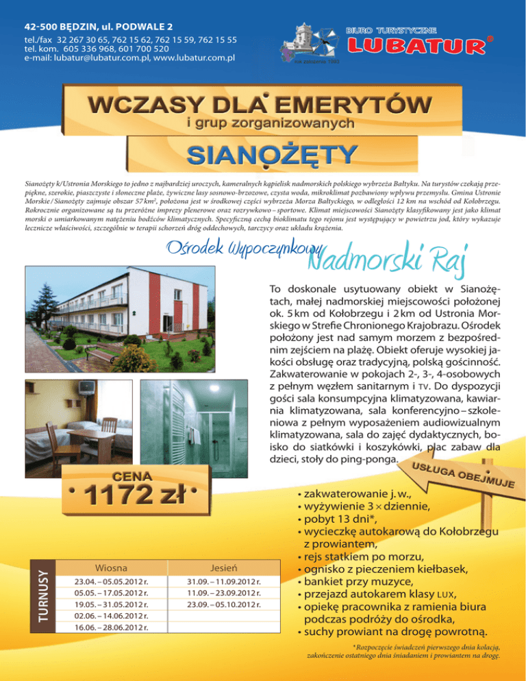 42-500 BĘDZIN, ul. PODWALE 2 tel./fax 32 267 30 65, 762 15 62, 762 15 59, 762 15 55 tel. kom. 605 336 968, 601 700 520 e-mail: [email protected], www.lubatur.com.pl rok założenia 1993 Sianożęty k/Ustronia Morskiego to jedno z najbardziej uroczych, kameralnych kąpielisk nadmorskich polskiego wybrzeża Bałtyku. Na turystów czekają przepiękne, szerokie, piaszczyste i słoneczne plaże, żywiczne lasy sosnowo-brzozowe, czysta woda, mikroklimat pozbawiony wpływu przemysłu. Gmina Ustronie Morskie / Sianożęty zajmuje obszar 57 km2, położona jest w środkowej części wybrzeża Morza Bałtyckiego, w odległości 12 km na wschód od Kołobrzegu. Rokrocznie organizowane są tu przeróżne imprezy plenerowe oraz rozrywkowo – sportowe. Klimat miejscowości Sianożęty klasyfikowany jest jako klimat morski o umiarkowanym natężeniu bodźców klimatycznych. Specyficzną cechą bioklimatu tego rejonu jest występujący w powietrzu jod, który wykazuje lecznicze właściwości, szczególnie w terapii schorzeń dróg oddechowych, tarczycy oraz układu krążenia. Osrodek Wypoczynkowy Nadmorski Raj TURNUSY To doskonale usytuowany obiekt w Sianożętach, małej nadmorskiej miejscowości położonej ok. 5 km od Kołobrzegu i 2 km od Ustronia Morskiego w Strefie Chronionego Krajobrazu. Ośrodek położony jest nad samym morzem z bezpośrednim zejściem na plażę. Obiekt oferuje wysokiej jakości obsługę oraz tradycyjną, polską gościnność. Zakwaterowanie w pokojach 2-, 3-, 4-osobowych z pełnym węzłem sanitarnym i tv . Do dyspozycji gości sala konsumpcyjna klimatyzowana, kawiarnia klimatyzowana, sala konferencyjno – szkoleniowa z pełnym wyposażeniem audiowizualnym klimatyzowana, sala do zajęć dydaktycznych, boisko do siatkówki i koszykówki, plac zabaw dla dzieci, stoły do ping-ponga. Wiosna Jesień 23.04. – 05.05.2012 r. 05.05. – 17.05.2012 r. 19.05. – 31.05.2012 r. 02.06. – 14.06.2012 r. 16.06. – 28.06.2012 r. 31.09. – 11.09.2012 r. 11.09. – 23.09.2012 r. 23.09. – 05.10.2012 r. •zakwaterowanie j. w., •wyżywienie 3 × dziennie, •pobyt 13 dni*, •wycieczkę autokarową do Kołobrzegu z prowiantem, •rejs statkiem po morzu, •ognisko z pieczeniem kiełbasek, •bankiet przy muzyce, •przejazd autokarem klasy lux , •opiekę pracownika z ramienia biura podczas podróży do ośrodka, •suchy prowiant na drogę powrotną. *Rozpoczęcie świadczeń pierwszego dnia kolacją, zakończenie ostatniego dnia śniadaniem i prowiantem na drogę.