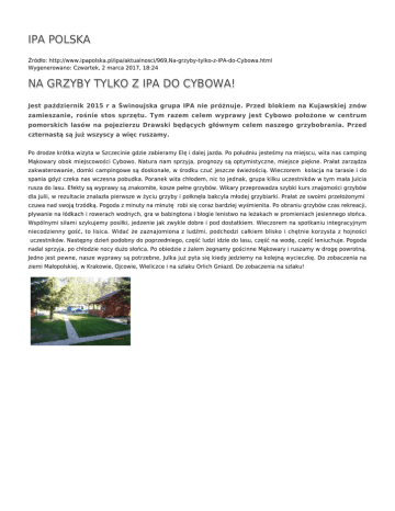 IPA POLSKA Źródło: http://www.ipapolska.pl/ipa/aktualnosci/969,Na-grzyby-tylko-z-IPA-do-Cybowa.html Wygenerowano: Czwartek, 2 marca 2017, 18:24 NA GRZYBY TYLKO Z IPA DO CYBOWA! Jest październik 2015 r a Świnoujska grupa IPA nie próżnuje. Przed blokiem na Kujawskiej znów zamieszanie, rośnie stos sprzętu. Tym razem celem wyprawy jest Cybowo położone w centrum pomorskich lasów na pojezierzu Drawski będących głównym celem naszego grzybobrania. Przed czternastą są już wszyscy a więc ruszamy. Po drodze krótka wizyta w Szczecinie gdzie zabieramy Elę i dalej jazda. Po południu jesteśmy na miejscu, wita nas camping Mąkowary obok miejscowości Cybowo. Natura nam sprzyja, prognozy są optymistyczne, miejsce piękne. Prałat zarządza zakwaterowanie, domki campingowe są doskonałe, w środku czuć jeszcze świeżością. Wieczorem kolacja na tarasie i do spania gdyż czeka nas wczesna pobudka. Poranek wita chłodem, nic to jednak, grupa kilku uczestników w tym mała Julcia rusza do lasu. Efekty są wyprawy są znakomite, kosze pełne grzybów. Wikary przeprowadza szybki kurs znajomości grzybów dla Julii, w rezultacie znalazła pierwsze w życiu grzyby i połknęła bakcyla młodej grzybiarki. Prałat ze swoimi przełożonymi czuwa nad swoją trzódką. Pogoda z minuty na minutę robi się coraz bardziej wyśmienita. Po obraniu grzybów czas rekreacji, pływanie na łódkach i rowerach wodnych, gra w babingtona i błogie lenistwo na leżakach w promieniach jesiennego słońca. Wspólnymi siłami szykujemy posiłki, jedzenie jak zwykle dobre i pod dostatkiem. Wieczorem na spotkaniu integracyjnym niecodzienny gość, to lisica. Widać że zaznajomiona z ludźmi, podchodzi całkiem blisko i chętnie korzysta z hojności uczestników. Następny dzień podobny do poprzedniego, część ludzi idzie do lasu, część na wodę, część leniuchuje. Pogoda nadal sprzyja, po chłodzie nocy dużo słońca. Po obiedzie z żalem żegnamy gościnne Mąkowary i ruszamy w drogę powrotną. Jedno jest pewne, nasze wyprawy są potrzebne, Julka już pyta się kiedy jedziemy na kolejną wycieczkę. Do zobaczenia na ziemi Małopolskiej, w Krakowie, Ojcowie, Wieliczce i na szlaku Orlich Gniazd. Do zobaczenia na szlaku! Ocena: 0/5 (0) Tweetnij