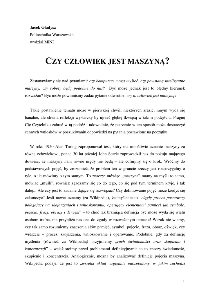 rozważań? Być może powinniśmy zadać pytanie odwrotne: czy to człowiek jest maszyną?