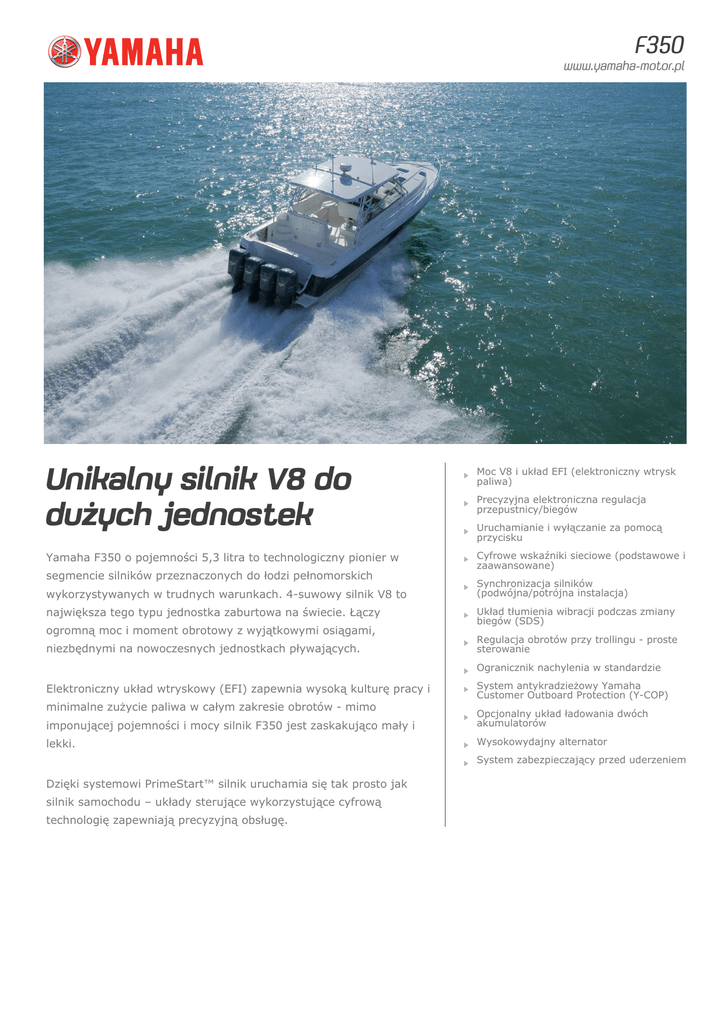 F350 www.yamaha-motor.pl Unikalny silnik V8 do dużych jednostek Moc V8 i układ EFI (elektroniczny wtrysk paliwa) Yamaha F350 o pojemności 5,3 litra to technologiczny pionier w Cyfrowe wskaźniki sieciowe (podstawowe i zaawansowane) segmencie silników przeznaczonych do łodzi pełnomorskich wykorzystywanych w trudnych warunkach. 4-suwowy silnik V8 to największa tego typu jednostka zaburtowa na świecie. Łączy ogromną moc i moment obrotowy z wyjątkowymi osiągami, niezbędnymi na nowoczesnych jednostkach pływających. Precyzyjna elektroniczna regulacja przepustnicy/biegów Uruchamianie i wyłączanie za pomocą przycisku Synchronizacja silników (podwójna/potrójna instalacja) Układ tłumienia wibracji podczas zmiany biegów (SDS) Regulacja obrotów przy trollingu - proste sterowanie Ogranicznik nachylenia w standardzie Elektroniczny układ wtryskowy (EFI) zapewnia wysoką kulturę pracy i minimalne zużycie paliwa w całym zakresie obrotów - mimo System antykradzieżowy Yamaha Customer Outboard Protection (Y-COP) imponującej pojemności i mocy silnik F350 jest zaskakująco mały i Opcjonalny układ ładowania dwóch akumulatorów lekki. Wysokowydajny alternator System zabezpieczający przed uderzeniem Dzięki systemowi PrimeStart™ silnik uruchamia się tak prosto jak silnik samochodu – układy sterujące wykorzystujące cyfrową technologię zapewniają precyzyjną obsługę. F350 www.yamaha-motor.pl Ogromna moc V8 oraz technologia, której możesz zaufać Niezależnie od tego, czy Twoja łódź to jednostka rekreacyjna czy intensywnie eksploatowana łódź profesjonalna, silnik F350 poprawi jej osiągi. Podobnie jak wszystkie silniki w ofercie firmy wykorzystuje najnowsze technologie Yamaha. Rewolucyjna konstrukcja silnika oraz innowacyjny układ dolotowy i wydechowy zapewniają najwyższą wydajność, do której przyczynia się również mikrokomputer nadzorujący każdy aspekt pracy silnika – od mieszanki paliwowej i wydajności spalania po planowanie przeglądów. Nasze silniki, od początku projektowane do zastosowań w środowisku wodnym, oferują ponadprzeciętne osiągi, wydajność i użyteczność, a przy tym pomagają chronić środowisko naturalne dzięki zastosowaniu nowatorskich technologii ekologicznego spalania. F350 www.yamaha-motor.pl Silnik V8 o kącie rozwarcia 60º i pojemności 5,3 litra, wyposażony w technologie DOHC i VCT Potężny silnik V8 cechuje zaawansowany system EFI, lekkie, kute tłoki i cztery zawory na cylinder. Dzięki systemowi jednoczesnego ładowania dwóch akumulatorów (Dual Battery Charging System) nawet po dłuższym okresie pracy na małych obrotach nie zabraknie Ci mocy do ponownego uruchomienia silnika. Zwarty i lekki - mimo ogromnej mocy Program redukcji wagi wdrożony przez inżynierów Yamahy zaowocował opracowaniem innowacyjnego, rzędowego układu wydechowego, w którym kolektor jest wbudowany w głowicę. Dzięki innym rozwiązaniom i materiałom zapewniającym ograniczenie wagi, silnik jest niezwykle lekki i kompaktowy, i to bez wpływu na wydajność i osiągi. Digital Network II W dzisiejszych czasach posiadacze łodzi oczekują przejrzystych, precyzyjnych danych dotyczących silnika, które zapewnia nowy, wielofunkcyjny wskaźnik kolorowy. Wyświetlacz LCD wysokiej rozdzielczości, o przekątnej 5 cali, zgodny z nowym osprzętem Yamaha, można skonfigurować do wyświetlania różnych zestawów informacji. Dostępny jest nawet specjalny ekran do monitorowania trybu zróżnicowanych obrotów przy trollingu. Zmienne fazy rozrządu (VCT) System VCT precyzyjnie reguluje czas wlotu wałka rozrządu, zwiększając wydajność układu wydechowego w pełnym zakresie obrotów. Precyzyjna kontrola pracy zaworów pozwala na uzyskanie maksymalnego momentu obrotowego, w szczególności w zakresie 2000-3500 obr/min, co pozwala na szybkie poziomowanie łodzi. Mikrokomputerowy moduł sterujący silnika ECM (Engine Control Module) Niezawodny mikrokomputer jest „mózgiem” silnika. Nieustannie monitoruje odbierane dane i ustawienia w celu zapewnienia płynnej pracy i optymalnych czasów zapłonów, a ponadto automatycznie uruchamia systemy ostrzegawcze i zabezpieczające. Wygodne złącze diagnostyczne umożliwia autoryzowanym serwisom Yamaha łatwy dostęp w celu diagnozowania ewentualnych usterek. Model ze śrubą przeciwbieżną Klasyczny układ z dwoma silnikami (obie śruby obracają się zgodnie z ruchem wskazówek zegara) ściąga łódź w lewą stronę, co utrudnia manewrowanie, w szczególności przy większych prędkościach. Do jednostki napędowej F350 można zamówić śrubę przeciwbieżną, która w układzie z silnikiem w wersji standardowej zapewnia neutralny kąt prowadzenia łodzi. F350 www.yamaha-motor.pl Silnik Typ silnika 4-suwowy Pojemność 5 330 cm³ Liczba cylindrów/układ 60°-V8, 32-zaworowy, DOHC Średnica x skok tłoka 94,0 mm x 96,0 mm Wydajność mocy w średnim zakresie obrotów 257,4 kW / 5 500 obr./min Pełny zakres roboczy przepustnicy 5 000 - 6 000 obr./min Układ smarowania Mokra miska olejowa Układ paliwowy EFI System wyprzedzenia zapłonu TCI Układ rozrusznika Elektryczny Przełożenie przekładni 1,73 (26/15) Wymiary Zalecana wysokość pawęży łodzi X:637 mm U:764 mm Masa ze śrubą F350AETX: 356.0 kg, FL350AETX: 356.0 kg, F350AETU: 364.0 kg, FL350AETU: 364.0 kg Pojemność zbiornika paliwa Pojemność miski olejowej 6,3 litrów Informacje dodatkowe Sterowanie Sterowanie zdalne Sterowanie przepustnicą i zmiana biegów Cyfrowe elektroniczne zdalne sterowanie, Cyfrowa sieć II Sposób trymowania i podnoszenia System Power Trim & Tilt Cewka prądowa / alternator 12 V - 49 A with rectifier/regulator Ogranicznik przechyłu (tylko dla specyfikacji ze zdalnym sterowaniem) Standardowy YCOP (Immobilizer) Odpowiedni Śruba Dostępne opcje Uwaga Podana wartość kW zmierzona została na wale napędowym, w standardzie ICOMIA 28 Wszystkie informacje zamieszczone w niniejszej broszurze mają 