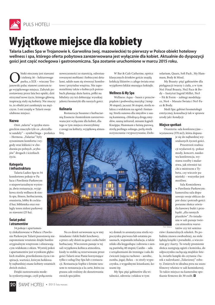 PULS HOTELI Wyjątkowe miejsce dla kobiety Talaria Ladies Spa w Trojanowie k. Garwolina (woj. mazowieckie) to pierwszy w Polsce obiekt hotelowy wellness i spa, którego oferta pobytowa zarezerwowana jest wyłącznie dla kobiet. Aktualnie do dyspozycji gości jest część noclegowa i gastronomiczna. Spa zostanie uruchomione w marcu 2015 roku. O biekt otoczony jest stawami i zielenią 16 – hektarowego parku, a XIX – wieczny Trojanowski pałac stanowi centrum tego wyjątkowego miejsca. Zabytek pozostawiony przez lata bez opieki, dziś otrzymał nowe życie, którego główną inspiracją stały się kobiety. Nie znaczy to, że obiekt jest zamknięty na mężczyzn. I oni znajdą w Talarii swoje ulubione miejsce. Nazwa Otóż „talaria” w języku starogreckim znaczyło tyle co „skrzydlate sandały” – symbol boga – posłańca – Hermesa. „Talariae” były synonimem komfortu i wygody oraz lekkości w chodzeniu po pełnych „wybojów” drogach i ścieżkach życia. nowoczesności ze starością, odrestaurowanymi meblami i kobiecymi detalami, udało nam się stworzyć komfortowe i przytulne wnętrza. Nie zapomnieliśmy także o kobiecych potrzebach planując duże lustra, półki na bibeloty czy też dobierając wysokiej jakości kosmetyki dla naszych gości. W Bar & Cafe Catherine, oprócz klasycznych drinków goście znajdą kolekcję likierów z całego świata oraz wyjątkowo lekkie musujące koktajle. Wellness & My Spa Restauracja Susanne z herbaciarnią Essencia i kominkiem zarezerwowana jest wyłącznie dla kobiet, dlatego w tym miejscu stworzyliśmy z uwagi na kobiety, wyjątkową atmosferę. Wellness: Aqua – basen z przeciwprądem i podwodną muzyką ( temp. 30 stopni), jacuzzi 36 stopni, strefa relaksu z widokiem na ogród i fontannę; Strefa sunowa dla zmysłów z sauną kamienną, chłodzącą drogą zmysłów, sauną infrared, misami kąpieli Kneippa; Hammam z łaźnią parową, strefą peelingu solnego, perłą strefa oczyszczania i wypoczywania; Zioło- Na co dzień serwowane są w niej śniadanie i lekki bufet lunchowy, a przez cały dzień na gości czeka bufet herbaciany. Wieczorem panuje w tej sali wyjątkowa kobieca atmosfera, kiedy to stoliki są rezerwowane przez gości Talarii oraz Panie korzystające tylko z usług Day Spa lub z restauracji. Restauracja Sophie z letnim tarasem to restauracja a la carte, która zaprasza całe rodziny do skosztowania swoich specjałów. wy domek to aromatyczna strefa wypoczynku pierwsza lub ostatnia po saunach, wspaniała inhalacja, a także relaks dla kręgosłupa i zdrowia z sienną parówką 40 stopni; Cardio – sala z urządzeniami do treningu i sala do ćwiczeń (zajęcia ruchowe – aerobic, zumba, joga); Relax – to strefy wypoczynku, z wygodnymi leżankami, koszami itp. My Spa: pięć gabinetów dla witalności, zdrowia i relaksu w tym Kulinaria Kategoria i infrastruktura Talaria Ladies Spa to 34 komfortowe pokoje w Pałacu i Pawilonie Parkowym o niepowtarzalnym wystroju, dwie restauracje, wyjątkowa strefa wellness & strefa spa, fitness, herbaciarnia, oranżeria, lobby & cocktail bar, biblioteka oraz rozległy teren zieleni parkowej ze stawami (25 ha). Świat pokoi i atramentów 34 pokoje i apartamenty zlokalizowane w Pałacu i Pawilonie Parkowym Talarii pozostawią niezapomniane wrażenie dzięki bardzo oryginalnym wnętrzom i olśniewającym widokom z okien. Wystrój pokoi i apartamentów jest wynikiem głębokich studiów, prześledzenia życia i inspiracji, wartości, którym hołdowały najbardziej znane kobiety ostatnich dwóch stuleci. Dzięki zastosowaniu modelu synkretycznego, czyli połączeniu 20 z 2015 luty-marzec solarium, Quarz, Soft Pack , My Hammam, Body & Mind. My Beauty: pięć gabinetów dla pielęgnacji twarzy i ciała, a w tym No1 Final Beauty, No2 Face & Body – Instytut Ingrid Millet, No3 – Fit & Form – zabiegi modelujące, No4 – Masaże Świata i No5 Face & Body. Medi Spa: gabinet kosmetologii estetycznej, konsultacji tak w sprawie urody jak i kondycji Miejsce spotkań Oranżeria: sala konferencyjno – wystawowa (370 m2), która dopasuje się do najbardziej wyszukanych życzeń gości. Przestrzeń realizacji wydarzeń tj.: pokaz mody, koncert, naukowa konferencja, wystawa rzeźby i malarstwa, jak również tai chi z mistrzem z Tybetu, czy wieczór panieński – wszystko jest możliwe. Sala Kominkowa w Pawilonie Parkowym: kameralna sala dopasowuje swoje oblicze do pór dnia i potrzeb gości: poranne słońce oświetla kawowy bufet i przekąski „dla rannych ptaszków”. Po śniadaniu w sali panuje twórcza atmosfera warszFot. Talaria tatów czy też seminariów i kameralnych szkoleń. Po południu znowu swobodniej, na stole lądują książki i poradniki, a wieczorem gry i karty. To wtedy promienie słońca zastępują ogień z kominka, do odpoczynku zachęcają miękkie fotele, światło lampki do czytania i barek z nalewkami „Talariowej” roboty. Zmierzch to idealna pora na seans filmowy właśnie w sali kominkowej. To także miejsce na kameralne spotkanie firmowe do 30 osób. R