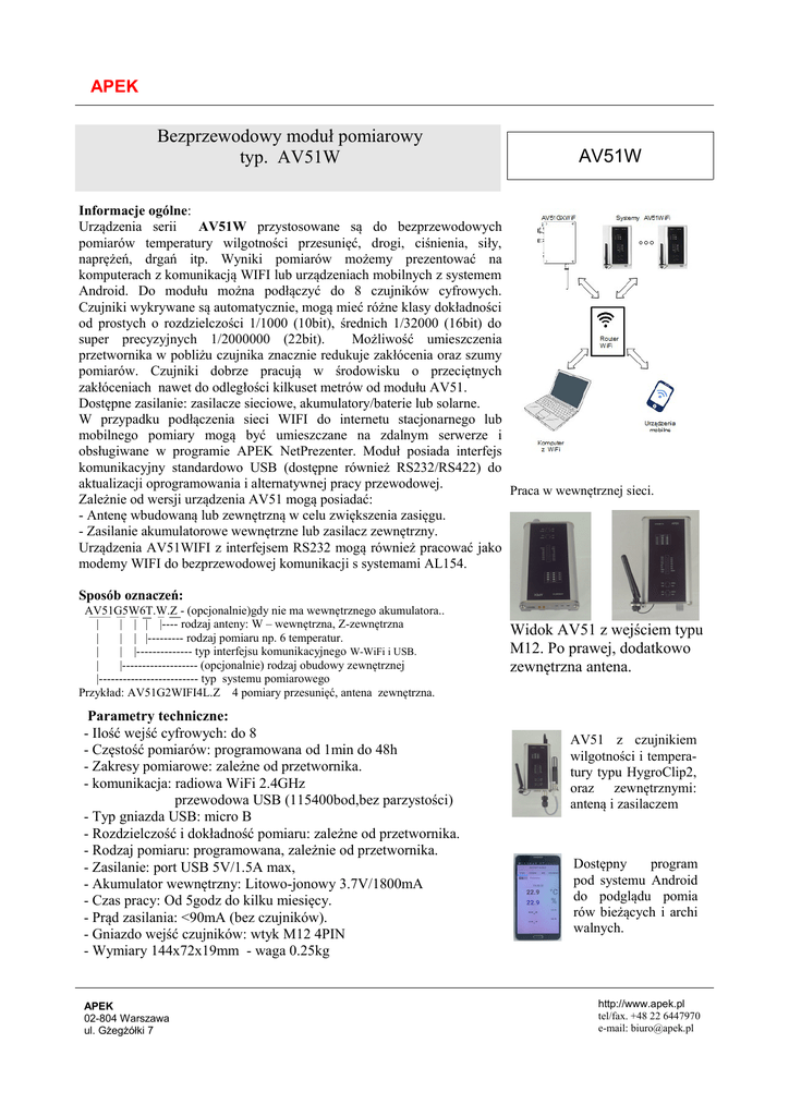 APEK Bezprzewodowy moduł pomiarowy typ. AV51W AV51W Informacje ogólne: Urządzenia serii AV51W przystosowane są do bezprzewodowych pomiarów temperatury wilgotności przesunięć, drogi, ciśnienia, siły, naprężeń, drgań itp. Wyniki pomiarów możemy prezentować na komputerach z komunikacją WIFI lub urządzeniach mobilnych z systemem Android. Do modułu można podłączyć do 8 czujników cyfrowych. Czujniki wykrywane są automatycznie, mogą mieć różne klasy dokładności od prostych o rozdzielczości 1/1000 (10bit), średnich 1/32000 (16bit) do super precyzyjnych 1/2000000 (22bit). Możliwość umieszczenia przetwornika w pobliżu czujnika znacznie redukuje zakłócenia oraz szumy pomiarów. Czujniki dobrze pracują w środowisku o przeciętnych zakłóceniach nawet do odległości kilkuset metrów od modułu AV51. Dostępne zasilanie: zasilacze sieciowe, akumulatory/baterie lub solarne. W przypadku podłączenia sieci WIFI do internetu stacjonarnego lub mobilnego pomiary mogą być umieszczane na zdalnym serwerze i obsługiwane w programie APEK NetPrezenter. Moduł posiada interfejs komunikacyjny standardowo USB (dostępne również RS232/RS422) do aktualizacji oprogramowania i alternatywnej pracy przewodowej. Praca w wewnętrznej sieci. Zależnie od wersji urządzenia AV51 mogą posiadać: - Antenę wbudowaną lub zewnętrzną w celu zwiększenia zasięgu. - Zasilanie akumulatorowe wewnętrzne lub zasilacz zewnętrzny. Urządzenia AV51WIFI z interfejsem RS232 mogą również pracować jako modemy WIFI do bezprzewodowej komunikacji s systemami AL154. Sposób oznaczeń: AV51G5W6T.W.Z - (opcjonalnie)gdy nie ma wewnętrznego akumulatora.. | | | | |---- rodzaj anteny: W – wewnętrzna, Z-zewnętrzna | | | |--------- rodzaj pomiaru np. 6 temperatur. | | |-------------- typ interfejsu komunikacyjnego W-WiFi i USB. | |------------------- (opcjonalnie) rodzaj obudowy zewnętrznej |------------------------- typ systemu pomiarowego Przykład: AV51G2WIFI4L.Z 4 pomiary przesunięć, antena zewnętrzna. Parametry techniczne: - Ilość wejść cyfrowych: do 8 - Częstość pomiarów: programowana od 1min do 48h - Zakresy pomiarowe: zależne od przetwornika. - komunikacja: radiowa WiFi 2.4GHz przewodowa USB (115400bod,bez parzystości) - Typ gniazda USB: micro B - Rozdzielczość i dokładność pomiaru: zależne od przetwornika. - Rodzaj pomiaru: programowana, zależnie od przetwornika. - Zasilanie: port USB 5V/1.5A max, - Akumulator wewnętrzny: Litowo-jonowy 3.7V/1800mA - Czas pracy: Od 5godz do kilku miesięcy. - Prąd zasilania: <90mA (bez czujników). - Gniazdo wejść czujników: wtyk M12 4PIN - Wymiary 144x72x19mm - waga 0.25kg APEK 02-804 Warszawa ul. Gżegżółki 7 Widok AV51 z wejściem typu M12. Po prawej, dodatkowo zewnętrzna antena. AV51 z czujnikiem wilgotności i temperatury typu HygroClip2, oraz zewnętrznymi: anteną i zasilaczem Dostępny program pod systemu Android do podglądu pomia rów bieżących i archi walnych. http://www.apek.pl tel/fax. +48 22 6447970 e-mail: [email protected]