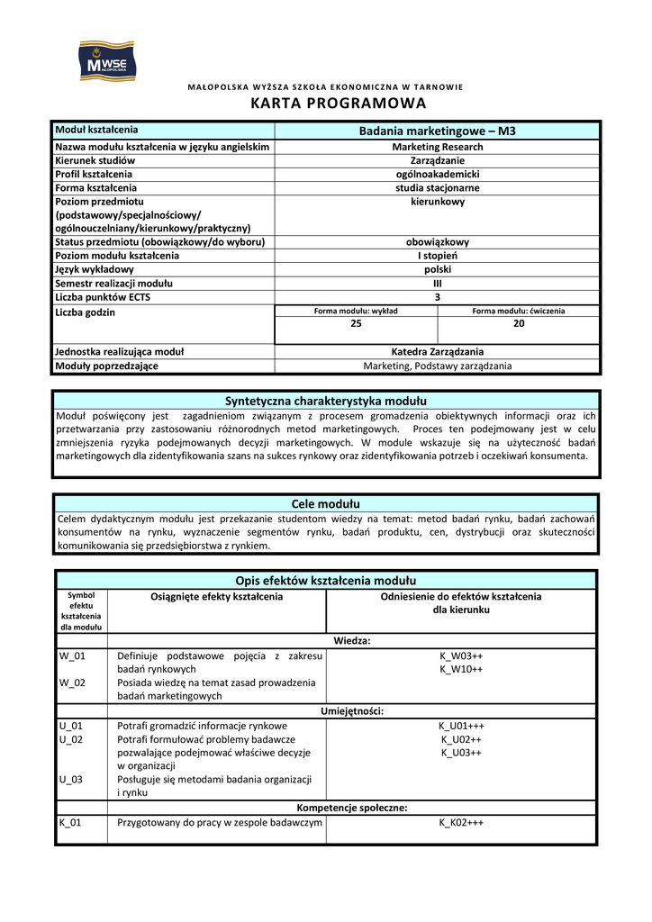 MAŁOP OLSKA WYŻSZ A SZ KOŁA E KONOMICZNA W TARN OW IE KARTA PROGRAMOWA Moduł kształcenia Badania marketingowe – M3 Nazwa modułu kształcenia w języku angielskim Kierunek studiów Profil kształcenia Forma kształcenia Poziom przedmiotu (podstawowy/specjalnościowy/ ogólnouczelniany/kierunkowy/praktyczny) Status przedmiotu (obowiązkowy/do wyboru) Poziom modułu kształcenia Język wykładowy Semestr realizacji modułu Liczba punktów ECTS Liczba godzin Marketing Research Zarządzanie ogólnoakademicki studia stacjonarne kierunkowy obowiązkowy I stopień polski III 3 Forma modułu: wykład Forma modułu: ćwiczenia 25 20 Jednostka realizująca moduł Moduły poprzedzające Katedra Zarządzania Marketing, Podstawy zarządzania Syntetyczna charakterystyka modułu Moduł poświęcony jest zagadnieniom związanym z procesem gromadzenia obiektywnych informacji oraz ich przetwarzania przy zastosowaniu różnorodnych metod marketingowych. Proces ten podejmowany jest w celu zmniejszenia ryzyka podejmowanych decyzji marketingowych. W module wskazuje się na użyteczność badań marketingowych dla zidentyfikowania szans na sukces rynkowy oraz zidentyfikowania potrzeb i oczekiwań konsumenta. Cele modułu Celem dydaktycznym modułu jest przekazanie studentom wiedzy na temat: metod badań rynku, badań zachowań konsumentów na rynku, wyznaczenie segmentów rynku, badań produktu, cen, dystrybucji oraz skuteczności komunikowania się przedsiębiorstwa z rynkiem. Opis efektów kształcenia modułu Symbol efektu kształcenia dla modułu W_01 W_02 U_01 U_02 U_03 K_01 Osiągnięte efekty kształcenia Odniesienie do efektów kształcenia dla kierunku Wiedza: Definiuje podstawowe pojęcia z zakresu badań rynkowych Posiada wiedzę na temat zasad prowadzenia badań marketingowych Umiejętności: Potrafi gromadzić informacje rynkowe Potrafi formułować problemy badawcze pozwalające podejmować właściwe decyzje w organizacji Posługuje się metodami badania organizacji i rynku Kompetencje społeczne: Przygotowany do pracy w zespole badawczym K_W03++ K_W10++ K_U01+++ K_U02++ K_U03++ K_K02+++ Treści kształcenia modułu Forma modułu: wykład 1. Pojęcie i znaczenie badań marketingowych 2. Etapy badań marketingowych 3. Metody gromadzenia danych 4. Badania zachowań konsumentów 5. Wyznaczanie segmentacji rynku 6. Badania produktu 7. Badania cen 8. Badania systemu dystrybucji 9. Badania skuteczności systemu komunikacji 10. Organizacja badań marketingowych Literatura podstawowa Literatura uzupełniająca 1. 2. 3. 1. 2. 3. 1. 2. 3. 4. 5. 6. Forma modułu: ćwiczenia Etapy procesu badawczego. Metody doboru próby wykorzystywane w badaniach marketingowych. Zasady konstrukcji narzędzi pomiarowych – przykłady. Zastosowanie technik projekcyjnych w badaniach marketingowych. Analiza i interpretacja danych – studium przypadku. Opracowanie raportu z badań – prezentacja zasad konstrukcji raportu na wybranych przykładach. Kaczmarczyk S., Badania marketingowe, PWE, Warszawa 2011 Kaden R.J. , Badania marketingowe, PWE, Warszawa 2008 Badania marketingowe, red. K. Mazurek-Łopacińska, Wyd. PWN, Warszawa 2005 Kaczmarczyk S., Zastosowanie badań marketingowych, PWE, Warszawa 2007 Badania marketingowe, red. D. Maison, A. Noga-Bogomilski, Gdańskie Wydawnictwo Psychologiczne, Gdańsk 2007 Kędzior Z., Karcz K., Badania marketingowe w praktyce, PWE, Warszawa 2007 Metody dydaktyczne Wykład Ćwiczenia Opracowanie raportu projektu Krytyczna dyskusja wyników realizacji projektu z prowadzącym ćwiczenia Prezentacja projektu Egzamin w formie pisemnej