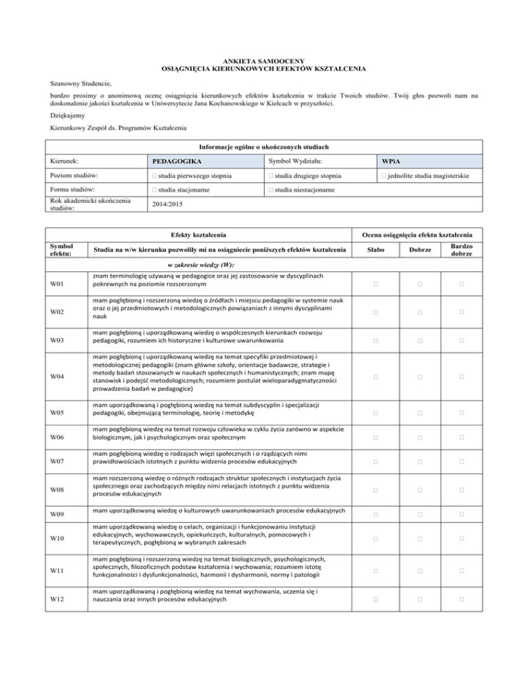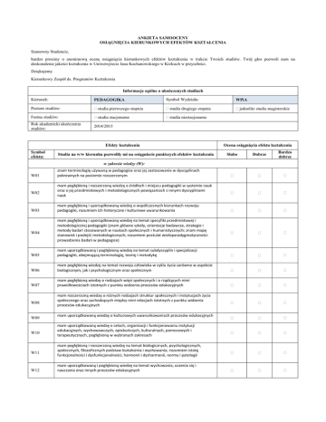 ANKIETA SAMOOCENY OSIĄGNIĘCIA KIERUNKOWYCH EFEKTÓW KSZTAŁCENIA Szanowny Studencie, bardzo prosimy o anonimową ocenę osiągnięcia kierunkowych efektów kształcenia w trakcie Twoich studiów. Twój głos pozwoli nam na doskonalenie jakości kształcenia w Uniwersytecie Jana Kochanowskiego w Kielcach w przyszłości. Dziękujemy Kierunkowy Zespół ds. Programów Kształcenia Informacje ogólne o ukończonych studiach Kierunek: PEDAGOGIKA Symbol Wydziału: Poziom studiów: studia pierwszego stopnia studia drugiego stopnia Forma studiów: studia stacjonarne studia niestacjonarne Rok akademicki ukończenia studiów: jednolite studia magisterskie 2014/2015 Efekty kształcenia Symbol efektu: WPiA Studia na w/w kierunku pozwoliły mi na osiągniecie poniższych efektów kształcenia Ocena osiągnięcia efektu kształcenia Słabo Dobrze Bardzo dobrze w zakresie wiedzy (W): W01 W02 W03 W04 znam terminologię używaną w pedagogice oraz jej zastosowanie w dyscyplinach pokrewnych na poziomie rozszerzonym mam pogłębioną i rozszerzoną wiedzę o źródłach i miejscu pedagogiki w systemie nauk oraz o jej przedmiotowych i metodologicznych powiązaniach z innymi dyscyplinami nauk mam pogłębioną i uporządkowaną wiedzę o współczesnych kierunkach rozwoju pedagogiki, rozumiem ich historyczne i kulturowe uwarunkowania mam pogłębioną i uporządkowaną wiedzę na temat specyfiki przedmiotowej i metodologicznej pedagogiki (znam główne szkoły, orientacje badawcze, strategie i metody badań stosowanych w naukach społecznych i humanistycznych; znam mapę stanowisk i podejść metodologicznych; rozumiem postulat wieloparadygmatyczności prowadzenia badań w pedagogice) W05 mam uporządkowaną i pogłębioną wiedzę na temat subdyscyplin i specjalizacji pedagogiki, obejmującą terminologię, teorię i metodykę W06 mam pogłębioną wiedzę na temat rozwoju człowieka w cyklu życia zarówno w aspekcie biologicznym, jak i psychologicznym oraz społecznym W07 mam pogłębioną wiedzę o rodzajach więzi społecznych i o rządzących nimi prawidłowościach istotnych z punktu widzenia procesów edukacyjnych W08 W09 W10 W11 W12 mam rozszerzoną wiedzę o różnych rodzajach struktur społecznych i instytucjach życia społecznego oraz zachodzących między nimi relacjach istotnych z punktu widzenia procesów edukacyjnych mam uporządkowaną wiedzę o kulturowych uwarunkowaniach procesów edukacyjnych mam uporządkowaną wiedzę o celach, organizacji i funkcjonowaniu instytucji edukacyjnych, wychowawczych, opiekuńczych, kulturalnych, pomocowych i terapeutycznych, pogłębioną w wybranych zakresach mam pogłębioną i rozszerzoną wiedzę na temat biologicznych, psychologicznych, społecznych, filozoficznych podstaw kształcenia i wychowania; rozumiem istotę funkcjonalności i dysfunkcjonalności, harmonii i dysharmonii, normy i patologii mam uporządkowaną i pogłębioną wiedzę na temat wychowania, uczenia się i nauczania oraz innych procesów edukacyjnych W13 mam pogłębioną i uporządkowaną wiedzę o różnych środowiskach wychowawczych, ich specyfice i procesach w nich zachodzących W14 mam uporządkowaną wiedzę o strukturze i funkcjach systemu edukacji, znam wybrane systemy edukacyjne innych krajów W15 W16 W17 mam uporządkowaną wiedzę o uczestnikach działalności edukacyjnej, wychowawczej, opiekuńczej, kulturalnej, pomocowej i terapeutycznej, pogłębioną w wybranych zakresach mam uporządkowaną wiedzę na temat zasad i norm etycznych oraz etyki zawodowej mam uporządkowana wiedzę na temat kształcenia ustawicznego i rozwoju kariery zawodowej w zakresie umiejętności (U): U01 U02 U03 U04 U05 U06 U07 U08 U09 U10 U11 U12 posiadam pogłębione umiejętności obserwowania, wyszukiwania i przetwarzania informacji na temat różnorodnych zjawisk społecznych, przy użyciu różnych źródeł oraz interpretowania ich z punktu widzenia problemów edukacyjnych potrafię wykorzystywać i integrować wiedzę teoretyczną z zakresu pedagogiki oraz powiązanych z nią dyscyplin w celu analizy złożonych problemów edukacyjnych, wychowawczych, opiekuńczych, kulturalnych, pomocowych i terapeutycznych, a także diagnozowania i projektowania działań praktycznych potrafię sprawnie porozumiewać się przy użyciu różnych kanałów i technik komunikacyjnych ze specjalistami w zakresie pedagogiki, jak i z odbiorcami spoza grona specjalistów, korzystając z nowoczesnych rozwiązań technologicznych potrafię w sposób klarowny, spójny i precyzyjny wypowiadać się w mowie i na piśmie, posiada umiejętność konstruowania rozbudowanych ustnych i pisemnych uzasadnień na tematy dotyczące różnych zagadnień pedagogicznych z wykorzystaniem różnych ujęć teoretycznych, korzystając zarówno z dorobku pedagogiki, jak i innych dyscyplin naukowych posiadam pogłębione umiejętności prezentowania własnych pomysłów, wątpliwości i sugestii, popierania ich rozbudowaną argumentacją w kontekście wybranych perspektyw teoretycznych, poglądów różnych autorów, kierując się przy tym zasadami etycznymi posiadam rozwinięte umiejętności badawcze: rozróżnia orientacje w metodologii badań pedagogicznych, formułuje problemy badawcze, dobiera adekwatne metody, techniki i konstruuje narzędzia badawcze; opracowuję, prezentuję i interpretuję wyniki badań, wyciągam wnioski, wskazuję kierunki dalszych badań, w obrębie wybranej subdyscypliny pedagogiki mam pogłębione umiejętności obserwowania, diagnozowania, racjonalnego oceniania złożonych sytuacji edukacyjnych oraz analizowania motywów i wzorów ludzkich zachowań potrafię sprawnie posługiwać się wybranymi ujęciami teoretycznymi w celu analizowania podejmowanych działań praktycznych potrafię generować oryginalne rozwiązania złożonych problemów pedagogicznych i prognozować przebieg ich rozwiązywania oraz przewidywać skutki planowanych działań w określonych obszarach praktycznych potrafię wybra