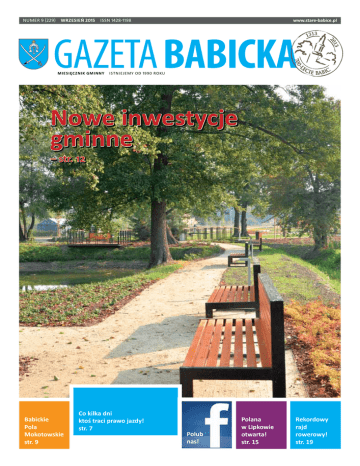 Numer 9 (229) wrzesIEŃ 2015 ISSN 1428-1198 www.stare-babice.pl Miesięcznik Gminny istniejemy od 1990 roku Nowe inwestycje gminne – str. 12 Babickie Pola Mokotowskie str. 9 Co kilka dni ktoś traci prawo jazdy! str. 7 Polub nas! Polana w Lipkowie otwarta! str. 15 Rekordowy rajd rowerowy! str. 19 ↓ w numerze na okładce fot. Jacek Kłopotowski gmina, urząd, teren 3 Szkoła z tradycjami i świetnymi wynikami Informacja dotycząca ulicy Lutosławskiego Z Sesji Rady Gminy Delegacja z Gruzji odwiedziła naszą gminę. Będą wspólne projekty? 5 6 bezpieczna gmina 7 8 Co kilka dni ktoś traci prawo jazdy! Zawsze potrzeba trochę rozsądku… dla mieszkańca 9 Babickie Pola Mokotowskie 10 Zwierzęta przewidują (przepowiadają) nadchodzące katastrofy cz. 2 KULTURA 11 Krzyżówka babicka Nr 5 Porozmawiajmy o seniorach wydarzenia 12 14 15 Inwestycje gminne Klaudyniada 2015 Zajęcia sportowe dla najmłodszych Polana w Lipkowie otwarta! KULTURA 16 Z życia organizacji pozarządowych sport 17 Stajnia Zielonki zorganizowała zawody regionalne! 19. Mistrzostwa Europy w Carrom 2015 18 Gminne Przedsiębiorstwo Komunalne „Eko-Babice” mocno zakorzenione w branży (…) 19 Mamy mistrza – relacja z V Samolotowych Mistrzostw Polski Rekorodowy rajd rowerowy Ostatnie GP w siatkówce rozegrane informacje 21 Ogłoszenia gminne i inne aktualności Szczepienia dla seniorów Serdecznie zapraszamy mieszkańców Gminy Stare Babice powyżej 65 roku życia na szczepienia profilaktyczne przeciwko grypie wykonywane w ramach realizacji „Programu bezpłatnych szczepień profilaktycznych przeciwko grypie dla mieszkańców Gminy Stare Babice powyżej 65 roku życia na lata 2012-2016”. Szczepienia będą wykonywane od 10 września 2015 r. do 15 grudnia 2015 r. w: NZOZ Medicor w Borzęcinie Dużym i NZOZ ARNICA w Starych Babicach. Stare Babice Biegają! Zampraszamy na cotygodniowe, otwarte spotkania biegowe w Starych Babicach! Celem inicjatywy Stare Babice Biegają jest zainteresowanie bieganiem jak największej liczby mieszkańców z naszych okolic. Zapraszamy w każdą środę o godz. 19.00 na bieżnię przy szkole podstawowej w Starych Babicach. Więcej informacji str. 20. Przedsiębiorcy! W Warszawskim Centrum Przedsiębiorczości Smolna odbywają się cykliczne, bezpłatne szkolenia dla przedsiębiorców, osób chcących założyć działalność gospodarczą i wszystkich zainteresowanych tematami. Szczegóły na stronie: http://www.firma.um.warszawa.pl. Konkurs plastyczny dla najmłodszych Tematyka pracy musi nawiązywać do hasła przewodniego konkursu „Zdrowe Odżywianie – Zdrowe Dzieci”. Praca konkursowa może być wykonana dowolną techniką plastyczną (rysowanie, malowanie, wyklejanie, wydzieranie itp.), w formacie A4, w układzie poziomym lub pionowym. Uczestnikami Konkursu mogą być wyłącznie (za pośrednictwem swojej szkoły/przedszkola) dzieci uczęszczające do placówek położonych na obszarze województwa mazowieckiego, w dwóch kategoriach: I kategoria – dzieci uczęszczające do przedszkoli i II kategoria – dzieci uczęszczające do klas 0-3 szkół podstawowych. Termin zgłaszania prac do 16.10.2015 r. Organizatorem Konkursu jest Agencja Rynku Rolnego w Warszawie. Kampinoskie Spotkania Jeździeckie dla całej rodziny! W dniach 3-4 października w Stajni Zielonki przy ul. Warszawskiej 452 odbędzie się kolejna impreza z cyklu Kampinoskich Spotkań Jeździeckich. Kampinoskie Spotkania Jeździeckie to cykliczna impreza: sportowa, rodzinna, edukacyjna łącząca towarzyskie zawody jeździeckie z piknikiem. KSJ mają przybliżyć i spopularyzować jazdę konną, jako formę rekreacji ruchowej oraz stworzyć możliwość pierwszych startów w zawodach sportowych początkującym zawodnikom. www.ksj.waw.pl Chcesz być na bieżąco? Zapisz się do gminnego newslettera! Możesz to zrobić na stronie www.stare-babice.pl lub w Urzędzie Gminy Stare Babice w Referacie Rozwoju i Promocji Gminy. Zapraszamy! Ruszyła Szlachetna Paczka w rejonie Stare Babice i okolice. Jeśli masz w sobie chęć pomagania i kochasz ludzi, dołącz do drużyny Szlachetnej Paczki (Stare Babice + Izabelin) jako wolontariusz. Już dziś zgłoś się na www.superW.pl. Kontakt z liderką Projektu z naszego terenu, Joanną Trojak: [email protected], www.facebook.com/SzlachetnaPaczkaStareBabice. Chcesz być na bieżąco? Zapisz się do gminnego newslettera! Możesz to zrobić na stronie www.stare-babice.pl lub w Urzędzie Gminy Stare Babice w Referacie Rozwoju i Promocji Gminy. Zapraszamy! redakcja adres redakcji: 05-082 Stare Babice, ul. Rynek 32, tel.: 22 730 80 30, 798 944 982 [email protected] wydawca: Urząd Gminy Stare Babice, ul. Rynek 32 , 05-082 Stare Babice zespół redakcyjny: Jolanta Pieńkowska, Malwina Fabianowicz projekt graficzny: woznkt.com skład i druk: OMIKRON Sp. z o.o. www.omikron.net.pl 2 gazeta babicka wrzesIEŃ 2015 gmina, urząd, teren Szkoła z tradycjami i świetnymi wynikami Szkoła Podstawowa im. Armii Krajowej Grupy „Kampinos” w Borzęcinie Dużym od wielu lat działa w Zespole Szkolno-Przedszkolnym. W roku bieżącym mija 80 lat, odkąd Rada Gminy Ożarów (w 1935 r.) podjęła uchwałę o konieczności budowy szkoły w tym miejscu, i 20 lat, odkąd Rada Pedagogiczna placówki podjęła uchwałę o nadaniu szkole imienia. Borzęcińska szkoła z małej trzyklasowej wiejskiej szkółki przerodziła się stopniowo w nowoczesny ośrodek edukacyjny z halą sportową i zespołem boisk ze sztuczną nawierzchnią. Jest tu także pełnowymiarowe boisko piłkarskie. Szkoła Podstawowa w Borzęcinie Dużym razem ze Szkołą Podstawową w Starych Babicach zapewniły naszej gminie 13. miejsce wśród 2478 gmin w Polsce w rankingu poziomu nauczania.O rozmowę poprosiliśmy Beatę Błaszczak, Dyrektora ZSP w Borzęcinie Dużym. – Nie ma pomyłki, rzeczywiście szkołę w Borzęcinie założyli nam sąsiedzi z Ożarowa? – To prawda, ale pamiętajmy że 80 lat temu mieliśmy zupełnie inne 