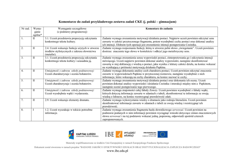 Komentarze do zadań przykładowego zestawu zadań CKE (j. polski – gimnazjum) Nr zad. Wymaganie szczegółowe (z podstawy programowej) 1. Wymaganie ogólne* II 2. II 3. II 4. II Umiejętność z zakresu szkoły podstawowej: Uczeń charakteryzuje i ocenia bohaterów. 5. II Umiejętność z zakresu szkoły podstawowej: Uczeń charakteryzuje i ocenia bohaterów. 6. II Umiejętność z zakresu szkoły podstawowej: Uczeń wyodrębnia wątki i wydarzenia. 7. II 2.9. Uczeń wskazuje elementy dramatu. 8. I 1.2. Uczeń wyszukuje w tekście potrzebne informacje. 3.1. Uczeń przedstawia propozycję odczytania konkretnego tekstu kultury. 2.4. Uczeń wskazuje funkcje użytych w utworze środków stylistycznych z zakresu słownictwa (metafor). 3.1. Uczeń przedstawia propozycję odczytania konkretnego tekstu kultury i uzasadnia ją. Komentarz do zadania Zadanie wymaga zrozumienia motywacji działania postaci. Najpierw uczeń powinien odczytać sens zawarty w całości przytoczonego fragmentu, potem wyodrębnić cechy postaci oraz dokonać analizy ich intencji. Efektem tych operacji jest zrozumienie intencji postępowania Cześnika. Zadanie wymaga rozpoznania funkcji, którą w utworze pełni słowo „świegotanie”. Uczeń powinien dostrzec znaczenie tego słowa w kontekście i odkryć jego metaforyczny sens. Zadanie wymaga zrozumienia sensu wypowiedzi postaci, zinterpretowania go i odczytania intencji mówiącego. Uczeń najpierw powinien dokonać analizy wypowiedzi, następnie skonfrontować zawartą w niej deklarację z wiedzą o postaci, jaka wynika z lektury całości dzieła, na koniec wskazać na wynikającą z próżności motywację działania Papkina. Zadanie wymaga dokonania analizy cech charakteru postaci. Uczeń powinien odczytać znaczenia zawarte w wypowiedziach Papkina w przytoczonej rozmowie, następnie wyodrębnić z nich informacje, które wskazują na cechy charakteru, na koniec nazwać te cechy. Zadanie wymaga zrozumienia motywacji działania postaci oraz dokonania ich oceny. Uczeń powinien dokonać analizy wypowiedzi i działania Cześnika i interakcji między nim a Papkinem, następnie ocenić postępowanie tego pierwszego. Zadanie wymaga znajomości całej fabuły Zemsty. Uczeń powinien wyodrębnić z fabuły wątki, których dotyczą informacje zawarte w zdaniach z tabeli, skonfrontować te informacje ze swoją wiedzą o lekturze, na koniec rozstrzygnąć prawdziwość zdań. Zadanie wymaga wykorzystania wiedzy o dramacie jako rodzaju literackim. Uczeń powinien skonfrontować informacje zawarte w zdaniach z tabeli ze swoją wiedzą i rozstrzygnąć ich prawdziwość. Zadanie wymaga zrozumienia fragmentu hasła słownikowego serwować. Uczeń powinien na podstawie podanych w nim informacji powinien wyciągnąć wnioski dotyczące zmian znaczeniowych słowa serwować i na tej podstawie wskazać jedną, poprawną, odpowiedź spośród czterech zaproponowanych. Materiały współfinansowane ze środków Unii Europejskiej w ramach Europejskiego Funduszu Społecznego Dokument został stworzona w ramach projektu "BADANIE JAKOŚCI I EFEKTYWNOŚCI EDUKACJI ORAZ INSTYTUCJONALIZACJA ZAPLECZA BADAWCZEGO" www.ibe.edu.pl 9. I 1.7. Uczeń rozpoznaje intencje wypowiedzi. 10. I 1.2. Uczeń wyszukuje w wypowiedzi potrzebne informacje. III 11. I 12. I 2.2. Uczeń sprawnie posługuje się nieoficjalną odmianą polszczyzny. Zadanie wymaga zrozumienia treści i intencji komentarza autorskiego, wplecionego w hasło słownikowe. Jest to możliwe tylko wtedy, gdy się uwzględni informacje merytoryczne przedstawione w całym haśle słownikowym. Uczeń powinien wskazać jedną, poprawną, odpowiedź spośród czterech zaproponowanych. Zadanie wymaga zrozumienia cytowanego wcześniej hasła słownikowego, zrozumienia zawartego w nim komentarza autorskiego oraz zastosowania wskazówek dotyczących poprawności językowej, przedstawionych w haśle słownikowym i w komentarzu autorskim, do oceny trzech podanych zdań. Każde zdanie zawiera czasownik serwować, lecz nie wszystkie użycia są zgodne z wzorcową normą językową, skodyfikowaną w słownikach. Uczeń powinien przy każdym zdaniu określić, czy użyto w nim czasownika serwować zgodnie z normą wzorcową, czy nie. Zadanie wymaga przeanalizowania cytowanego wcześniej hasła słownikowego. Uczeń powinien wyciągnąć wnioski dotyczące istoty zmian znaczeniowych i sposobów kodyfikacji tych zmian w wydawnictwach poprawnościowych. Zadanie wymaga rozpoznania sytuacji komunikacyjnej reprezentowanej przez cytowany tekst (list do rówieśnika) oraz środków językowych właściwych tej sytuacji (styl potoczny). W poleceniu 1. uczeń powinien wypełnić puste miejsca wybranymi przez siebie wyrazami lub sformułowaniami, charakterystycznymi dla stylu potocznego. Odpowiedzi do wyboru zostały podane zgodnie z numeracją luk w tekście. Uczeń powinien w każdym wypadku określić, czy lukę można wypełnić tylko jedną z zaproponowanych odpowiedzi (A albo B), czy obiema. W poleceniu 2. uczeń powinien wskazać jedną, poprawną, odpowiedź spośród czterech zaproponowanych, wskazującą na kryterium doboru odpowiedzi z polecenia 1. 2.1. Uczeń rozróżnia normę językową wzorcową oraz użytkową i stosuje się do nich. Umiejętność z zakresu szkoły podstawowej: Uczeń wyciąga wnioski z przesłanek zawartych w tekście . 3.1. Uczeń rozpoznaje styl potoczny. III 1.7. Uczeń wie, w jaki sposób zwracać się do rozmówcy w zależności od sytuacji i relacji łączącej go z osobą, do której mówi (rówieśnik). 13. I 1.2. Uczeń wyszukuje w tekście potrzebne informacje. Zadanie wymaga wyszukania w tekście potrzebnej informacji. Uczeń po lekturze całości tekstu powinien znaleźć fragment, w którym znajdzie informację zawierającą odpowiedź na zdane pytanie. 14. I 15. I Umiejętność z zakresu szkoły podstawowej: Uczeń rozumie przenośne znaczenie wyrazów w wypowiedzi. Umiejętność z zakresu szkoły podstawowej: Uc