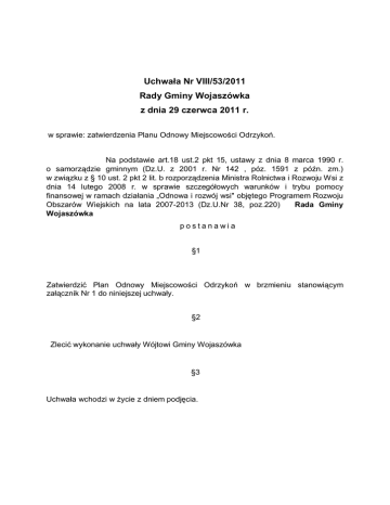 Uchwała Nr VIII/53/2011 Rady Gminy Wojaszówka z dnia 29 czerwca 2011 r. w sprawie: zatwierdzenia Planu Odnowy Miejscowości Odrzykoń. Na podstawie art.18 ust.2 pkt 15, ustawy z dnia 8 marca 1990 r. o samorządzie gminnym (Dz.U. z 2001 r. Nr 142 , póz. 1591 z późn. zm.) w związku z § 10 ust. 2 pkt 2 lit. b rozporządzenia Ministra Rolnictwa i Rozwoju Wsi z dnia 14 lutego 2008 r. w sprawie szczegółowych warunków i trybu pomocy finansowej w ramach działania „Odnowa i rozwój wsi" objętego Programem Rozwoju Obszarów Wiejskich na lata 2007-2013 (Dz.U.Nr 38, poz.220) Rada Gminy Wojaszówka postanawia §1 Zatwierdzić Plan Odnowy Miejscowości Odrzykoń w brzmieniu stanowiącym załącznik Nr 1 do niniejszej uchwały. §2 Zlecić wykonanie uchwały Wójtowi Gminy Wojaszówka §3 Uchwała wchodzi w życie z dniem podjęcia. Plan Odnowy Miejscowości Odrzykoń Załącznik do Uchwały nr VIII/53/2011 Rady Gminy Wojaszówka z dnia 29 czerwca 2011 r. Plan Odnowy Miejscowości Odrzykoń Gmina Wojaszówka Odrzykoń, 2011 r. 2 Plan Odnowy Miejscowości Odrzykoń Spis treści 1. CHARAKTERYSTYKA MIEJSCOWOŚCI ...................................................................................... 4 1.1. 2. PODSTAWOWE INFORMACJE ............................................................................................................ 4 1.1.1. Lokalizacja ........................................................................................................................... 4 1.1.2. Historia Odrzykonia.............................................................................................................. 6 1.1.3. Klimat ................................................................................................................................... 6 INWENTARYZACJA ZASOBÓW SŁUŻĄCA ODNOWIE MIEJSCOWOŚCI .............................. 8 2.2.1. Demografia........................................................................................................................... 8 2.2.2. Bezrobocie ............................................................................................................................ 9 2.2.3. Rolnictwo i Gospodarka ...................................................................................................... 11 2.2.4. Infrastruktura na terenie miejscowości Odrzykoń................................................................. 13 Komunikacja ....................................................................................................................................... 13 Zaopatrzenie w wodę ........................................................................................................................... 14 Kanalizacja sanitarna .......................................................................................................................... 14 Gospodarka odpadami ......................................................................................................................... 14 Sieć gazowa ......................................................................................................................................... 14 Sieć telekomunikacyjna ........................................................................................................................ 15 Sieć ciepłownicza................................................................................................................................. 15 2.2.5. Atrakcyjność turystyczna miejscowości Odrzykoń ................................................................ 15 Zabytki ................................................................................................................................................ 15 Muzeum Wsi w Odrzykoniu .................................................................................................................. 17 Walory przyrodniczo krajobrazowe ...................................................................................................... 17 2.2.6. Strefa społeczna na terenie Miejscowości Odrzykoń............................................................. 17 Biblioteka ............................................................................................................................................ 18 Placówki kulturotwórcze i działalność kulturalna ................................................................................. 18 Oświata ............................................................................................................................................... 19 Sport ................................................................................................................................................... 19 Służba zdrowia .................................................................................................................................... 19 Opieka społeczna ................................................................................................................................. 20 Bezpieczeństwo publiczne .................................................................................................................... 20 2.2.7. Identyfikacja występujących problemów ............................................................................. 20 2.2.8. Inwentaryzacja zasobów – układ tabelaryczny ..................................................................... 21 3. OCENA MOCNYCH I SŁABYCH STRON WSI ODRZYKOŃ - ANALIZA SWOT .................... 26 4. OPIS I CHARAKTERYSTYKA OBSZARÓW O SZCZEGÓLNYM ZNACZENIU DLA ZASPAKAJANIA POTRZEB MIESZKAŃCÓW, SPRZYJAJĄCYCH NAWIĄZYWANIU 1 Plan Odnowy Miejscowości Odrzykoń KONTAKTÓW SPOŁECZNYCH ZE WZGLĘDU NA ICH POŁOŻENIE ORAZ CECHY FUNKCJONALNO - PRZESTRZENNE .................................................................................................. 30 5. OPIS PLANOWANYCH ZADAŃ W LATACH 2011-2017 NA TERENIE MIEJSCOWOŚCI ODRZ