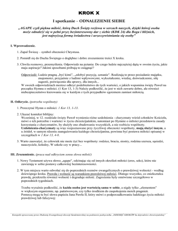 KROK X I spotkanie – ODNALEZIENIE SIEBIE „AGAPE czyli piękna miłość, którą Duch Święty rozlewa w sercach naszych, dzięki której osoba może odnaleźć się w pełni przez bezinteresowny dar z siebie (KDK 24) dla Boga i bliźnich, jest najwyższą formą świadectwa i urzeczywistniania się osoby” I. Wprowadzenie. 1. Zapal Świecę – symbol obecności Chrystusa. 2. Pomódl się do Ducha Świętego o dogłębne i dobre zrozumienie treści X kroku. 3. Chwila rozmowy, przemyślenia. Odpowiedz na pytania: Do czego ludzie najczęściej dążą w swoim życiu, jakie maja aspiracje? Jakimi sposobami próbują to osiągnąć? Odpowiedź: Ludzie pragną „być kimś”, „zdobyć pozycję, uznanie”. Realizują to przez posiadanie majątku, znajomości, przyjaźnie z ludźmi wpływowymi, wykształcenie, wiedzę, doświadczenie, siłę sugestii, poświęcenie dla sprawy, dla innych... W swoich odpowiedziach możesz odkryć podobieństwo do tych wartości, o jakich wspomina święty Paweł na początku Hymnu o miłości. (1 Kor 13, 1-3) Należy podkreślić, że jest w nich zawarte dobro, ale również niebezpieczeństwo kierowania się w każdym z tych przypadków egoizmem zamiast miłością. II. Odkrycie. (potrzeba wspólnoty) 1. Przeczytać Hymn o miłości: 1 Kor 13, 1-13. 2. Ukazać kontekst biblijny: Wcześniej, w 12. rozdziale święty Paweł wymienia różne uzdolnienia - charyzmaty wśród członków Kościoła, mówi o ich potrzebie i wartości w życiu chrześcijańskim, natomiast po Hymnie o miłości przedstawia zasady korzystania z charyzmatów, by służyły one zbudowaniu wszystkich, a nie rozbiciu wspólnoty. Uzdolnienia-charyzmaty są więc rozpoznawane przy życzliwej obecności wspólnoty, mają służyć innym, a u źródeł, w samym rdzeniu zaangażowania każdego chrześcijanina, powinna być postawa miłości opisanej w szczegółach w 1 Kor 13, 4-8. 3. Warto zauważyć, że człowiek nie może żyć bez wspólnoty: rodzice, bracia, siostry, rodzina szersza, sąsiedzi, nauczyciele, koledzy, W szkole czy w pracy... III. Zrozumienie. (praca nad odkryciem sensu słowa miłość) 1. Nowy Testament używa słowa „agape", odcinając się od innych określeń miłości (eros, seks), które nie zawierają w sobie postawy całkowitej bezinteresowności. 2. W tym miejscu warto odwołać się do poprzednich rozmów ewangelicznych o prawdziwej wolności - według dziewiątego kroku. Prawda i wolność są warunkiem prawdziwej miłości. Dlatego wszystko, co zniekształca prawdę, przekreśla również wolność i degraduje miłość. Zagrożenia były omówione szczegółowo w poprzednich tygodniach. Trzeba wyraźnie podkreślić, że każda osoba jest wartością sama w sobie, a nigdy tylko „elementem” w większym organizmie, np. państwowym, czy tylko środkiem do zaspokojenia moich pragnień. Pomocą mogą tu być słowa papieża Jana Pawła II, który mówi o podporzadkowaniu ludzkiego życia miłości prawdziwej lub fałszywej: Konspekt opracowany przez Diakonię Ewangelizacji diecezji Sandomierskiej na podstawie podręcznika „DZIESIĘĆ KROKÓW ku dojrzałości chrześcijańskiej” Myślą przewodnią całej nauki społecznej Kościoła jest poprawna koncepcja osoby ludzkiej, jej niepowtarzalnej wartości, płynącej stąd, że człowiek jest „jedynym na ziemi stworzeniem, którego Bóg chciał dla niego samego". (Encyklika „Centesimus annus" nr 11) Zasadniczy błąd kryje się w koncepcji ludzkiej wolności oderwanej od posłuszeństwa prawdzie, a zatem również od obowiązku poznawania praw innych ludzi. Treścią wolności staje się wówczas miłość samego siebie posunięta aż do wzgardzenia Bogiem i bliźnim. (...) Wolność jednak w pełni jest dowartościowana jedynie poprzez przyjęcie prawdy: w świecie bez prawdy wolność traci swoją treść, a człowiek zostaje wystawiony na pastwę namiętności i uwarunkowań jawnych lub ukrytych. (jw. nr 17, 46) Odwoływanie się bezpośrednio do jego [człowieka] instynktów i ignorowanie na różne sposoby jego wolnej i świadomej natury osobowej może prowadzić do wytworzenia nawyków konsumpcyjnych i stylów życia obiektywnie niegodziwych lub szkodliwych dla fizycznego i duchowego zdrowia. (jw. nr 36) Pragnienie, by żyć lepiej, nie jest niczym złym, ale błędem jest styl życia, który wyżej stawia dążenie do tego, by mieć, aniżeli być, i chce więcej mieć nie po to, by bardziej być, lecz by doznawać w życiu jak najwięcej przyjemności. (jw. nr 36) Alienacja polega na odwróceniu relacji środków i celów: człowiek nie uznając wartości i wielkości osoby w samym sobie i w bliźnim, pozbawia się możliwości przeżycia w pełni własnego człowieczeństwa i nawiązania tej relacji solidarności i wspólnoty z innymi ludźmi, dla której został stworzony przez Boga. Człowiek bo-wiem staje się naprawdę sobą poprzez wolny dar z siebie samego. (...) Wyobcowany jest zatem taki człowiek, który nie chce wyjść poza samego siebie, uczynić z siebie daru ani stworzyć autentycznej ludzkiej wspólnoty. (...) Człowiek, który troszczy się wyłącznie albo głównie o to, by mieć i używać, niezdolny już do opanowywania własnych instynktów i namiętności oraz do podporządkowywania ich sobie przez posłuszeństwo prawdzie, nie może być wolny. (jw. nr 41) 3. Istotę miłości chrześcijańskiej dobrze oddali Ojcowie Soboru Watykańskiego II: Bóg troszczący się po ojcowsku o wszystko chciał, by wszyscy ludzie tworzyli jedną rodzinę i odnosili się wzajemnie do siebie w duchu braterskim. Wszyscy bowiem, stworzeni na obraz Boga, który ,,z jednego uczynił cały rodzaj ludzki, aby zamieszkał cały obszar ziemi" (Dz 17, 26), powołani są do jednego i tego samego celu, to jest do Boga samego. Dlatego to miłość Boga i bliźniego jest pierwszym i najważniejszym przykazaniem. Pismo święte zaś poucza nas, że miłości Boga nie można odłączyć od miłości