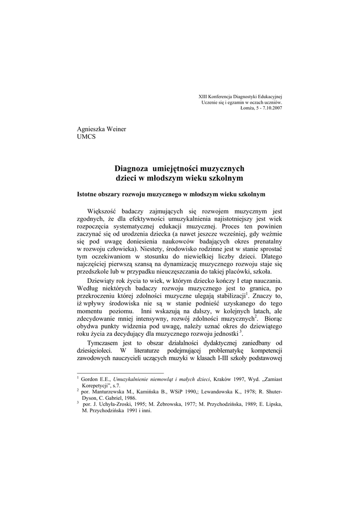 XIII Konferencja Diagnostyki Edukacyjnej Uczenie się i egzamin w oczach uczniów. Łomża, 5 - 7.10.2007 Agnieszka Weiner UMCS Diagnoza umiejętności muzycznych dzieci w młodszym wieku szkolnym Istotne obszary rozwoju muzycznego w młodszym wieku szkolnym Większość badaczy zajmujących się rozwojem muzycznym jest zgodnych, że dla efektywności umuzykalnienia najistotniejszy jest wiek rozpoczęcia systematycznej edukacji muzycznej. Proces ten powinien zaczynać się od urodzenia dziecka (a nawet jeszcze wcześniej, gdy weźmie się pod uwagę doniesienia naukowców badających okres prenatalny w rozwoju człowieka). Niestety, środowisko rodzinne jest w stanie sprostać tym oczekiwaniom w stosunku do niewielkiej liczby dzieci. Dlatego najczęściej pierwszą szansą na dynamizację muzycznego rozwoju staje się przedszkole lub w przypadku nieuczęszczania do takiej placówki, szkoła. Dziewiąty rok życia to wiek, w którym dziecko kończy I etap nauczania. Według niektórych badaczy rozwoju muzycznego jest to granica, po przekroczeniu której zdolności muzyczne ulegają stabilizacji1. Znaczy to, iż wpływy środowiska nie są w stanie podnieść uzyskanego do tego momentu poziomu. Inni wskazują na dalszy, w kolejnych latach, ale zdecydowanie mniej intensywny, rozwój zdolności muzycznych2. Biorąc obydwa punkty widzenia pod uwagę, należy uznać okres do dziewiątego roku życia za decydujący dla muzycznego rozwoju jednostki 3. Tymczasem jest to obszar działalności dydaktycznej zaniedbany od dziesięcioleci. W literaturze podejmującej problematykę kompetencji zawodowych nauczycieli uczących muzyki w klasach I-III szkoły podstawowej 1 2 3 Gordon E.E., Umuzykalnienie niemowląt i małych dzieci, Kraków 1997, Wyd. „Zamiast Korepetycji”, s.7. por. Manturzewska M., Kamińska B., WSiP 1990,; Lewandowska K., 1978; R. ShuterDyson, C. Gabriel, 1986. por. J. Uchyła-Zroski, 1995; M. Żebrowska, 1977; M. Przychodzińska, 1989; E. Lipska, M. Przychodzińska 1991 i inni. nie ma poglądów o ich zadowalającym poziomie. Zaś niekompetentni nauczyciele nie mogą efektywnie pracować. Realizacja przez nich programu kształcenia może przynosić wyłącznie niezadowalające efekty 4. Pojawiające się po kilkuletnim funkcjonowaniu modelu zintegrowanego opinie i obserwacje związane z realizacją muzyki są niespójne. Wydaje się, że taki model kształcenia daje szansę na lepszą realizację działań muzycznych. Mogą one pojawiać się często (kilka razy w ciągu dnia), pełniąc różne funkcje. Muzyka może stanowić także bazę dla ośrodków dziennych. W ciągu roku szkolnego istnieje wiele okazji do tego, aby treściami muzyki nasycić inne rodzaje edukacji. Wymaga to jednak od nauczyciela perfekcyjnej znajomości możliwości kształcących muzyki. Przy ogólnym pędzie do integracji, nie można jednak zapominać, iż muzyka, jako jedna ze sztuk, posiada swój specyficzny język, który wymaga przyswojenia. Temu celowi służą typowo warsztatowe działania muzyczne, które nie dają się zintegrować z innymi rodzajami edukacji. Pozbawienie dzieci tego rodzaju ćwiczeń stwarza realne niebezpieczeństwo eliminacji edukacji muzycznej. Brak rozumienia, a w konsekwencji nieumiejętność posługiwania się językiem muzyki, prowadzi do zignorowania nadrzędnego celu kształcenia. Nie może być wówczas mowy o harmonijnym, a tym bardziej wszechstronnym, rozwoju dziecka 5. Pominięcie w standardach kształcenia wymagań, stanowiących podstawę przeprowadzenia sprawdzianów na końcu cyklu kształcenia dla etapu nauczania zintegrowanego jest zjawiskiem niekorzystnym. A z punktu widzenia edukacji muzycznej – niekorzystnym podwójnie. Przesunięcie wyrównywania szans do wyższych klas szkoły podstawowej jest niesłuszne. Może stanowić zachętę dla nauczycieli do całkowitej rezygnacji z działań dla nich trudnych lub wymagających pilnego podniesienia kwalifikacji (a tak jest w przypadku edukacji muzycznej). Tymczasem pomiar osiągnięć muzycznych jest po I etapie nie tylko możliwy, ale i celowy. Należy tylko wyposażyć nauczycieli w obiektywne, trafne i rzetelne narzędzie. Oprócz praktycznych korzyści, jego szerokie wykorzystanie, może przyczynić się do szybkiego i, mam nadzieję, radykalnego podniesienia poziomu świadomości możliwości tej edukacji. 4 5 porównaj: M. Przychodzińska, 1989; E. Kilińska, 1984; A. Jaworska, 1997; W. Sacher, 1994; A. Weiner 2000; 2004. A. Boguszewska, A. Weiner, 160 pomysłów na nauczanie zintegrowane w klasach I-III . Edukacja plastyczno-muzyczna. Impuls, Kraków 2002, s.6. Testy w edukacji muzycznej Historia testów muzycznych sięga XIX wieku. C. Stumpf około 1880 roku opracował kilka prostych testów, podobnych do tradycyjnych zadań konstruowanych przez nauczycieli muzyki. Obejmowały one: powtarzanie głosem dźwięków granych na fortepianie, porównywanie ich wysokości, ocenę - czy konkretne współbrzmienia są konsonansami. W 1920 roku obszerniejszą baterię testów stworzył G. Révész. Obejmowała ona pomiar „niższych i wyższych stopni muzykalności”. W 1923 i 1925 roku M. Schoen opracował trzy testy będące uzupełnieniem baterii Seashore’a do badania słuchu względnego, poczucia rytmu i sekwencji tonalnych. Tworzono także testy percepcji różnic wysokości i wzorów rytmicznych oraz pamięci (Mainwaring, 1931), czy testy wyobraźni dźwiękowej (Madison). Wszystkie wyżej wymienione testy należą do metod niestandaryzowanych.6 Do testów osiągnięć muzycznych, najczęściej używanych w Polsce, należy zaliczyć: Test notacji muzycznej S. Farnuma, który mierzy umiejętność kojarzenia zapisu nutowego ze słyszaną melodią. Można go stosować w szkole ogólnokształcącej. Zadania polegają na zaznaczeniu taktu, w którym badany stwierdził różnicę między muzyką a zapisem. Test osiągnięć muzycznych J. Aliferiesa – podobnie mierzy umiejętność kojarzenia zapisu ze sł
