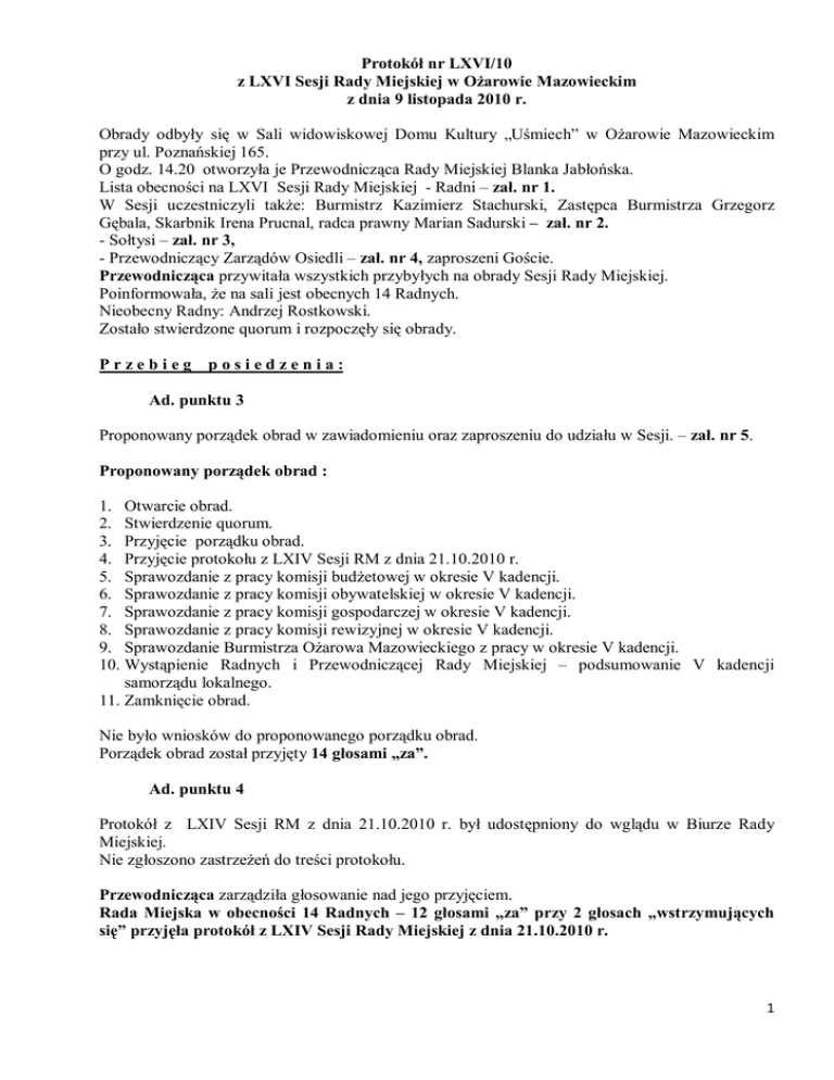 Protokół nr LXVI/10 z LXVI Sesji Rady Miejskiej w Ożarowie Mazowieckim z dnia 9 listopada 2010 r. Obrady odbyły się w Sali widowiskowej Domu Kultury „Uśmiech” w Ożarowie Mazowieckim przy ul. Poznańskiej 165. O godz. 14.20 otworzyła je Przewodnicząca Rady Miejskiej Blanka Jabłońska. Lista obecności na LXVI Sesji Rady Miejskiej - Radni – zał. nr 1. W Sesji uczestniczyli także: Burmistrz Kazimierz Stachurski, Zastępca Burmistrza Grzegorz Gębala, Skarbnik Irena Prucnal, radca prawny Marian Sadurski – zał. nr 2. - Sołtysi – zał. nr 3, - Przewodniczący Zarządów Osiedli – zał. nr 4, zaproszeni Goście. Przewodnicząca przywitała wszystkich przybyłych na obrady Sesji Rady Miejskiej. Poinformowała, że na sali jest obecnych 14 Radnych. Nieobecny Radny: Andrzej Rostkowski. Zostało stwierdzone quorum i rozpoczęły się obrady. Przebieg posiedzenia: Ad. punktu 3 Proponowany porządek obrad w zawiadomieniu oraz zaproszeniu do udziału w Sesji. – zał. nr 5. Proponowany porządek obrad : 1. Otwarcie obrad. 2. Stwierdzenie quorum. 3. Przyjęcie porządku obrad. 4. Przyjęcie protokołu z LXIV Sesji RM z dnia 21.10.2010 r. 5. Sprawozdanie z pracy komisji budżetowej w okresie V kadencji. 6. Sprawozdanie z pracy komisji obywatelskiej w okresie V kadencji. 7. Sprawozdanie z pracy komisji gospodarczej w okresie V kadencji. 8. Sprawozdanie z pracy komisji rewizyjnej w okresie V kadencji. 9. Sprawozdanie Burmistrza Ożarowa Mazowieckiego z pracy w okresie V kadencji. 10. Wystąpienie Radnych i Przewodniczącej Rady Miejskiej – podsumowanie V kadencji samorządu lokalnego. 11. Zamknięcie obrad. Nie było wniosków do proponowanego porządku obrad. Porządek obrad został przyjęty 14 głosami „za”. Ad. punktu 4 Protokół z LXIV Sesji RM z dnia 21.10.2010 r. był udostępniony do wglądu w Biurze Rady Miejskiej. Nie zgłoszono zastrzeżeń do treści protokołu. Przewodnicząca zarządziła głosowanie nad jego przyjęciem. Rada Miejska w obecności 14 Radnych – 12 głosami „za” przy 2 głosach „wstrzymujących się” przyjęła protokół z LXIV Sesji Rady Miejskiej z dnia 21.10.2010 r. 1 Ad. punktu 5 Sprawozdanie z pracy komisji budżetowej w okresie V kadencji. Przewodniczący komisji budżetowej Robert Kukułowicz przedstawił sprawozdanie komisji: „W skład komisji do spraw budżetowych w trakcie trwania V kadencji wchodzili: 1. Robert Kukułowicz – Przewodniczący komisji 2. Andrzej Rostkowski – Wiceprzewodniczący komisji 3. Barbara Laska 4. Anita Nowińska 5. Lech Toruszewski oraz Roman Jasiński, który zrezygnował z pełnienia mandatu Radnego. W okresie od 12.11.2006 do 02.11.2010 odbyło się 137 posiedzeń komisji do spraw budżetowych, na których realizowany był zaplanowany na poszczególne lata plan pracy oraz omawiane były dodatkowe sprawy mieszkańców naszej Gminy. Plany prac w poszczególnych latach były realizowane w 100 %, a do statutowych zadań komisji należało: przygotowanie jednolitych i spójnych zmian do projektów uchwał budżetowych analizowanie i opiniowanie zmian do uchwał budżetowych opiniowanie projektów uchwał przedkładanych na Sesje Rady Miejskiej opiniowanie pism Dyrektora ZUK dotyczących umorzeń zaległości czynszowych analizowanie zamówień publicznych analizowanie stanu realizacji inwestycji analizowanie stanu wykonania budżetów w poszczególnych latach analizowanie stanu wykonania budżetów poszczególnych jednostek organizacyjnych analizowanie stawek podatkowych i opłat zapoznanie się z propozycjami zadań inwestycyjnych zgłaszanymi przez mieszkańców dodatkowo komisja zajmowała się między innymi następującymi tematami: podwyżkami dla personelu administracyjno-gospodarczego szkół i przedszkoli działalnością klubów sportowych działających na terenie gminy ustaleniem wynagrodzenia zasadniczego i nowej wartości punktu dla gminnych jednostek i zakładu budżetowego opracowaniem rankingu przebudowy dróg na terenie gminy Ożarów Mazowiecki weryfikacją możliwości bezzwrotnego obiegu funduszy pomiędzy Jednostkami Gminy a Urzędem Gminy oraz wzajemnymi rozliczeniami pomiędzy Jednostkami Gminy omówieniem koncepcji rozwiązania problemu odprowadzania nieczystości płynnych z terenu gminy Ożarów Mazowiecki – został wybrany wariant rurociągu do oczyszczalni w Józefowie. W czasie trwania kadencji komisja zwróciła się do Burmistrza między innymi z następującymi wnioskami: o wprowadzenie obowiązku prowadzenia dzienników budowy przy pracach remontowych o opracowanie jednolitych zasad refundacji kosztów budowy sieci wodno-kanalizacyjnej dla całej gminy o przeprowadzenie kontroli pracy inspektorów budowlanych o opracowanie jednolitych zasad wykupu gruntów pod inwestycje gminne (drogi, kanalizacja wodociągi) 2 o opracowanie nowego porozumienia pomiędzy GOSiR i ZEASiP regulującego wzajemne relacje dotyczące opieki nad obiektami sportowymi o przygotowanie regulaminu użytkowania obiektów sportowych z jednoznacznym określeniem odpowiedzialności użytkowników za wyrządzone szkody o podjęcie działań w celu reaktywowania komisji do spraw sportu i przekazanie sprawozdań z jej działalności. Uchwały budżetowe na latach 2007-2010 zawierały następujące dane: 2007 Dochody Uchwała 56 169 643,00 PLN Po_zmianach 61 077 591,00 PLN Wykonanie 64 159 348,90 PLN Wydatki Nakłady na inwestycje 59 485 273,00 PLN 18 395 587,00 PLN 64 525 574,00 PLN 59 655 295,05 PLN 16 898 465,63 PLN 2008 Dochody Uchwała 62 789 021,00 PLN Po_zmianach 69 727 462,00 PLN Wykonanie 72 252 844,68 PLN Wydatki Nakłady na inwestycje 64 692 021,00 PLN 18 536 500,00 PLN 73 251 654,00 PLN 69 124 450,54 PLN 19 157 235,01 PLN 2009 Dochody Uchwała 75 207 984,00 PLN Po_zmianach 77 687 140,80 PLN Wykonanie 70 628 778,40 PLN Wydatki Nakłady na inwestycje 89 671 984,00 PLN 34 483 000,00 PLN 93 892 646,80 PLN 78 953 944,55 PLN 22 363 123,06 PLN 2010 Dochody Uchwała 75 609 990,00 PLN Po_zmiana