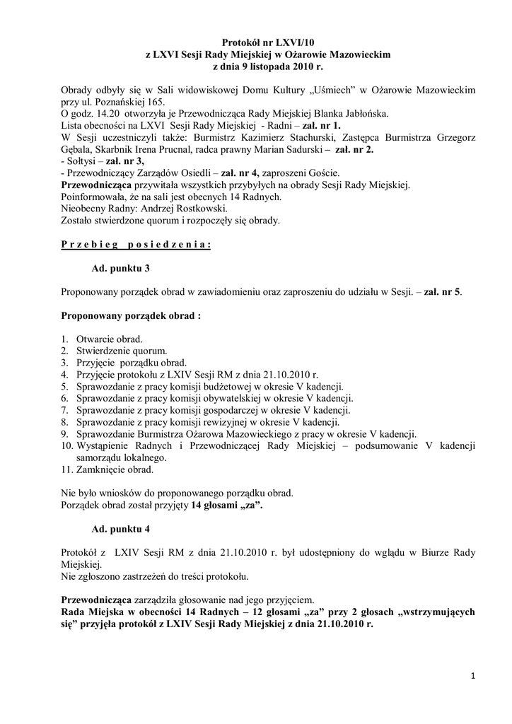 Protokół nr LXVI/10 z LXVI Sesji Rady Miejskiej w Ożarowie