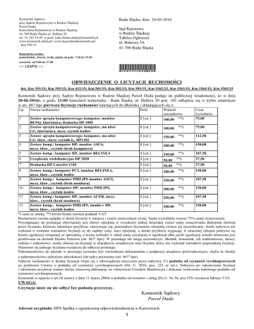 Komornik Sądowy przy Sądzie Rejonowym w Rudzie Śląskiej Paweł Duda Kancelaria Komornicza w Rudzie Śląskiej 41-709 Ruda Śląska ul. Hallera 20 tel. 32 783 54 03 e-mail: [email protected] www.komornik-duda.pl | www.kancelariakomornika.pl Km 393/15 Ruda Śląska, dnia 24-05-2016 Sąd Rejonowy w Rudzie Śląskiej Tablica Ogłoszeń ul. Bukowa 5A 41-700 Ruda Śląska Kancelaria czynna: poniedziałek, wtorek, środa, piątek od godz. 7:30 do 15:30 czwartek od 9:00 do 17:00 *0020000222622* << ODPIS >> OBWIESZCZENIE O LICYTACJI RUCHOMOŚCI dot. Km 393/15; Km 395/15; Km 412/15; Km 501/15; Km 502/15; Km 503/15, Km 1562/15, Km 1563/15, Km 1564/15, Km 1565/15 Komornik Sądowy przy Sądzie Rejonowym w Rudzie Śląskiej Paweł Duda podaje do publicznej wiadomości, że w dniu 20-06-2016r. o godz. 12:00 kancelarii komornika - Ruda Śląska, ul. Hallera 20 pok. 103 odbędzie się w trybie ustalonym w art. 867 kpc pierwsza licytacja ruchomości należących do dłużnika i składających się z: Lp. Nazwa ruchomości Ilość 1 1 [szt.] 1 [szt.] 100,00 **) 75,00 1 [szt.] 150,00 **) 112,50 1 [szt.] 200,00 **) 150,00 5 Zestaw sprzętu komputerowego: komputer, monitor BENQ, klawiatura, drukarka HP 1005 Zestaw sprzętu komputerowego: komputer, mo nitor LG, klawiatura, mysz, czytnik kodów Zestaw sprzętu komputerowego: komputer, mo nitor LG, klaw., mysz, czytnik k., HP1102 Zestaw komp.: komputer HP, monitor ASUS, mysz, klaw., czytnik (brak komputera) Zestaw komp.: komputer HP, monitor BELINEA Wartość szacunkowa 100,00 **) 1 [szt.] 250,00 **) 187,50 6 Urządzenie wielofunkcyjne HP 2050 1 [szt.] 50,00 7 Drukarka HP LaserJet 1320 2 3 4 **) Cena wywołania 75,00 37,50 1 [szt.] 37,50 50,00 **) Zestaw komp.: komputer PC2, monitor BELINEA, 1 [szt.] **) 150,00 200,00 mysz, klaw., czytnik kodów 9 Zestaw komp.: komputer PHILIPS monitor ASUS, 1 [szt.] 187,50 250,00 **) mysz, klaw., czytnik (brak monitora) 10 Zestaw komp.: komputer HP, monitor PHILIPS, 1 [szt.] 150,00 200,00 **) mysz, klaw., czytnik kodów 11 Zestaw komp.: komputer HP, monitor ACER, mysz, 1 [szt.] 187,50 250,00 **) klaw., czytnik (brak monitora) 12 Zestaw komp.: komputer PHILIPS, monito r HP, 1 [szt.] 150,00 200,00 **) mysz, klaw., czytnik kodów *) cena za sztukę, **) kwota brutto zawiera podatek VAT Ruchomości można oglądać w dzień licytacji w miejscu i czasie oznaczonym wyżej. Suma wywołania wynosi 75% sumy oszacowania. Przystępujący do przetargu obowiązany jest złożyć rękojmię w wysokości jednej dziesiątej części sumy oszacowania. Rękojmię złożoną przez licytanta, któremu udzielono przybicia, zatrzymuje się; pozostałym licytantom rękojmię zwraca się niezwłocznie. Jeżeli nabywca nie wykonał w terminie warunków licytacji co do zapłaty ceny, traci rękojmię, a skutki przybicia wygasają. Z utraconej rękojmi pokrywa się koszty egzekucji związanej ze sprzedażą, a reszta wchodzi w skład sumy uzyskanej w egzekucji albo jeżeli egzekucja została umorzona jest przelewana na dochód Skarbu Państwa (art. 8671 kpc). W przetargu nie mogą uczestniczyć: dłużnik, komornik, ich małżonkowie, dzieci, rodzice i rodzeństwo, osoby obecne na licytacji w charakterze urzędowym oraz licytant, który nie wykonał warunków poprzedniej licytacji. Stawienie się jednego licytanta wystarcza do odbycia przetargu. Pełnomocnictwo do udziału w przetargu powinno być stwierdzone dokumentem z podpisem urzędowo poświadczonym, chyba że chodzi 8 o pełnomocnictwo udzielone adwokatowi lub radcy prawnemu (art. 8672 kpc) Nabycie ruchomości w drodze licytacji wiąże się z obowiązkiem uiszczenia przez nabywcę 2% podatku od czynności cywilnoprawnych na podstawie Ustawy o podatku od czynności cywilnoprawnych (Dz. U. 2016, poz. 223 ze zm.). Nabywca po zakończeniu licytacji i udzieleniu przybicia winien złożyć stosowną deklarację we właściwym Urzedzie Skarbowym i dokonać rozliczenia należnego podatku od czynności cywilnoprawnych. Komornik w oparciu o art.18 ustawy z dnia 11 marca 2004r o podatku od towarów i usług (Dz.U. Nr 54, poz.535) wystawia faktury VAT. UWAGA: Licytacja może się nie odbyć bez podania przyczyny. Komornik Sądowy Paweł Duda Adresat oryginału: HPS Spółka z ograniczoną odpowiedzialnością w Katowicach 1 Do wiadomości: 1. Marzena Pakosz-Jendrulok adwokat Kancelaria Adwokacka, 41-710 Ruda Śląska 2. Sąd Rejonowy w Rudzie Śląskiej Tablica Ogłoszeń, 41-700 Ruda Śląska 3. Urząd Miasta Ruda Śląska Tablica Ogłoszeń, 41-709 Ruda Śląska 4. a/a 2