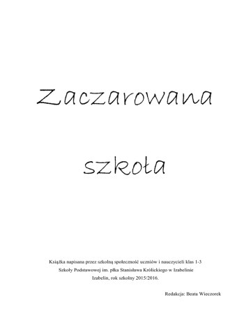Zaczarowana szkoła Książka napisana przez szkolną społeczność uczniów i nauczycieli klas 1-3 Szkoły Podstawowej im. płka Stanisława Królickiego w Izabelinie Izabelin, rok szkolny 2015/2016. Redakcja: Beata Wieczorek Rozdział 1. Niespodzianka od Rozalki. Mam na imię Zosia. Niedługo skończę dziewięć lat. Chodzę do szkoły w niewielkiej miejscowości, w której mieszkam razem z moimi rodzicami i bratem Miłkiem. Mieszkamy na skraju puszczy, w nowym domu, który bardzo kocham. Mam na poddaszu swój pokój z dużym oknem, przez które mogę podziwiać las o każdej porze roku zmieniający swój wygląd. Tata kupił mi na urodziny lunetę. Mogę teraz prowadzić obserwacje i podziwiać leśnych gości, często odwiedzających okolice mojego domu. Zaczęłam nawet pisać notatki w swoim dzienniczku badań przyrodniczych. Uwielbiam chodzić do szkoły i zawsze za nią tęsknię, gdy mamy dłuższą przerwę w nauce – czyli ferie, albo wakacje. W mojej szkole jest naprawdę super. Mam mnóstwo fajnych koleżanek i kolegów. Uczą nas fajni nauczyciele. Powiecie, że nic nadzwyczajnego, że tak jest w wielu innych szkołach, ale to nieprawda. Dzieje się w naszej szkole, oj dzieje… Nie możemy narzekać na nudę. Uczyć się trzeba – wiadomo, ale jak jest fajnie, to człowiek chętniej wstaje rano z łóżka. Codziennie coś niezwykłego, mówię Wam - mnóstwo fajnych, dziwnych i zwariowanych historii. Szkoła – niby taka, jak wiele innych, a jednak… Nasza szkoła jest niezwykła, magiczna, powiedziałabym … zaczarowana… Dzisiaj na przykład Ruda Fela (naprawdę ma rude włosy), przyniosła do szkoły kurę. Pani najpierw nie bardzo chciała się zgodzić, bo przecież kura gdacze, przeszkadza w lekcji, może zostawić niespodziankę na dywanie, ale Fela tak Panią prosiła, że w końcu Pani uległa i pozwoliła przynieść do szkoły najprawdziwszą na świecie kurę. Kura Feli ma na imię Rozalia. Fela kocha ją nad życie i za nic w świecie nie pozwoliłaby zrobić jej krzywdy. Tak więc Kura Rozalia od wpół do ósmej poniedziałkowego poranka przeżywała istne oblężenie ciekawskich dzieciaków z całej szkoły. Każdy chciał dotknąć, pogłaskać, zagadać, zapytać Felę o zwyczaje Rozalki – kury domowej, hodowlanej, ptaka udomowionego, znoszącego jajka. Rozalka cichutko przycupnęła w kącie klatki, w której została przyniesiona i łypała to jednym, to drugim okiem na ciekawskich, śmiesznie przy tym przekrzywiając główkę i strosząc od czasu do czasu piórka. Dzwonek ogłaszający lekcję, wybawił ją od hałaśliwego towarzystwa. Gdy usiedliśmy w ławkach, Fela postawiła klatkę na środku klasy, a Pani zapytała: - Czy ktoś z was wie, skąd się wzięła kura? Czy zawsze była ptakiem hodowlanym? Pani to zawsze znajdzie sposób, by nas zmotywować do pracy lub przemycić kilka ciekawych informacji. Zaczęliśmy szukać w Internecie. Najszybszy był jak zawsze Jacek – chodzący, a raczej biegający nasz klasowy spryciarz. - Proszę Pani – mam, znalazłem! – krzyczał rozemocjonowany. Mogę przeczytać? - Proszę - powiedziała Pani z uśmiechem. Kura to ptak hodowlany z rodziny kurowatych, hodowany na całym świecie. W środowisku naturalnym nie występuje. Uważa się, że stanowi formę udomowioną kura bankiwa (Gallus gallus), lecz nie wyklucza się domieszki innych gatunków południowoazjatyckich kuraków (zarówno żyjących, np. kur siwy, jak i wymarłych). Udomowienie miało prawdopodobnie miejsce w III tysiącleciu p.n.e. w Indiach, czyli bardzo, bardzo dawno temu, chociaż badania archeologiczne wykazały, że pierwsze kuraki udomowiono w Chinach już w VI tysiącleciu p.n.e. – czyli jeszcze dawniej. Około 1000 p.n.e. kury hodowano już powszechnie w Chinach, a ok. 500 p.n.e. w Egipcie i Europie, w tym w Polsce (odnaleziono kości kur podczas wykopalisk w Biskupinie)1.. Jacek dostał oczywiście szóstkę i siedział cały rozpromieniony. To nasz klasowy mistrz w sportach, jest sprytny i bardzo szybki Ach! Przecież mówiłam wam o kurze Rozalce. Po wejściu do klasy i wysłuchaniu informacji o kurach, wcale nie mieliśmy dość wrażeń związanych z atrakcją dzisiejszego dnia. Obiecaliśmy Pani, że będziemy dziś wyjątkowo pilnie pracować na lekcjach, byle tylko pozwoliła nam obejrzeć kurę z bliska. Fela wyjęła ją z klatki i stało się to, co Pani przewidywała wcześniej! Rozalka wyskoczyła jak oparzona i natychmiast zaczęła skakać po ławkach, krzesłach szafkach. My wszyscy oczywiście staraliśmy się ją złapać, ale to tylko potęgowało emocje i coraz większy hałas. Ależ zabawa…! Rozalka oszalała: co chwilę podfruwała, podskakiwała i gdy tylko zdawało się, że już ją mamy, ona podfruwała w górę i tyle ją widzieliśmy. Skakała po ławkach, półkach, biurku naszej pani, naszych ramionach i głowach. Wtedy do akcji przyłączył się Bartek – jak zwykle spóźniony, ale bardzo lubiany - nasz klasowy przyrodnik i naukowiec. - Uspokójcie się – przecież ona was się boi! – krzyczał z całych sił. Nie na wiele jednak zdało się jego tłumaczenie, bo nikt go nie słuchał. Wtedy Rozalka podfrunęła jeszcze wyżej i usiadła na najwyższej półce w klasie. - O! Usiadła, jak na grzędzie! – zawołała Fela. W klasie wreszcie ucichło. Kura znów obserwowała nas śmiesznie przekręcając łebek. Usiedliśmy w kręgu i wtedy stało się coś dziwnego. Z półki, na której siedziała Rozalka, zaczęły spadać jajka. Nie takie zwykłe… Każde jako było w innym kolorze i – co najważniejsze nie tłukło się spadając. Ale heca! Na naszą reakcję nie trzeba było długo czekać. Zerwaliśmy się z dywanu i każdy starał się złapać ich jak najwięcej. Nagle Alek krzyknął: - Słuchajcie – to nie są zwykłe jajka! Każdy kolor inaczej smakuje i ma w środku inną niespodziankę. Zaczęliśmy je próbować. Rzeczywiście – każde jajko Rozalki smakow