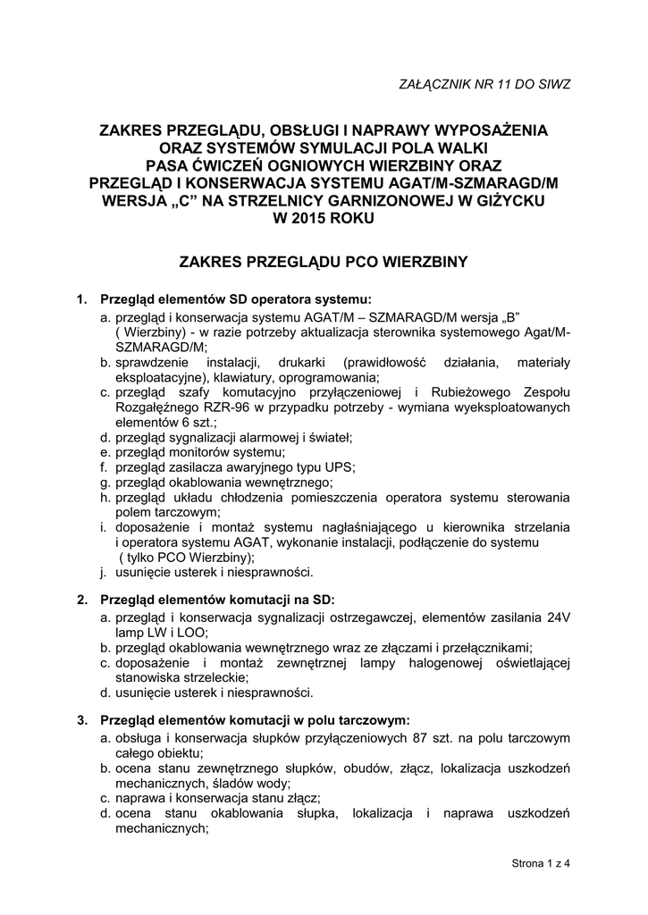 ZAŁĄCZNIK NR 11 DO SIWZ ZAKRES PRZEGLĄDU, OBSŁUGI I NAPRAWY WYPOSAŻENIA ORAZ SYSTEMÓW SYMULACJI POLA WALKI PASA ĆWICZEŃ OGNIOWYCH WIERZBINY ORAZ PRZEGLĄD I KONSERWACJA SYSTEMU AGAT/M-SZMARAGD/M WERSJA „C” NA STRZELNICY GARNIZONOWEJ W GIŻYCKU W 2015 ROKU ZAKRES PRZEGLĄDU PCO WIERZBINY 1. Przegląd elementów SD operatora systemu: a. przegląd i konserwacja systemu AGAT/M – SZMARAGD/M wersja „B” ( Wierzbiny) - w razie potrzeby aktualizacja sterownika systemowego Agat/MSZMARAGD/M; b. sprawdzenie instalacji, drukarki (prawidłowość działania, materiały eksploatacyjne), klawiatury, oprogramowania; c. przegląd szafy komutacyjno przyłączeniowej i Rubieżowego Zespołu Rozgałęźnego RZR-96 w przypadku potrzeby - wymiana wyeksploatowanych elementów 6 szt.; d. przegląd sygnalizacji alarmowej i świateł; e. przegląd monitorów systemu; f. przegląd zasilacza awaryjnego typu UPS; g. przegląd okablowania wewnętrznego; h. przegląd układu chłodzenia pomieszczenia operatora systemu sterowania polem tarczowym; i. doposażenie i montaż systemu nagłaśniającego u kierownika strzelania i operatora systemu AGAT, wykonanie instalacji, podłączenie do systemu ( tylko PCO Wierzbiny); j. usunięcie usterek i niesprawności. 2. Przegląd elementów komutacji na SD: a. przegląd i konserwacja sygnalizacji ostrzegawczej, elementów zasilania 24V lamp LW i LOO; b. przegląd okablowania wewnętrznego wraz ze złączami i przełącznikami; c. doposażenie i montaż zewnętrznej lampy halogenowej oświetlającej stanowiska strzeleckie; d. usunięcie usterek i niesprawności. 3. Przegląd elementów komutacji w polu tarczowym: a. obsługa i konserwacja słupków przyłączeniowych 87 szt. na polu tarczowym całego obiektu; b. ocena stanu zewnętrznego słupków, obudów, złącz, lokalizacja uszkodzeń mechanicznych, śladów wody; c. naprawa i konserwacja stanu złącz; d. ocena stanu okablowania słupka, lokalizacja i naprawa uszkodzeń mechanicznych; Strona 1 z 4 e. f. g. h. i. sprawdzenie działania słupka w systemie; wymiana przewodów zasilających w podnośnikach ciężkich 2,5 m - 20szt; wymiana przewodów sterujących w podnośnikach ciężkich 2,5 m - 20szt; przegląd i konserwacja dozorów na PCO 900 3szt.; usunięcie usterek i niesprawności. 4. Przegląd i usunięcie niesprawności elementów wyposażenia schronu celów ruchomych na rubieży 100m: a. przegląd połączeń elektrycznych, barier bezpieczeństwa; b. przegląd zespołów napędowych celów ruchomych 2 szt.; c. przegląd szaf zasilająco - sterowniczych zespołów napędowych 2 szt.; d. przegląd układu sterowania i transmisji informacji zwrotnych 2 szt.; e. przegląd wózków, konserwacja układów zasilania; f. kontrola stanu złącz śrubowych; g. naprawa zdiagnozowanych niesprawności i uszkodzeń; h. sprawdzenie poprawności działania w systemie. 5. Przegląd i usunięcie niesprawności elementów celu ruchomego i systemu trafień PCO 900 m: a. przegląd połączeń elektrycznych, bariery bezpieczeństwa; b. przegląd zespołu napędowego celu ruchomego; c. przegląd szafy zasilająco-sterowniczej zespołu napędowego; d. przegląd układu sterowania i transmisji informacji zwrotnych wraz z zespołem współpracy; e. przegląd wózka, konserwacja układu zasilania; f. kontrola stanu złącz śrubowych; g. naprawa zdiagnozowanych niesprawności i uszkodzeń; h. sprawdzenie poprawności działania w systemie. 6. Przegląd i konserwacja elementów masztu sygnalizacyjno-ostrzegawczego na SD: a. ocena stanu zewnętrznej izolacji okablowania, lokalizacja uszkodzeń izolacji (przetarcia, pęknięcia); b. sprawdzenie stanu osłon lamp i żarówek; c. usunięcie usterek i niesprawności. 7. Przegląd, naprawa i konserwacja stanowisk wahliwych WUW-84: a. obsługa i konserwacja urządzeń WUW-84 w zakresie smarowania; b. przegląd mimośrodów napędu ramy wahacza; c. przegląd układu korbowego; d. przegląd amortyzatorów ramy wahacza; e. przegląd i konserwacja łożyska głównego; f. regulacja zespołów urządzenia; g. przegląd szaf zasilająco-sterowniczych na PCO 100 m i na PCO 900 m; h. usunięcie usterek i niesprawności. 8. Przegląd i konserwacja blokad urządzeń wahliwych WBW-02: a. obsługa i konserwacja urządzeń WBW-02 w zakresie smarowania i wymiany oleju ( w wyniku zaistniałej potrzeby); Strona 2 z 4 b. sprawdzenie poprawności pracy urządzenia zgodnie technicznymi przed rozpoczęciem przeglądu; c. przegląd układu hydraulicznego; d. regulacja i sprawdzenie parametrów eksploatacyjnych; e. usunięcie usterek i niesprawności. z warunkami 9. Sprawdzenie skuteczności zerowania oraz pomiar rezystancji izolacji (o ile minął czasookres między kolejnymi badaniami określony obowiązującymi przepisami PN): a. dokonanie oceny stanu technicznego instalacji; b. sprawdzenie ciągłości oraz pewności połączeń elektrycznych; c. pomiary impedancji pętli zwarcia; d. usunięcie usterek i niesprawności, wykonanie pomiarów, opracowanie wyników i sporządzenie protokołu. 10. Aktualizacja dokumentacji technicznej na PCO Wierzbiny wyposażonej w system sterowania AGAT/M – SZMARAGD/M wersja „B”: a. dokonanie wpisów o wykonanych czynnościach do dowodów urządzeń, a w przypadku ich braku wystawienie duplikatów; b. dokonanie aktualizacji dokumentacji strzelnicy. 11. Kontrola działania całego systemu sterowania oraz aktualizacja oprogramowania AGAT/M – SZMARAGD/M wersja „B” na zgodność z instrukcją szkol. 856/2012 oraz szkol 857/2012 wraz z uzupełnieniami. 16. Warunkiem zakończenia prac jest udzielenie gwarancji na poprawną pracę wszystkich elementów obiektu na okres od dnia zakończenia prac i podpisania protokołu do dnia 30.11.2016 r. ZAKRES PRZEGLĄDU STRZELNICY GARNIZONOWEJ GIŻYCKO 1. Przegląd elementów SD operatora systemu: a) przegląd i konserwacja systemu AGAT/M – SZMARAGD/M wykonanie „C” - w razie potrzeby aktualizacja sterownika systemowego Agat/
