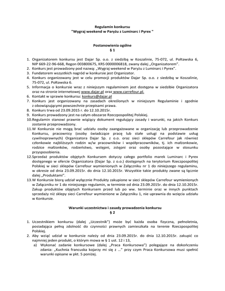 Regulamin konkursu "Wygraj weekend w Paryżu z Luminarc i Pyrex " Postanowienia ogólne §1 1. Organizatorem konkursu jest Dajar Sp. o.o. z siedzibą w Koszalinie, 75-072, ul. Połtawska 6, NIP 669-22-96-668, Regon 003800675, KRS 0000006818, zwany dalej „Organizatorem”. 2. Konkurs jest prowadzony pod nazwą: „Wygraj weekend w Paryżu z Luminarc i Pyrex”. 3. Fundatorem wszystkich nagród w konkursie jest Organizator. 4. Konkurs organizowany jest w celu promocji produktów Dajar Sp. o.o. z siedzibą w Koszalinie, 75-072, ul. Połtawska 6. 5. Informacja o konkursie wraz z niniejszym regulaminem jest dostępna w siedzibie Organizatora oraz na stronie internetowej www.dajar.pl oraz www.carrefour.pl. 6. Kontakt w sprawie konkursu: [email protected] 7. Konkurs jest organizowany na zasadach określonych w niniejszym Regulaminie i zgodnie z obowiązującymi powszechnie przepisami prawa. 8. Konkurs trwa od 23.09.2015 r. do 12.10.2015r. 9. Konkurs prowadzony jest na całym obszarze Rzeczpospolitej Polskiej. 10.Regulamin stanowi prawnie wiążący dokument regulujący zasady i warunki, na jakich Konkurs zostanie przeprowadzony. 11.W Konkursie nie mogą brać udziału osoby zaangażowane w organizację lub przeprowadzenie Konkursu, pracownicy (osoby świadczące pracę lub stałe usługi na podstawie usług cywilnoprawnych) Organizatora Dajar Sp. z o.o. oraz sieci sklepów Carrefour jak również członkowie najbliższych rodzin w/w pracowników i współpracowników, tj. ich małżonkowie, rodzice małżonków, rodzeństwo, wstępni, zstępni oraz osoby pozostające w stosunku przysposobienia. 12.Sprzedaż produktów objętych Konkursem dotyczy całego portfolio marek Luminarc i Pyrex dostępnego w ofercie Organizatora (Dajar Sp. z o.o.) dostępnych na terytorium Rzeczpospolitej Polskiej w sieci sklepów Carrefour wymienionych w Załączniku nr 1 do niniejszego regulaminu, w okresie od dnia 23.09.2015r. do dnia 12.10.2015r. Wszystkie takie produkty zwane są łącznie dalej „Produktami”. 13.W Konkursie biorą udział wyłącznie Produkty zakupione w sieci sklepów Carrefour wymienionych w Załączniku nr 1 do niniejszego regulamin, w terminie od dnia 23.09.2015r. do dnia 12.10.2015r. Zakup produktów objętych Konkursem przed lub po ww. terminie oraz w innych punktach sprzedaży niż sklepy sieci Carrefour wymienione w Załączniku 1, nie uprawnia do wzięcia udziału w Konkursie. Warunki uczestnictwa i zasady prowadzenia konkursu §2 1. Uczestnikiem konkursu (dalej „Uczestnik”) może być każda osoba fizyczna, pełnoletnia, posiadająca pełną zdolność do czynności prawnych zamieszkała na terenie Rzeczpospolitej Polskiej. 2. Aby wziąć udział w konkursie należy od dnia 23.09.2015r. do dnia 12.10.2015r. zakupić co najmniej jeden produkt, o którym mowa w § 1 ust. 12 i 13, a) Wykonać zadanie konkursowe (dalej „Praca Konkursowa”) polegające na dokończeniu zdania: „Kuchnia francuska kojarzy mi się z …” przy czym Praca Konkursowa musi spełnić warunki opisane w pkt. 5 poniżej. b) Wpisać zdanie zawierające Pracę Konkursową jako komentarz posta informującego o konkursie na www.facebook.com/PYREX.Polska lub https://www.facebook.com/luminarcpolska. c) Zachować dowód zakupu z sieci Carrefour co najmniej jednego produktu określonego w § 1 ust. 12 i 13 w formie paragonu fiskalnego lub faktury VAT, przy czym data na dowodzie zakupu musi być wcześniejsza bądź z dnia, kiedy została przesłana Praca Konkursowa. 3. Przez cały czas trwania konkursu, a także po jego zakończeniu do dnia 30.11.2015 Uczestnik jest zobowiązany zachować dowód zakupu (paragon lub fakturę VAT lub ich kserokopię) dokumentujący dokonanie zakupu produktu, o którym mowa w § 1 ust. 12, 13 z czytelnym wydrukiem daty oraz godziny oraz pozycji na dowodzie zakupu odpowiadającej zakupionemu Produktowi. 4. Każdy uczestnik może wysłać w ramach Konkursu dowolną ilość Zgłoszeń, pod warunkiem, że każde kolejne Zgłoszenie poprzedzone będzie zakupem co najmniej jednego produktu Luminarc lub Pyrex w sieci sklepów Carrefour wymienionych w Załączniku 1, na warunkach określonych w niniejszym Regulaminie i udokumentowane jednym dowodem zakupu, spełniającym warunki określone w niniejszym Regulaminie w myśl zasady, że jeden dowód zakupu uprawnia do przesłania jednego Zgłoszenia w Konkursie. Organizator zastrzega, że Uczestnik nie może wysłać tej samej Pracy Konkursowej (tj. odpowiedzi o tej samej treści) więcej niż jeden raz. 5. Praca konkursowa powinna spełnić następujące warunki: a) Nie może zawierać wulgaryzmów, treści obraźliwych, treści sprzecznych z prawem lub przyjętymi za obowiązujące normami obyczajowymi b) Nie może naruszać praw osób trzecich, w tym w szczególności dóbr osobistych i praw autorskich. Założenia konkursu §3 1. Uczestnictwo w Konkursie jest dobrowolne. 2. Przed przystąpieniem do Konkursu, zgodnie z postanowieniami niniejszego Regulaminu, Uczestnik powinien zapoznać się z niniejszym Regulaminem. Komisja konkursowa §4 1. W celu wyłonienia zwycięzców oraz w celu zapewnienia nadzoru nad prawidłowym przebiegiem Konkursu, organizator powoła Komisję Konkursową (dalej „Komisja”). 2. Konkurs polegał będzie na wyborze najciekawszych Prac Konkursowych przez Komisję. Kolejność zgłoszeń nie ma znaczenia. Komisja oceniać będzie Prace Konkursowe biorąc pod uwagę przede wszystkim oryginalność i kreatywność nadesłanych odpowiedzi, a także zgodność z obowiązującymi zasadami poprawności językowej oraz związek z tematyką zdania konkursowego. Nagrody w konkursie §5 1. Nagrodami przeznaczonymi dla uczestników Konkursu jest: a) jedna nagroda I stopnia: voucher dla 2 osób na wycieczkę weekendową do Paryża o wartości 3600,00 zł (słownie: trzy tysiące sześćset złotych). Voucher może zostać zrealizowany przez Laureata w dowolnym terminie do 30.09.2016 roku. Voucher można realizować w biurze 