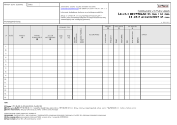 Firma + adres dostawy: Data: Zamówienia prosimy wysyłać e-mailem na adres: [email protected] lub faksem (71) 354 77 74, (71) 354 77 75 Form ul arz Zam ówienia ŻALUZJE DREWNIANE 25 mm / 50 mm ŻALUZJE ALUMINIOWE 50 mm Informacje dodatkowe dostępne są w katalogu produktów. Żaluzje o wymiarach powyżej / poniżej zamieszczonych w cenniku produkowane są wyłącznie na odpowiedzialność Firmy zamawiającej – nie podlegają gwarancji. Numer zamówienia: KOLOR LAMELI 1. 2. 3. 4. 5. 6. 7. 8. 9. 10. 11. 12. 13. 14. 15. Opis: [1] Rodzaj : STANDARD 25, STANDARD 50, CLASSIC 50 [2] Kolor rynny/belki: STANDARD 25 mm - brąz (standard), biały, beż, srebrny / STANDARD 50 mm – biały, srebrny, j. brąz, brąz, beż, turkus, czarny / CLASSIC 50 mm – belka w kolorze lameli [3] Kolor mechanizmu: dotyczy tylko żaluzji CLASSIC – srebrny, stary mosiądz Wybrane opcje należy zaznaczyć znakiem X: [4] Drabinka: STANDARD 25 - tylko sznurkowa / STANDARD 50 – sznurkowa (standard), taśmowa / CLASSIC 50 – taśmowa (standard), sznurkowa [5] Mocowanie dolne: prowadzenie żyłkowe (ŻYŁKI), sworzeń listwy + wspornik (WSPORNIK) [6] Typ montażu: płyta GK, sufit podwieszany, beton UWAGI BETON WYS. (H) PODWIESZANY SZER. (A) TYP MONTAŻU [6] GK KOLOR MECHANIZMU [3] WSPORNIK KOLOR RYNNY / BELKI [2] MOC. DOLNE [5] ŻYŁKI RODZAJ [1] TAŚMOWA ILOŚĆ DRABINKA [4] SZNURKOWA LP STRONA STEROWANIA WYMIARY [CM] DŁUGOŚĆ POKRĘTŁA [CM] v. 05052011