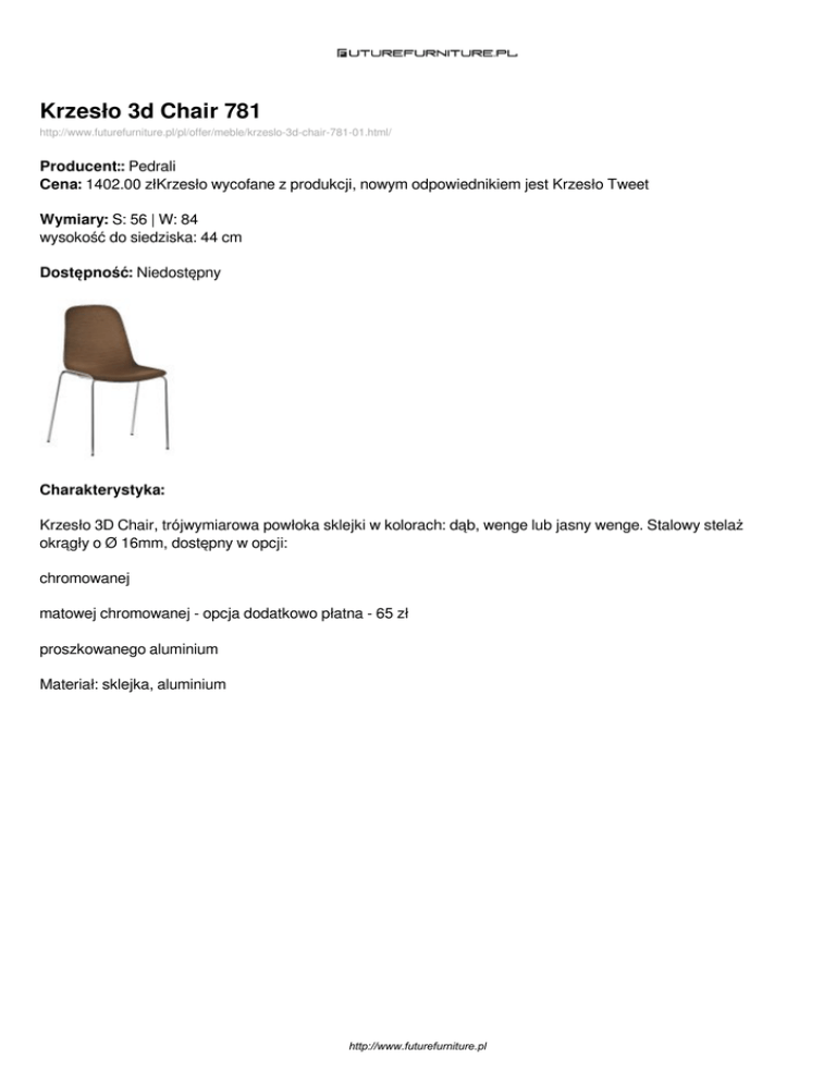 Krzesło 3d Chair 781 http://www.futurefurniture.pl/pl/offer/meble/krzeslo-3d-chair-781-01.html/ Producent:: Pedrali Cena: 1402.00 złKrzesło wycofane z produkcji, nowym odpowiednikiem jest Krzesło Tweet Wymiary: S: 56 | W: 84 wysokość do siedziska: 44 cm Dostępność: Niedostępny Charakterystyka: Krzesło 3D Chair, trójwymiarowa powłoka sklejki w kolorach: dąb, wenge lub jasny wenge. Stalowy stelaż okrągły o Ø 16mm, dostępny w opcji: chromowanej matowej chromowanej - opcja dodatkowo płatna - 65 zł proszkowanego aluminium Materiał: sklejka, aluminium http://www.futurefurniture.pl Dostępne wersje produktu: nazwa produktu warianty Krzesło 3d Chair 781 kolor dąb (RS) cena 1402.00zł dostępne Niedostępny Krzesło 3d Chair 781 kolor wenge (W) 1402.00zł Niedostępny Krzesło 3d Chair 781 Kolor jasne wenge (LW) 1402.00zł Niedostępny http://www.futurefurniture.pl Zdjęcia produktu: http://www.futurefurniture.pl Powered by TCPDF (www.tcpdf.org)
