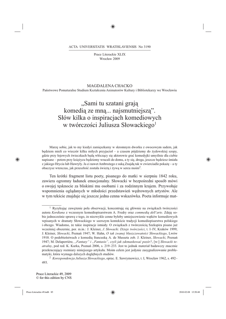 ACTA UNIVERSITATIS WRATISLAVIENSIS No 3190 Prace Literackie XLIX Wrocław 2009 MAGDALENA CHACKO Państwowe Pomaturalne Studium Kształcenia Animatorów Kultury i Bibliotekarzy we Wrocławiu „Sami tu szatani grają komedią ze mną... najsmutniejszą”. Słów kilka o inspiracjach komediowych w twórczości Juliusza Słowackiego1 Marzę sobie, jak to my kiedyś zamięszkamy w skromnym dworku z owocowym sadem, jak będziem mieli co wieczór kilku miłych przyjacioł – a czasem pójdziemy do żydowskiej szopy, gdzie przy łojowych świeczkach będą włóczący się aktorowie grać komedyjki umyślnie dla ciebie napisane – potem przy księżycu będziemy wracali do domu, a ty się, droga, jeszcze będziesz śmiała z jakiego Hrycia lub Hawryły. Ja ci nawet Ambrożego z suką Znajdą tak w zwierciadle pokażę – a ty obaczysz wtenczas, jak przeszłość została świeżą i żywą w sercu moim2. Ten krótki fragment listu poety, pisanego do matki w sierpniu 1842 roku, zawiera ogromny ładunek emocjonalny. Słowacki w bezpośredni sposób mówi o swojej tęsknocie za bliskimi mu osobami i za rodzinnym krajem. Przywołuje wspomnienia oglądanych w młodości przedstawień wędrownych artystów. Ale w tym tekście znajduje się jeszcze jedna cenna wskazówka. Poeta informuje mat1 Ryzykując zawężenie pola obserwacji, koncentruję się głównie na związkach twórczości autora Kordiana z wczesnym komediopisarstwem A. Fredry oraz commedią dell’arte. Zdaję sobie jednocześnie sprawę z tego, że niezwykle cenne byłoby umiejscowienie wątków komediowych wpisanych w dramaty Słowackiego w szerszym kontekście tradycji komediopisarstwa polskiego i obcego. Wiadomo, że takie inspiracje istniały. O związkach z twórczością Szekspira pisano już wcześniej obszernie, por. m.in.: J. Kleiner, J. Słowacki. Dzieje twórczości, t. I–IV, Kraków 1999; J. Kleiner, Słowacki, Poznań 1947; W. Hahn, O tak zwanej bluszczowatości Słowackiego, Lwów 1910. O podobieństwach z komedią francuską A. de Musseta zob. J. Kleiner, Słowacki, Poznań 1947; M. Delaperrière, „Fantazy” i „Fantasio”, czyli jak zdemaskować pozór?, [w:] Słowacki teatralny, pod red. K. Kurka, Poznań 2006, s. 219–233. Jest to jednak materiał badawczy znacznie przekraczający rozmiary niniejszego artykułu. Moim celem jest jedynie zasygnalizowanie problematyki, która wymaga dalszych dogłębnych studiów. 2 Korespondencja Juliusza Słowackiego, oprac. E. Sawrymowicz, t. I, Wrocław 1962, s. 492– 493. Prace Literackie 49, 2009 © for this edition by CNS Prace-Literackie-49.indb 85 2010-02-08 13:50:48 86 MAGDALENA CHACKO kę o tym, że chciałby wraz z nią oglądać komedyjki z życia wzięte umyślnie dla niej napisane, w których naszkicuje portrety oryginałów z rodzinnych stron. Takie utwory nie powstały, bo trudno „komedyjką z życia wziętą” nazwać zadedykowany kochanej Salomei Sen srebrny... Nie powstały pełne utwory, ale czy w tekstach dramatycznych poety nie znajdziemy scen o charakterze komicznym? Przecież mistrzem romantyków był Szekspir, autor licznych komedii, słynący z łączenia elementów tragizmu i komizmu w obrębie jednego tekstu. Także Wiktor Hugo, uznany za ojca romantyzmu francuskiego, postulował zestawianie ze sobą scen wzniosłych i groteskowych, by osiągnąć obraz prawdziwy jak w życiu. Czy Słowacki w swojej twórczości nie podążał tym tropem? Wiemy, że jako widz lubił komedie (nie wszystkie oczywiście). Znał dobrze i cenił twórczość Aleksandra Fredry, w Paryżu oglądał pantomimy z nieodłącznymi postaciami Pierrota i Arlekina, we Włoszech bawiły go scenki rodem z commedia dell’arte. Nie zaakceptował zamiłowania paryżan do wodewilów, które nazywał „najgłupszym wynalezieniem Francuzów”, bo „ani w nich sensu, ani wesołości, ani muzyki dobrej nie ma”3. Przedkładał nad nie polskie farsy, proste i szczere, takie jak Damy i huzary. Przyjrzyjmy się, czy tworząc swoje dramaty, nie sięgał również do tego rozrywkowego repertuaru, szukając w nim inspiracji. I. Teatralne spotkania z A. Fredrą Prawdopodobnie po raz pierwszy Słowacki obejrzał komedie Fredrowskie w Wilnie w 1827 roku, kiedy to zjechało do tego miasta Towarzystwo Dramatyczne pod dyrekcją Kazimierza Skibińskiego. Wystawiono wtedy Męża i żonę, Cudzoziemczyznę, Damy i huzary, Odludków i poetę oraz Pana Geldhaba4. Słowacki zobaczył na pewno Damy i huzary. Pisała o tym jego matka w liście do Antoniego Edwarda Odyńca: „Olesia i Julek zachwyceni Damami i huzarami, które mają wybornie grać na teatrze wileńskim”5. Sam poeta wspominał to przedstawienie dwukrotnie. Pierwszy raz, informując przybraną siostrę, Aleksandrę Bécu, o otwarciu teatru Rozmaitości w Warszawie (w liście z IX 1829 roku). Drugi raz, oceniając wodewile paryskie (w liście do matki z 24 III 1834 roku). Mógł też w towarzystwie siostry oglądać Cudzoziemczyznę. Panna Aleksandra zachwyciła się tym przedstawieniem. W liście do zaprzyjaźnionego z rodziną Odyńca (9 XII 1827 roku) pisała: „Byłam na Damach i huzarach. Przedziwnie tę sztukę grają. Jakże się ja śmiałam serdecznie! Widziałam Cudzoziemczyznę [...] wybornie i doskonale oddana, Skibiński gra Radosława nieporównanie. Włodek tego fan3 Ibidem, s. 237. Informacje o repertuarze za: E. Sawrymowicz, Kalendarz życia i twórczości J. Słowackiego, Wrocław 1960, s. 63–64. 5 S. Makowski, Z. Sudolski, W kręgu bliskich poety. Listy rodziny Słowackiego, Warszawa 1960, s. 276. 4 Prace Literackie 49, 2009 © for this edition by CNS Prace-Literackie-49.indb 86 2010-02-08 13:50:48 Inspiracje komediowe w twórczości Juliusza Słowackiego 87 farona (już nie pamiętam, jak się zowie) – tak dobrze, że lepiej nie można, kobiet także kilka niezłych”6. Po raz kolejny Słowacki mógł spotkać się z twórczością Fredry już jako urzędnik pracujący w stolicy. Warszawskie teatry równie ch