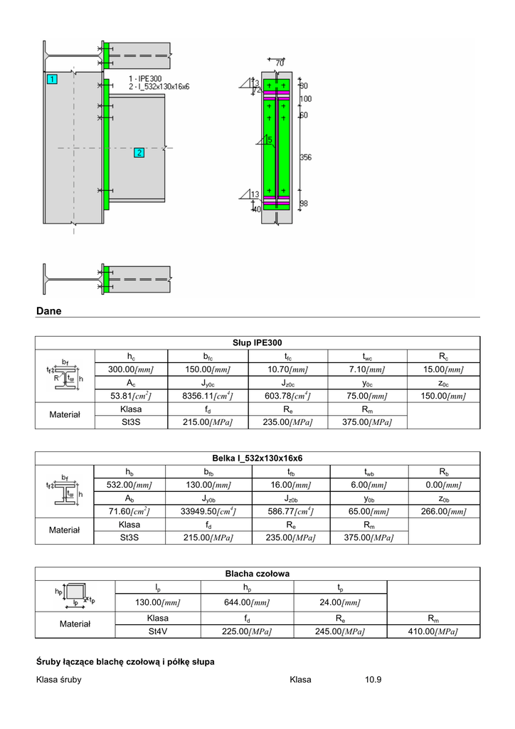 Dane Słup IPE300 hc bfc tfc twc Rc 300.00[mm] 150.00[mm] 10.70[mm] 7.10[mm] 15.00[mm] Ac Jy0c Jz0c y0c z0c 75.00[mm] 150.00[mm] 2 4 53.81[cm ] Materiał 4 8356.11[cm ] 603.78[cm ] Klasa fd Re Rm St3S 215.00[MPa] 235.00[MPa] 375.00[MPa] Belka I_532x130x16x6 hb bfb tfb twb Rb 532.00[mm] 130.00[mm] 16.00[mm] 6.00[mm] 0.00[mm] Ab Jy0b Jz0b y0b z0b 266.00[mm] 2 Materiał 4 4 71.60[cm ] 33949.50[cm ] 586.77[cm ] 65.00[mm] Klasa fd Re Rm St3S 215.00[MPa] 235.00[MPa] 375.00[MPa] Blacha czołowa Materiał lp hp tp 130.00[mm] 644.00[mm] 24.00[mm] Klasa fd Re Rm St4V 225.00[MPa] 245.00[MPa] 410.00[MPa] Śruby łączące blachę czołową i półkę słupa Klasa śruby Klasa 10.9 Granica plastyczności Re = Wytrzymałość na rozciąganie Rm = Średnica śruby d= Średnica otworu dla śruby d0 = Pole powierzchni śruby A= Pole powierzchni czynnej śruby As = Liczba wierszy w= Liczba śrub w wierszach m1=2, m2=2, m3=2, m4=2 Rozstawy pionowe wierszy a`1=100.00[mm], a`2=60.00[mm], a`3=356.00[mm] 940.00 1040.00 20.00 22.00 3.14 2.45 4 [MPa] [MPa] [mm] [mm] [cm2] [cm2] Spoiny Grubość spoin pachwinowych łączących półki belki i blachę czołową Grubość spoin pachwinowych łączących środnik belki i blachę czołową af = 13.00 [mm] aw = 5.00 [mm] Siły Obciążenie obliczeniowe Siła podłużna Nd = Siła poprzeczna Vd = 0.00 100.00 [kN] [kN] 125.000 [kNm] Obciążenie charakterystyczne Siła podłużna Nk = Siła poprzeczna Vk = 0.00 100.00 [kN] [kN] Moment zginający 122.000 [kNm] Moment zginający Md = Mk = Rezultaty Śruby łączące blachę czołową i półkę słupa Nośność śrub Rozciąganie śruby Nośność obliczeniowa w stanie granicznym zerwania trzpienia SRt = min[0.65*Rm*As; 0.85*Re*As] = min[0.65*1040.00[MPa]*2.45[cm2]; 0.85*940.00[MPa]*2.45[cm2]] = 165.62[kN] Nośność ze względu na rozwarcie styku SRr = 0.85*SRt = 0.85*165.62[kN] = 140.78[kN] Scinanie trzpienia śruby Pole ścinanej części śruby 2 2 Av = 0.25*π*d = 0.25*3.142*(20.00[mm]) = 3.14[cm2] Nośność na ścinanie trzpienia SRv = 0.45*m*Rm*Av = 0.45*1*1040.00[MPa]*3.14[cm2] = 147.03[kN] Docisk śruby Docisk śruby do półki słupa a21 = 40.00[mm] a1min = min[ a21 ] = 40.00[mm] Współczynnik zależny od rozstawu śrub α = min[a1min/d; (min[a, a3]/d)-0.75; 2.5] = min[40.00[mm]/20.00[mm]; (min[0.00[mm], 70.00[mm]]/20.00[mm])-0.75; 2.5] = 2.000 | α >0 | 2.000 > 0.000 Nośność obliczeniowa w stanie granicznym uplastycznienia ścianki otworu S Rb = α *fd*d*Σti = 2.000*215.00[MPa]*20.00[mm]*10.70[mm] = 92.02[kN] | | Docisk śruby do blachy a11 = 30.00[mm] a12 = 98.00[mm] a21 = 30.00[mm] a1min = min[ a11; a12; a21 ] = 30.00[mm] Współczynnik zależny od rozstawu śrub α = min[a1min/d; (min[a, a3]/d)-0.75; 2.5] = min[30.00[mm]/20.00[mm]; (min[0.00[mm], 70.00[mm]]/20.00[mm])-0.75; 2.5] = 1.500 || α >0 || 1.500 > 0.000 Nośność obliczeniowa w stanie granicznym uplastycznienia ścianki otworu || Rb S = α *fd*d*Σti = 1.500*225.00[MPa]*20.00[mm]*24.00[mm] = 162.00[kN] || Parametry blachy czołowej Odległość między brzegiem otworu a spoiną lub początkiem zaokrąglenia c = 20.00[mm] Szerokość współdziałania blachy przypadająca na jedną śrubę bs = 0.5*lp = 0.5*130.00[mm] = 65.00[mm] tmin1 = 1.2 *√[ (c*SRt)/(bs*fd) ] = 1.2 * √[ (20.00[mm]*165.62[kN])/(65.00[mm]*225.00[MPa]) ] = 18.06[mm] tmin2 = d * √[Rm/1000] = 20.00[mm] * √[1040.00[MPa]/1000] = 20.26[mm] Minimalna grubość blachy czołowej tmin = max(tmin1, tmin2) = max(18.06[mm]; 20.26[mm]) = 20.26[mm] 3 tp ≥ tmin 3 tp = 24.00[mm] ≥ tmin = 20.26[mm] Współczynnik efektu dzwigni β = 2.67-tp/tmin = 2.67-24.00[mm]/20.26[mm] = 1.486 Nośność na zginanie Stan graniczny nośności Siły w śrubach Rzeczywisty moment zginający M0 = Md= 125.000[kNm] Odległość między osiami półek belki h0 = (hb-tfb)/cos(α) = (532.00[mm]-16.00[mm])/cos(0.00[Deg]) = 516.00[mm] Minimalne ramię działania sił w śrubach zmin = 0.6*h0 = 0.6*516.00[mm] = 309.60[mm] Nr zi zi > zmin 1 z1 = 566.00[mm] 2 z2 = 466.00[mm] 3 z3 = 406.00[mm] 4 z4 = 50.00[mm] Nr mi ωti Wiersz 1 m1 = 2 ωt1 = 0.800 zewnętrzny 2 m2 = 2 ωt2 = 1.000 wewnętrzny 3 m3 = 2 ωt3 = 0.800 środkowy 4 m4 = 2 - wewnętrzny Nośność ze względu na zerwanie śrub MRjd = SRt*Σ(mi*ωti*zi) = SRt * (m1*ωt1*z1 + m2*ωt2*z2 + m3*ωt3*z3) = 165.62[kN] * ( 2*0.800*566.00[mm] + 2*1.000*466.00[mm] + 2*0.800*406.00[mm] ) = 411.930[kNm] |125.000[kNm]| < 411.930[kNm] |M0| ≤ MRjd 0.303 Stan graniczny użytkowalności Siły w śrubach Rzeczywisty moment zginający M0 = Mk= 122.000[kNm] Nr zi zired 1 z1 = 566.00[mm] z1red = z1-hb/6 = 566.00[mm] - 532.00[mm]/6 = 477.33[mm] 2 z2 = 466.00[mm] z2red = z2-hb/6 = 466.00[mm] - 532.00[mm]/6 = 377.33[mm] 3 z3 = 406.00[mm] z3red = z3-hb/6 = 406.00[mm] - 532.00[mm]/6 = 317.33[mm] 4 z4 = 50.00[mm] z4red = z4-hb/6 = 50.00[mm] - 532.00[mm]/6 = -38.67[mm] zi > zmin Nr mi ωri Wiersz 1 m1 = 2 ωr1 = 0.700 zewnętrzny 2 m2 = 2 ωr2 = 1.000 wewnętrzny 3 m3 = 2 ωr3 = 0.800 środkowy 4 m4 = 2 - wewnętrzny Nośność ze względu na rozwarcie styku MRjk = SRr*[ m1*ωr1*z1red + Σ( mi*ωri*zired /z2red ) ] = SRr * [ m1*ωr1*z1red + m2*ωr2*z2red /z2red + m3*ωr3*z3red /z2red ] = 2 2 140.78[kN] * [ 2*0.700*477.33[mm] + 2*1.000*(377.33[mm]) /377.33[mm] + 2*0.800*(317.33[mm]) /377.33[mm] ] = 260.428[kNm] 2 2 2 |122.000[kNm]| < 260.428[kNm] |M0| ≤ MRjk 0.468 Połączenie z żeberkiem usztywniającym Dane Słup IPE300 hc bfc tfc twc Rc 300.00[mm] 150.00[mm] 10.70[mm] 7.10[mm] 15.00[mm] Ac Jy0c Jz0c y0c z0c 150.00[mm] 2 Materiał 4 4 53.81[cm ] 8356.11[cm ] 603.78[cm ] 75.00[mm] Klasa fd Re Rm St3S 215.00[MPa] 235.00[MPa] 375.00[MPa] Belka I_532x130x16x6 hb bfb tfb twb Rb 532.00[mm] 130.00[mm] 16.00[mm] 6.00[mm] 0.00[mm] Ab Jy0b Jz0b y0b z0b 266.00[mm] 2 Materiał 4 4 71.60[cm ] 33949.50[cm ] 586.77[cm ] 65.00[mm] Klasa fd Re Rm St3S 215.00[MPa] 235.00[MPa] 375.00[MPa] Blacha czołowa Materiał lp hp tp 130.00[mm] 644.00[mm] 24.00[mm] Klasa fd Re Rm St4V 225.00[MPa] 