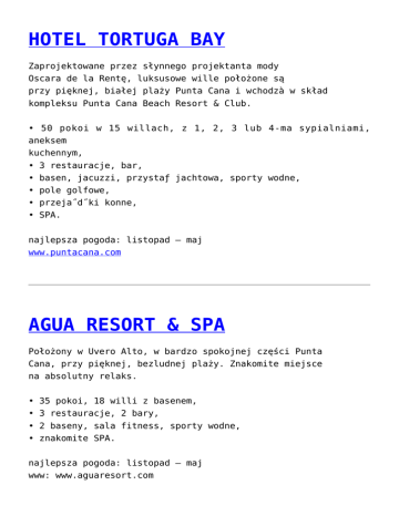HOTEL TORTUGA BAY Zaprojektowane przez słynnego projektanta mody Oscara de la Rentę, luksusowe wille położone są przy pięknej, białej plaży Punta Cana i wchodzà w skład kompleksu Punta Cana Beach Resort & Club. • 50 pokoi w 15 willach, z 1, 2, 3 lub 4-ma sypialniami, aneksem kuchennym, • 3 restauracje, bar, • basen, jacuzzi, przystaƒ jachtowa, sporty wodne, • pole golfowe, • przeja˝d˝ki konne, • SPA. najlepsza pogoda: listopad – maj www.puntacana.com AGUA RESORT & SPA Położony w Uvero Alto, w bardzo spokojnej części Punta Cana, przy pięknej, bezludnej plaży. Znakomite miejsce na absolutny relaks. • • • • 35 pokoi, 18 willi z basenem, 3 restauracje, 2 bary, 2 baseny, sala fitness, sporty wodne, znakomite SPA. najlepsza pogoda: listopad – maj www: www.aguaresort.com SIVORY HOTEL Położony na cudownej plaży Punta Cana, wśród bujnej, tropikalnej roślinności, zapewnia klientom prywatność i wyrafinowany komfort. Ofertę dopełniają ekskluzywne zabiegi spa, prywatna plaża, znakomita kuchnia oraz niezwykle bogata karta win. • • • • 55 luksusowych pokoi z tarasami, 3 restauracje, 3 bary, basen, sala fitness, korty tenisowe, sporty wodne, SPA, lądowisko dla helikopterów. najlepsza pogoda: listopad – maj www.sivorypuntacana.com HOTEL GEEJAM Otoczony bujną roślinnością, egzotycznymi drzewami owocowymi, pobliskimi górami i małymi, pięknymi plażami – ten niewielki hotel powstał pierwotnie jako profesjonalne studio nagrań, dokąd przyjeżdżały takie sławy jak Björk, No Doubt, India czy Common. To znakomity wybór dla ludzi o duszy artystycznej, którzy czuą się obywatelami świata i mają ochotę przeżyć coś oryginalnego. • luksusowy apartament z jacuzzi, 3 bungalowy, • 1 willa z basenem dla 6 osób, • restauracja, bar, • sala fitness, • przejażdżki konne, łowienie ryb, sporty wodne, • SPA. najlepsza pogoda: grudzień – maj www: www.geejamhotel.com HOTEL GOLDENEYE Położony w tropikalnym lesie, w pobliżu małego, spokojnego miasteczka Oracabessa, 20 minut od kurortu Ocho Rios. To właśnie tutaj, w ciszy i spokoju, w pełnej harmonii z naturą, Ian Fleming pisał ksiàżki o Jamesie Bondzie. Małe, błękitne zatoczki, ciepłe wody Morza Karaibskiego oraz romantyczne plaże, zachęcają do spędzania czasu w leniwym, jamajskim rytmie. • Dom Fleminga z 3 sypialniami, basenem, • 3 wille z 1, 2 i 3 sypialniami, • willa Royal Palm z 3 sypialniami, • restauracja, bar, • jogging, spacery, ścieżka zdrowia, obserwacja ptaków, • tenis, kajaki, nurkowanie, łodzie, skutery wodne, windsurfing, • pływanie z delfinami, wycieczki do pobliskich wiosek. najlepsza pogoda: styczeń – maj www.goldeneyehotel.com JAMAIKA INN Położony w pięknej zatoce Ochos Rios, słynie ze znakomitej obsługi, cudownej plaży i pięknych widoków na morze. Rodzicom mogą towarzyszyć dzieci od 12 roku życia. • 47 pokoi z werandą z widokiem na morze, • renomowana restauracja, bar, • basen, sala fitness, • sporty wodne, • rowery górskie, przejażdżki konne, • SPA. najlepsza pogoda: grudzień – kwiecień www: www.jamaicainn.com PINK SANDS RESORT Położony na wyspie Harbour przy wyjątkowo pięknej, jasnoróżowej, szerokiej, piaszczystej plaży. Eleganckie, przestronne bungalowy otoczone są palmami i bujną roślinnością tropikalną. • z • • • • 25 bungalowów z jedną lub dwoma sypialniami i dużym tarasem widokiem na plażą, restauracja, bar, basen, korty tenisowe, łowienie ryb, nurkowanie, wycieczki statkiem na pobliskie wyspy. najlepsza pogoda: listopad – kwiecień www.pinksandsresort.com KAMALAME CAY Malowniczo położony na małej, prywatnej wysepce, obok wyspy Andros. Biała plaża, piękna, tropikalna zieleń oraz znakomite warunki do nurkowania, łowienia ryb i plażowania, to atuty tego miejsca. • • • • • • • 20 bungalowów, 1 willa z czterema sypialniami, restauracja, bar, basen, korty tenisowe, łowienie ryb, wycieczki na pobliskie wyspy, SPA. najlepsza pogoda: listopad – kwiecień www.kamalame.com HOTEL LAS ALAMANDAS Usytuowany nad Oceanem Spokojnym na Costa Alegre w tropikalnej dżungli, pośród białych plaż i błękitnych lagun. Urok i gościnność tego miejsca sprawiły, że czystymi • 6 willi przestronnych i komfortowo wyposażonych dla 2 do 8 osób, • restauracja, bar, • • • • basen, sporty wodne, przejażdżki konne, korty tenisowe, rowery górskie, wspinaczka, wyprawy łodzią, salon piękności, masaże. najlepsza pogoda: październik – maj www.lasalamandas.com CASA NALUM Wspaniała willa położona bezpośrednio przy bezkresnej, dziewiczej, białej plaży na terenie rezerwatu przyrody Sian Kaan, co w języku Majów znaczy – tam, gdzie narodziło się niebo. Ta niezwykła posiadłość le˝y na Półwyspie Jukatańskim, nieopodal Tulum – miasta Majów malowniczo położonego na klifie. Pobyt w willi uprzyjemnia obsługa, która stara się sprostać wszystkim życzeniom gości. Wyśmienite dania przygotowywane są przez znakomitego kucharza, egzotyczne napoje serwowane są o każdej porze dnia, a oprócz tego obsługa organizuje wycieczki, wyprawy żaglówką, nurkowanie na rafie, masaże. • • • • 3 sypialnie, duży living, przestronna jadalnia, duże tarasy i balkony. najlepsza pogoda: listopad – kwiecień www.nalum.com