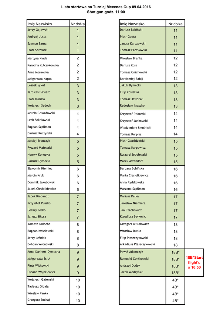 Lista startowa na Turniej Mecenas Cup 09.04.2016 Shot gun godz. 11:00 Imię Nazwisko Jerzy Gajewski Nr dołka Imię Nazwisko Nr dołka 1 Dariusz Bobiński 11 Andrzej Justa 1 Piotr Goetz 11 Szymon Sarna 1 Janusz Karczewski 11 Piotr Serbiński 1 Tomasz Paczkowski 11 Martyna Kinda 2 Mirosław Brańka 12 Karolina Kulczykowska 2 Dariusz Koss 12 Anna Morawska 2 Tomasz Onichowski 12 Małgorzata Kapsa 2 Bartłomiej Babij 12 Leszek Sykut 3 Jakub Dymecki 13 Jarosław Szwarc 3 Filip Kowalski 13 Piotr Malissa 3 Tomasz Jaworski 13 Wojciech Sadoch 3 Radosław Iwaszko 13 Marcin Gniazdowski 4 Krzysztof Piskorski 14 Lech Sokołowski 4 Krzysztof Jankowski 14 Bogdan Szpilman 4 Włodzimierz Smolnicki 14 Dariusz Kuczyński 4 Tomasz Kurpisz 14 Maciej Brończyk 5 Piotr Gwoździński 15 Ryszard Majewski 5 Tomasz Karpowicz 15 Henryk Konopka 5 Ryszard Sobolewski 15 Dariusz Dymecki 5 Marek Aszendorf 15 Sławomir Niemiec 6 Barbara Bobińska 16 Marcin Kruk 6 Marta Ciesiołkiewicz 16 Dominik Jakubowski 6 Anna Rydzkowska 16 Jacek Ciesiołkiewicz 6 Marzena Szpilman 16 Jacek Riebandt 7 Mariusz Pełka 17 Krzysztof Puszko 7 Jarosław Niemiera 17 Cezary Łosko 7 Jan Czachowicz 17 Janusz Sikora 7 Klaudiusz Sevkovic 17 Tomasz Ładocha 8 Grzegorz Misiałowicz 18 Bogdan Kisielewski 8 Mirosław Dutko 18 Jerzy Leśniak 8 Filip Płaszczykowski 18 Bohdan Wronowski 8 Arkadiusz Płaszczykowski 18 Anna Steinert-Dymecka 9 Paweł Adamczyk 18B* Małgorzata Ścisk 9 Romuald Centkowski 18B* Piotr Witkowski 9 Andrzej Dudek 18B* Oksana Wojtkiewicz 9 Jacek Wodzyński 18B* Wojciech Gajewski 10 4B* Tadeusz Gibała 10 4B* Wiesław Pańka 10 4B* Grzegorz Sochaj 10 4B* 18B*Start flight'u o 10:50