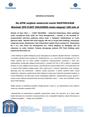 INFORMACJA PRASOWA Na GPW wejdzie właściciel marki MASTERLEASE Wartość IPO FLEET HOLDINGS moŜe sięgnąć 100 mln zł Gdańsk 15 lipca 2011 r. – FLEET HOLDINGS – właściciel Masterlease, lidera polskiego rynku zarządzania flotą (CFM Car Fleet Management) – planuje w III kwartale br. przeprowadzić pierwszą publiczną ofertę akcji, a następnie zadebiutować na rynku głównym GPW. Wartość IPO moŜe sięgnąć 100 mln zł. Grupa Fleet Holdings, świadcząca usługi pod marką „Masterlease” jest właścicielem spółek Futura Leasing S.A., Masterlease Sp. z o.o. oraz Prime Car Management S.A., której obligacje od ubiegłego roku są notowane na rynku Catalyst. Funkcję oferującego podczas IPO Fleet Holdings pełni Copernicus Securities S.A. -„Fleet Holdings to spółka holdingowa grupy zajmującej się wynajmem długoterminowym i leasingiem, w jej skład wchodzą Futura Leasing S.A., Masterlease Sp. z o.o. oraz Prime Car Management S.A. Ten ostatni podmiot jest juŜ znany polskim inwestorom instytucjonalnym, poniewaŜ w 2010 roku uplasowaliśmy emisję jego obligacji komercyjnych o wartości 534 mln zł. Był to debiut o największej wartości na rynku obligacji komercyjnych, wyemitowanych przez prywatne firmy. W konsekwencji dziś w ramach Fleet Holdings działają spółki, które wiodą prym w róŜnych segmentach rynku leasingu, generując przy tym powtarzalne i stabilnie rosnące przychody. Z punktu widzenia historii naszej działalności, traktujemy upublicznienie Fleet Holdings nie tylko jako moŜliwość pozyskania środków na rozwój Masterlease, ale takŜe jako czynnik zwiększający stabilność i bezpieczeństwo grupy, głównie z uwagi na duŜo większą transparentność dla innych podmiotów rynku.” – mówi Jerzy Kobyliński, Prezes Grupy Fleet Holdings. Spółka szacuje, Ŝe publikacja prospektu nastąpi jeszcze w lipcu br., po zatwierdzeniu przez właściwy urząd oraz uzyskaniu paszportu KNF. -„Bezpośrednio po zatwierdzeniu prospektu rozpoczniemy ofertę. Nie ukrywam, Ŝe w duŜej części będzie kierowana do inwestorów instytucjonalnych, ale o szczegółach będziemy mogli informować po publikacji prospektu.” – dodaje Jerzy Kobyliński. Masterlease Spółka z o. o. 80-308 Gdańsk, ul. Polanki 4 NIP 584-26-99-948 KRS nr 0000362287 Sąd Rejonowy Gdańsk-Północ w Gdańsku Kapitał zakładowy 7 905 000 zł Futura Leasing Spółka Akcyjna 80-308 Gdańsk, ul. Polanki 4 NIP 584-10-27-454, KRS nr 0000069348 Sąd Rejonowy Gdańsk-Północ w Gdańsku Kapitał zakładowy i wpłacony 1 689 320 zł Prime Car Management Spółka Akcyjna 80-308 Gdańsk, ul. Polanki 4 NIP 957-07-53-221, KRS nr 0000013870 Sąd Rejonowy Gdańsk-Północ w Gdańsku Kapitał zakładowy i wpłacony 15 999 500 zł STRUKTURA GRUPY FLEET HOLDINGS Fleet Holdings 100% 100% FL PCM 36.75% 63.25% ML AKCJONARIAT FLEET HOLDINGS Właścicielem Fleet Holdings, posiadającym 100% udziałów w kapitale zakładowym (przed IPO) jest spółka Fleet Uno S.a.r.l. - spółka zaleŜna Abris CEE Mid-Market Fund Limited Partnership z siedzibą na wyspie Jersey w Wielkiej Brytanii. Abris CEE posiada 78,74% udziałów w kapitale zakładowym i głosach Fleet Uno, drugim akcjonariuszem z udziałem powyŜej 5% jest QIC Private Equity Fund (11,51%). STRATEGIA ROZWOJU GRUPY FLEET HOLDINGS Strategia rozwoju Grupy Fleet Holdings zakłada zarówno rozwój organiczny jak i rozwój przez akwizycje, co pozwoli na utrzymanie i dalsze wzmocnienie jej pozycji jako wiodącego operatora sektora Car Fleet Management w Polsce, a takŜe na dynamiczny rozwój na rynkach zagranicznych. W ramach rozwoju organicznego Grupa zamierza skoncentrować się na następujących obszarach: • Produkty i usługi - zwiększanie udziału produktów złoŜonych w portfelu Spółki (koncentracja na produktach FSL oraz semi FSL) oraz rozwój nowych produktów i usług przeznaczonych dla sektora MŚP; Masterlease Spółka z o. o. 80-308 Gdańsk, ul. Polanki 4 NIP 584-26-99-948 KRS nr 0000362287 Sąd Rejonowy Gdańsk-Północ w Gdańsku Kapitał zakładowy 7 905 000 zł Futura Leasing Spółka Akcyjna 80-308 Gdańsk, ul. Polanki 4 NIP 584-10-27-454, KRS nr 0000069348 Sąd Rejonowy Gdańsk-Północ w Gdańsku Kapitał zakładowy i wpłacony 1 689 320 zł Prime Car Management Spółka Akcyjna 80-308 Gdańsk, ul. Polanki 4 NIP 957-07-53-221, KRS nr 0000013870 Sąd Rejonowy Gdańsk-Północ w Gdańsku Kapitał zakładowy i wpłacony 15 999 500 zł • SprzedaŜ i dystrybucja - dalszy rozwój współpracy z GM, Hyundai i SEAT, uruchomienie kolejnych programów typu private label, budowanie bardzo silnego portfela nowych klientów korporacyjnych; • Efektywność biznesu - zwiększanie przychodów generowanych z obecnej bazy klientów, wprowadzanie nowych produktów, budowanie marki i intensyfikacja działań PR; • Poprawa efektywności - zdywersyfikowanie źródła finansowania, zmniejszenie kosztów zewnętrznych, zwiększanie wykorzystania dźwigni finansowej, poprawa efektywności operacyjnej i rentowności poprzez zwiększenie skali działania. W ramach planów ekspansji, strategia Fleet Holdings zakłada rozwój działalności na rynkach mniej rozwiniętych w zakresie usługi Full Service Leasing, tj. (za wyjątkiem Czech) Bułgarię, Estonię, Węgry, Litwę i Łotwę, Rumunię, Słowację i Słowenię. Przy czym w zaleŜności od potencjału lokalnych marek, przejmowana działalność będzie prowadzona w oparciu o lokalne brandy lub markę „Masterlease” -„Ekspansja geograficzna pozwoli na dywersyfikację ryzyka prowadzenia działalności w oparciu o gospodarkę jednego kraju oraz pozwoli na bardziej efektywne wykorzystanie potencjału Grupy wynikające z efektu skali.” - mówi Jerzy Kobyliński, Prezes Grupy Fleet Holdings. WYBRANE DANE FINANSOWE FLEET HOLDINGS (w tys. PLN) w latach 2009-2010 RACHUNEK ZYSKÓW I STRAT 2009 2010 2010 (PLN’000) (połączone)* (połączone)* (skonsolidowane)^ Przychody 434 632,78 457
