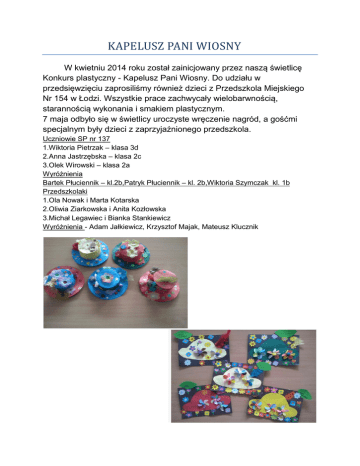 KAPELUSZ PANI WIOSNY W kwietniu 2014 roku został zainicjowany przez naszą świetlicę Konkurs plastyczny - Kapelusz Pani Wiosny. Do udziału w przedsięwzięciu zaprosiliśmy również dzieci z Przedszkola Miejskiego Nr 154 w Łodzi. Wszystkie prace zachwycały wielobarwnością, starannością wykonania i smakiem plastycznym. 7 maja odbyło się w świetlicy uroczyste wręczenie nagród, a gośćmi specjalnym były dzieci z zaprzyjaźnionego przedszkola. Uczniowie SP nr 137 1.Wiktoria Pietrzak – klasa 3d 2.Anna Jastrzębska – klasa 2c 3.Olek Wirowski – klasa 2a Wyróżnienia Bartek Płuciennik – kl.2b,Patryk Płuciennik – kl. 2b,Wiktoria Szymczak kl. 1b Przedszkolaki 1.Ola Nowak i Marta Kotarska 2.Oliwia Ziarkowska i Anita Kozłowska 3.Michał Legawiec i Bianka Stankiewicz Wyróżnienia - Adam Jałkiewicz, Krzysztof Majak, Mateusz Klucznik