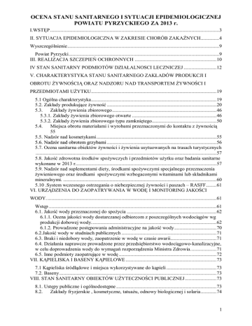 OCENA STANU SANITARNEGO I SYTUACJI EPIDEMIOLOGICZNEJ POWIATU PYRZYCKIEGO ZA 2013 r. I.WSTĘP ................................................................................................................................3 II. SYTUACJA EPIDEMIOLOGICZNA W ZAKRESIE CHORÓB ZAKAŹNYCH ..............4 Wyszczególnienie ...................................................................................................................9 Powiat Pyrzycki ..................................................................................................................9 III. REALIZACJA SZCZEPIEŃ OCHRONNYCH .............................................................. 10 IV STAN SANITARNY PODMIOTÓW DZIAŁALNOSCI LECZNICZEJ ......................... 12 V. CHARAKTERYSTYKA STANU SANITARNEGO ZAKŁADÓW PRODUKCJI I OBROTU ŻYWNOŚCIĄ ORAZ NADZORU NAD TRANSPORTEM ŻYWNOŚCI I PRZEDMIOTAMI UŻYTKU ............................................................................................... 19 5.1 Ogólna charakterystyka............................................................................................... 19 5.2. Zakłady produkujące żywność ................................................................................... 20 5.3. Zakłady żywienia zbiorowego ............................................................................... 46 5.3.1. Zakłady żywienia zbiorowego otwarte ................................................................ 46 5.3.2. Zakłady żywienia zbiorowego typu zamkniętego................................................. 50 5.4. Miejsca obrotu materiałami i wyrobami przeznaczonymi do kontaktu z żywnością 55 5.5. Nadzór nad kosmetykami ........................................................................................... 55 5.6. Nadzór nad obrotem grzybami ................................................................................... 56 5.7. Ocena sanitarna obiektów żywności i żywienia usytuowanych na trasach turystycznych ......................................................................................................................................... 57 5.8. Jakość zdrowotna środków spożywczych i przedmiotów użytku oraz badania sanitarne wykonane w 2013 r........................................................................................................... 57 5.9. Nadzór nad suplementami diety, środkami spożywczymi specjalnego przeznaczenia żywieniowego oraz środkami spożywczymi wzbogaconymi witaminami lub składnikami mineralnymi. .................................................................................................................... 60 5.10 .System wczesnego ostrzegania o niebezpiecznej żywności i paszach – RASFF ........ 61 VI. URZĄDZENIA DO ZAOPATRYWANIA W WODĘ I MONITORING JAKOŚCI WODY. ................................................................................................................................ 61 Wstęp ............................................................................................................................... 61 6.1. Jakość wody przeznaczonej do spożycia .................................................................... 62 6.1.1. Ocena jakości wody dostarczanej odbiorcom z poszczególnych wodociągów wg produkcji dobowej wody. .............................................................................................. 62 6.1.2. Prowadzone postępowania administracyjne na jakość wody ................................ 70 6.2.Jakość wody w studniach publicznych ........................................................................ 71 6.3. Braki i niedobory wody, zaopatrzenie w wodę w czasie awarii................................... 71 6.4. Działania naprawcze prowadzone przez przedsiębiorstwo wodociągowo-kanalizacyjne, w celu doprowadzenia wody do wymagań rozporządzenia Ministra Zdrowia. ................... 71 6.5. Inne podmioty zaopatrujące w wodę .......................................................................... 72 VII. KĄPIELISKA I BASENY KĄPIELOWE ..................................................................... 73 7.1 Kąpieliska śródlądowe i miejsca wykorzystywane do kąpieli ...................................... 73 7.2. Baseny ....................................................................................................................... 73 VIII. STAN SANITARNY OBIEKTÓW UŻYTECZNOŚCI PUBLICZNEJ ........................ 73 8.1. Ustępy publiczne i ogólnodostępne ............................................................................ 73 8.2. Zakłady fryzjerskie , kosmetyczne, tatuażu, odnowy biologicznej i solaria ............ 74 1 OCENA STANU SANITARNEGO I SYTUACJI EPIDEMIOLOGICZNEJ POWIATU PYRZYCKIEGO ZA 2013 r. Zakłady fryzjerskie ....................................................................................................... 74 Zakłady kosmetyczne..................................................................................................... 75 Zakłady tatuażu ............................................................................................................ 75 Zakłady odnowy biologicznej ........................................................................................ 75 Inne zakłady, w których świadczone są łącznie więcej niż jedna z usług fryzjerskie, kosmetyczne, tatuażu i odnowy biologicznej. ................................................................. 75 8.3. Obiekty komunikacji publicznej ................................................................................. 76 8.3.1. Dworce i stacje kolejowe..................................................................................... 76 8.3.2. Dworce i przystanki PKS .................................................................................... 76 8.4. Parkingi .................................................................................................................