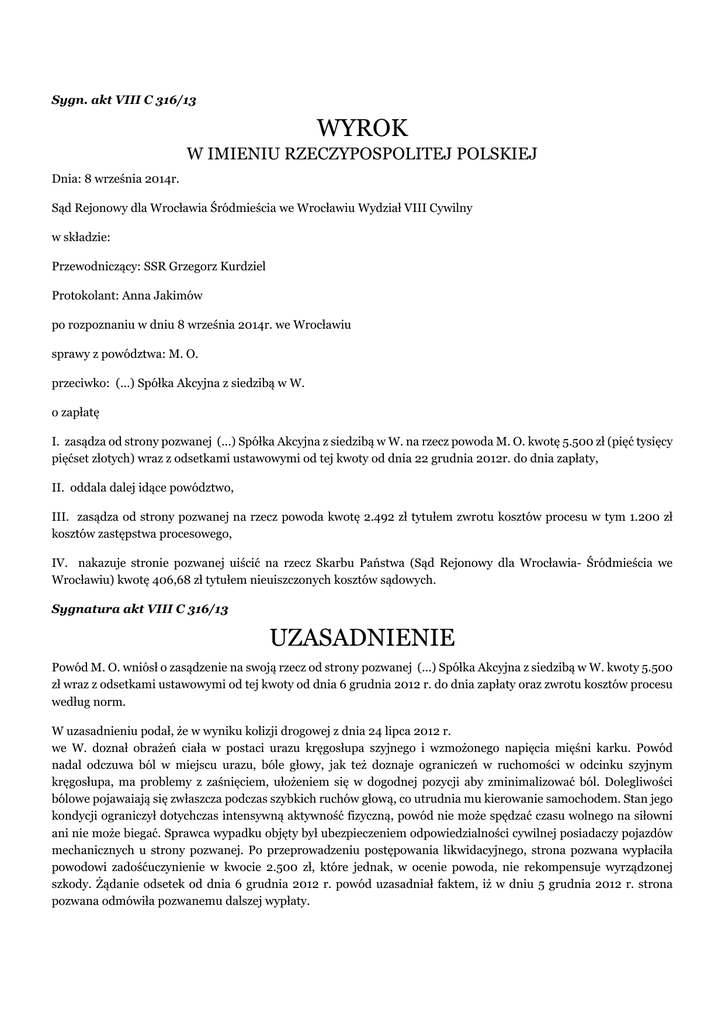 Sygn. akt VIII C 316/13 WYROK W IMIENIU RZECZYPOSPOLITEJ POLSKIEJ Dnia: 8 września 2014r. Sąd Rejonowy dla Wrocławia Śródmieścia we Wrocławiu Wydział VIII Cywilny w składzie: Przewodniczący: SSR Grzegorz Kurdziel Protokolant: Anna Jakimów po rozpoznaniu w dniu 8 września 2014r. we Wrocławiu sprawy z powództwa: M. O. przeciwko: (...) Spółka Akcyjna z siedzibą w W. o zapłatę I. zasądza od strony pozwanej (...) Spółka Akcyjna z siedzibą w W. na rzecz powoda M. O. kwotę 5.500 zł (pięć tysięcy pięćset złotych) wraz z odsetkami ustawowymi od tej kwoty od dnia 22 grudnia 2012r. do dnia zapłaty, II. oddala dalej idące powództwo, III. zasądza od strony pozwanej na rzecz powoda kwotę 2.492 zł tytułem zwrotu kosztów procesu w tym 1.200 zł kosztów zastępstwa procesowego, IV. nakazuje stronie pozwanej uiścić na rzecz Skarbu Państwa (Sąd Rejonowy dla Wrocławia- Śródmieścia we Wrocławiu) kwotę 406,68 zł tytułem nieuiszczonych kosztów sądowych. Sygnatura akt VIII C 316/13 UZASADNIENIE Powód M. O. wniósł o zasądzenie na swoją rzecz od strony pozwanej (...) Spółka Akcyjna z siedzibą w W. kwoty 5.500 zł wraz z odsetkami ustawowymi od tej kwoty od dnia 6 grudnia 2012 r. do dnia zapłaty oraz zwrotu kosztów procesu według norm. W uzasadnieniu podał, że w wyniku kolizji drogowej z dnia 24 lipca 2012 r. we W. doznał obrażeń ciała w postaci urazu kręgosłupa szyjnego i wzmożonego napięcia mięśni karku. Powód nadal odczuwa ból w miejscu urazu, bóle głowy, jak też doznaje ograniczeń w ruchomości w odcinku szyjnym kręgosłupa, ma problemy z zaśnięciem, ułożeniem się w dogodnej pozycji aby zminimalizować ból. Dolegliwości bólowe pojawaiają się zwłaszcza podczas szybkich ruchów głową, co utrudnia mu kierowanie samochodem. Stan jego kondycji ograniczył dotychczas intensywną aktywność fizyczną, powód nie może spędzać czasu wolnego na siłowni ani nie może biegać. Sprawca wypadku objęty był ubezpieczeniem odpowiedzialności cywilnej posiadaczy pojazdów mechanicznych u strony pozwanej. Po przeprowadzeniu postępowania likwidacyjnego, strona pozwana wypłaciła powodowi zadośćuczynienie w kwocie 2.500 zł, które jednak, w ocenie powoda, nie rekompensuje wyrządzonej szkody. Żądanie odsetek od dnia 6 grudnia 2012 r. powód uzasadniał faktem, iż w dniu 5 grudnia 2012 r. strona pozwana odmówiła pozwanemu dalszej wypłaty. W odpowiedzi na pozew strona pozwana wniosła o oddalenie powództwa i zasądzenie kosztów procesu, w tym kosztów zastępstwa procesowego w kwocie 1.200 zł. Nie kwestionując zasadniczo swej odpowiedzialności za skutki wypadku, pozwana podniosła, że wypłacona powodowi kwota 2.500 zł tytułem zadośćuczynienia jest odpowiednia w stosunku do doznanej krzywdy. Zarzuciła też, że w przypadku uwzględnienia żądania głownego zasądzone odsetki powinny być liczone od dnia poprzedzającego wyrokowanie lub od dnia wyrokowania. Sąd ustalił nastepujący stan faktyczny: W dniu 24 lipca 2012 r. we W. powód, kierując samochodem, uczestniczył w kolizji drogowej, której sprawcą był kierowca innego samochodu D. M., objety ubezpieczeniem odpowiedzialności cywilnej posiadaczy pojazdów mechanicznych u strony pozwanej. bezsporne Powód w wyniku wypadku przebył przyśpieszeniowo – opóźnieniowy uraz kręgosłupa szyjnego definiowany jako uszkodzenie kręgosłupa szyjnego spowodowane siłami wywołującymi nagłe przyspieszenie lub opóźnienie ruchu szyi i głowy w stosunku do klatki piersiowej, powodujący powstanie zmian w zakresie aparatu mięśniowo – więzadłowego kręgosłupa. W okresie od 27 lipca 2012 r. do 8 października 2012 r. powód korzystał ze zwolnienia lekarskiego. Leczony był zachowawczo w trybie ambulatoryjnym w poradni ortopedycznej, neurologicznej i laryngologicznej. W wypadku powód doznał urazu głowy w okolicy skroniowej lewej i urazu skrętnego kręgosłupa szyjnego. W dniu zdarzenia po wypadku powód zaczął odczuwać nudności, bóle i zawroty głowy, nadto podawał uczucie „zatkania prawego ucha“ i drętwienia palców prawej dłoni. Zgłosił się do Szpitalnego Oddziału Ratunkowego Szpitala we W. gdzie wykonano badanie rtg, stwierdzono u niego skręcenie odcinka szyjnego kręgosłupa z przeciążeniem mięśni karku i zalecono mu noszenie kołnierza ortopedycznego przez 5-6 tygodni i stosowanie leków przeciwbólowych. Badanie diagnostycznie z dnia 24 lipca 2012 r. wykazało odprostowanie fizjologicznej lordozy szyjnej i niewielkie zwężenie szczeliny międzykręgowej C2/C3. Stwierdzono stan po skręceniu kregosłupa szyjnego i pourazowy przykręgosłupowy zespół bólowy w zakresie zgięcia i rotacji w lewo z dodatnimi objawami korzeniowymi. Krótko po wypadku ubytek rotacji w lewo wynosił 15 stopni, ponadto istniała tkliwość przestrzeni międzykolczystych szyjnych ze wzmożeniem napięcia mięśni przykręgosłupowych po lewej stronie, która zanikła przed konsultacją neurologiczną w dniu 11 września 2012 r., natomiast nadal utrzymywało się bólowe ograniczenie ruchomości w odcinku szyjnym przy próbie biernego przodozgięcia. Badanie rtg z 5 wrzesnia 2012 r. wykazało niewielką niestabilność na wysokości odcinka kręgosłupa C2-C3-C4 w przodopochyleniu oraz C2-C3 w tyłoodchyleniu. W dniu 19 października 2012 r. lekarz ortopeda uznał leczenie za zakończone, z zaleceniem rehabilitacji z uwagi na utrzymujące się nadal dolegliwości bólowe i wzmożone napięcie mięśni w okolicy urazu. Neurolog stwierdził u powoda promieniujące bóle do barków i ramion, niewielką niedoczulicę przedramienia prawego i zalecił kontrolę laryngologiczną. W dniu 21 sierpnia 2012 r. nadal występowała ograniczona ruchomość czynna i bierna w odcinku szyjnym, nadto stwierdzono dodatki objaw C. po lewej stronie. Zalecono dalsze przyjmowanie leków M., M. forte, N., Magnez-B6. Badania laryngologiczne w dniach 31 lipca 2012 r. i 1 