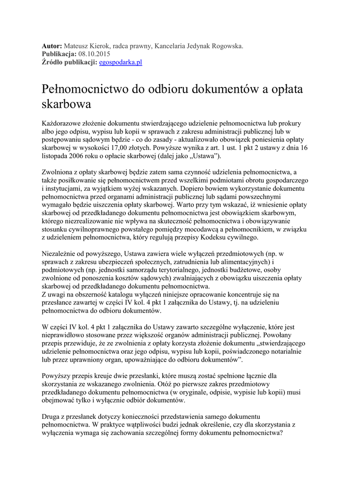 Autor: Mateusz Kierok, radca prawny, Kancelaria Jedynak Rogowska. Publikacja: 08.10.2015 Źródło publikacji: egospodarka.pl Pełnomocnictwo do odbioru dokumentów a opłata skarbowa Każdorazowe złożenie dokumentu stwierdzającego udzielenie pełnomocnictwa lub prokury albo jego odpisu, wypisu lub kopii w sprawach z zakresu administracji publicznej lub w postępowaniu sądowym będzie - co do zasady - aktualizowało obowiązek poniesienia opłaty skarbowej w wysokości 17,00 złotych. Powyższe wynika z art. 1 ust. 1 pkt 2 ustawy z dnia 16 listopada 2006 roku o opłacie skarbowej (dalej jako „Ustawa”). Zwolniona z opłaty skarbowej będzie zatem sama czynność udzielenia pełnomocnictwa, a także posiłkowanie się pełnomocnictwem przed wszelkimi podmiotami obrotu gospodarczego i instytucjami, za wyjątkiem wyżej wskazanych. Dopiero bowiem wykorzystanie dokumentu pełnomocnictwa przed organami administracji publicznej lub sądami powszechnymi wymagało będzie uiszczenia opłaty skarbowej. Warto przy tym wskazać, iż wniesienie opłaty skarbowej od przedkładanego dokumentu pełnomocnictwa jest obowiązkiem skarbowym, którego niezrealizowanie nie wpływa na skuteczność pełnomocnictwa i obowiązywanie stosunku cywilnoprawnego powstałego pomiędzy mocodawcą a pełnomocnikiem, w związku z udzieleniem pełnomocnictwa, który regulują przepisy Kodeksu cywilnego. Niezależnie od powyższego, Ustawa zawiera wiele wyłączeń przedmiotowych (np. w sprawach z zakresu ubezpieczeń społecznych, zatrudnienia lub alimentacyjnych) i podmiotowych (np. jednostki samorządu terytorialnego, jednostki budżetowe, osoby zwolnione od ponoszenia kosztów sądowych) zwalniających z obowiązku uiszczenia opłaty skarbowej od przedkładanego dokumentu pełnomocnictwa. Z uwagi na obszerność katalogu wyłączeń niniejsze opracowanie koncentruje się na przesłance zawartej w części IV kol. 4 pkt 1 załącznika do Ustawy, tj. na udzieleniu pełnomocnictwa do odbioru dokumentów. W części IV kol. 4 pkt 1 załącznika do Ustawy zawarto szczególne wyłączenie, które jest nieprawidłowo stosowane przez większość organów administracji publicznej. Powołany przepis przewiduje, że ze zwolnienia z opłaty korzysta złożenie dokumentu „stwierdzającego udzielenie pełnomocnictwa oraz jego odpisu, wypisu lub kopii, poświadczonego notarialnie lub przez uprawniony organ, upoważniające do odbioru dokumentów”. Powyższy przepis kreuje dwie przesłanki, które muszą zostać spełnione łącznie dla skorzystania ze wskazanego zwolnienia. Otóż po pierwsze zakres przedmiotowy przedkładanego dokumentu pełnomocnictwa (w oryginale, odpisie, wypisie lub kopii) musi obejmować tylko i wyłącznie odbiór dokumentów. Druga z przesłanek dotyczy konieczności przedstawienia samego dokumentu pełnomocnictwa. W praktyce wątpliwości budzi jednak określenie, czy dla skorzystania z wyłączenia wymaga się zachowania szczególnej formy dokumentu pełnomocnictwa? Pełnomocnictwo Każdorazowe złożenie dokumentu stwierdzającego udzielenie pełnomocnictwa lub prokury albo jego odpisu, wypisu lub kopii w sprawach z zakresu administracji publicznej lub w postępowaniu sądowym będzie - co do zasady - aktualizowało obowiązek poniesienia opłaty skarbowej w wysokości 17,00 złotych. Organy administracji często wymagają, aby dla skorzystania z omawianego zwolnienia, odpowiednią formę zachował nawet oryginał pełnomocnictwa, tj. został poświadczony notarialnie (odpowiednio przez uprawniony organ), odmawiając skuteczności zwykłej formie pisemnej przedkładanego oryginału dokumentu. Takie stanowisko zostało zaprezentowane także przez Podsekretarza Stanu Ministra Finansów w piśmie z dnia 30 października 2013 roku stanowiącym odpowiedź na zapytanie Marszałka Senatu Rzeczypospolitej Polskiej. Należy jednak zauważyć, iż taka interpretacja prowadzi do absurdalnych wniosków. Często w obrocie prawnym pełnomocnictwa udzielane są w formie aktu notarialnego. Czynność poświadczenia notarialnego (odpowiednio przez uprawniony organ) jest instytucjonalnie odrębna od sporządzenia aktu notarialnego, na co wprost wskazuje art. 79 pkt 1 i 2 ustawy z dnia 14 lutego 2001 roku Prawo o notariacie, a także oddział 3 rozporządzenia Ministra Sprawiedliwości z dnia 28 czerwca 2004 roku w sprawie maksymalnych stawek notarialnych. Przyjmując zaś powyższą logikę organów administracji, dla możliwości skorzystania z wyłączenia określonego w części IV kol. 4 pkt 1 załącznika do Ustawy, również oryginalne pełnomocnictwo udzielone w formie aktu notarialnego wymagałoby dodatkowego, odrębnego poświadczenia przez notariusza lub uprawniony organ. Nie sposób zgodzić się z tego typu argumentacją. Zgodnie z ugruntowanym orzecznictwem sądów administracyjnych dla skorzystania z omawianego zwolnienia wystarczające jest posiłkowanie się oryginałem pełnomocnictwa w formie pisemnej (zgodnie z art. 99 § 2 Kodeksu cywilnego). Kwestia poświadczeń powinna być odnoszona tylko i wyłącznie do odpisów, wypisów lub kopii pełnomocnictwa. Tylko tego typu stanowisko pozwala zachować racjonalność badanego przepisu, przy jednoczesnej obronie celu tej regulacji. Na powyższe zwrócił uwagę Wojewódzki Sąd Administracyjny w Warszawie w wyroku z dnia 20 listopada 2011 roku (sygn. akt VIII SA/Wa 890/10), wskazując, iż: „spełnienie tylko jednej przesłanki, to jest upoważnienie tylko do odbioru dokumentów, nie pozwala na zastosowanie zwolnienia, o ile nie występuje przesłanka w postaci złożenia dokumentu w oryginale lub w postaci poświadczonej notarialnie lub przez upoważniony organ kopii, odpisu lub wyciągu”. Podsumowując, złożenie przed organem administracji publicznej lub sądem oryginału dokumentu pełnomocnictwa udzielonego w zwykłej formie pisemnej, które upoważniać będzie tylko do odbioru dokumentów (lub poświadczonej notarialnej kopii takiego 
