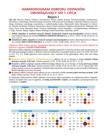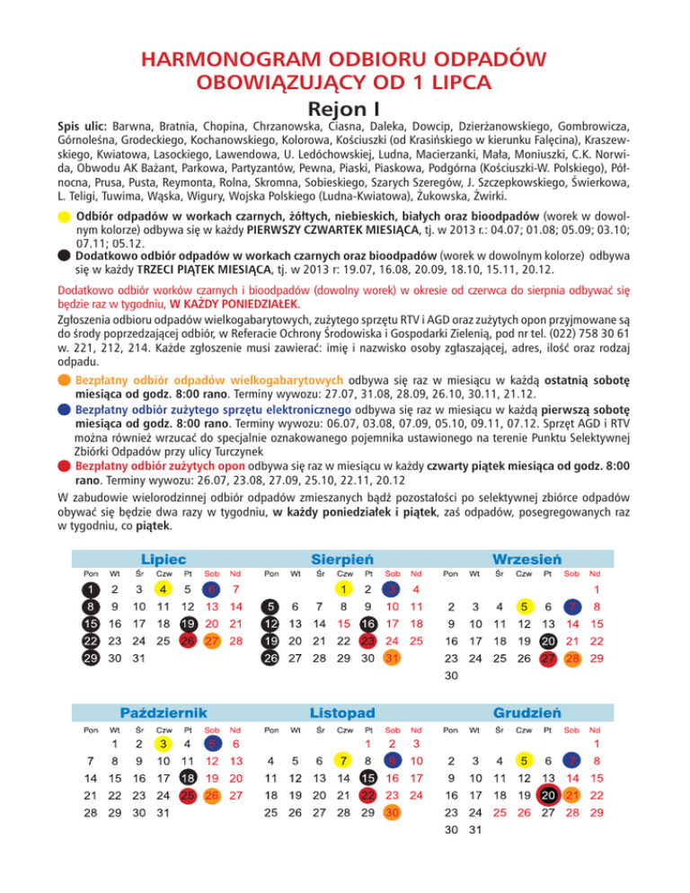 HARMONOGRAM ODBIORU ODPADÓW OBOWIĄZUJĄCY OD 1 LIPCA Rejon I Spis ulic: Barwna, Bratnia, Chopina, Chrzanowska, Ciasna, Daleka, Dowcip, Dzierżanowskiego, Gombrowicza, Górnoleśna, Grodeckiego, Kochanowskiego, Kolorowa, Kościuszki (od Krasińskiego w kierunku Falęcina), Kraszewskiego, Kwiatowa, Lasockiego, Lawendowa, U. Ledóchowskiej, Ludna, Macierzanki, Mała, Moniuszki, C.K. Norwida, Obwodu AK Bażant, Parkowa, Partyzantów, Pewna, Piaski, Piaskowa, Podgórna (Kościuszki-W. Polskiego), Północna, Prusa, Pusta, Reymonta, Rolna, Skromna, Sobieskiego, Szarych Szeregów, J. Szczepkowskiego, Świerkowa, L. Teligi, Tuwima, Wąska, Wigury, Wojska Polskiego (Ludna-Kwiatowa), Żukowska, Żwirki. Odbiór odpadów w workach czarnych, żółtych, niebieskich, białych oraz bioodpadów (worek w dowolnym kolorze) odbywa się w każdy PIERWSZY CZWARTEK MIESIĄCA, tj. w 2013 r.: 04.07; 01.08; 05.09; 03.10; 07.11; 05.12. Dodatkowo odbiór odpadów w workach czarnych oraz bioodpadów (worek w dowolnym kolorze) odbywa się w każdy TRZECI PIĄTEK MIESIĄCA, tj. w 2013 r: 19.07, 16.08, 20.09, 18.10, 15.11, 20.12. Dodatkowo odbiór worków czarnych i bioodpadów (dowolny worek) w okresie od czerwca do sierpnia odbywać się będzie raz w tygodniu, W KAŻDY PONIEDZIAŁEK. Zgłoszenia odbioru odpadów wielkogabarytowych, zużytego sprzętu RTV i AGD oraz zużytych opon przyjmowane są do środy poprzedzającej odbiór, w Referacie Ochrony Środowiska i Gospodarki Zielenią, pod nr tel. (022) 758 30 61 w. 221, 212, 214. Każde zgłoszenie musi zawierać: imię i nazwisko osoby zgłaszającej, adres, ilość oraz rodzaj odpadu. Bezpłatny odbiór odpadów wielkogabarytowych odbywa się raz w miesiącu w każdą ostatnią sobotę miesiąca od godz. 8:00 rano. Terminy wywozu: 27.07, 31.08, 28.09, 26.10, 30.11, 21.12. Bezpłatny odbiór zużytego sprzętu elektronicznego odbywa się raz w miesiącu w każdą pierwszą sobotę miesiąca od godz. 8:00 rano. Terminy wywozu: 06.07, 03.08, 07.09, 05.10, 09.11, 07.12. Sprzęt AGD i RTV można również wrzucać do specjalnie oznakowanego pojemnika ustawionego na terenie Punktu Selektywnej Zbiórki Odpadów przy ulicy Turczynek Bezpłatny odbiór zużytych opon odbywa się raz w miesiącu w każdy czwarty piątek miesiąca od godz. 8:00 rano. Terminy wywozu: 26.07, 23.08, 27.09, 25.10, 22.11, 20.12 W zabudowie wielorodzinnej odbiór odpadów zmieszanych bądź pozostałości po selektywnej zbiórce odpadów obywać się będzie dwa razy w tygodniu, w każdy poniedziałek i piątek, zaś odpadów, posegregowanych raz w tygodniu, co piątek. HARMONOGRAM ODBIORU ODPADÓW OBOWIĄZUJĄCY OD 1 LIPCA Rejon 2 Spis ulic: Asnyka, Brzuzka A., Grodziska, Kalinowa, Kameralna, Kasprowicza, Kościelna, Kościuszki (od Krasińskiego do torów PKP), Krakowska (Kościuszki-Wielki Kąt), Krasińskiego (Kościuszki-Wojska Polskiego), Królowej Jadwigi, Krucza, Księżycowa, Mickiewicza, Nowa, Okopy Górne, Pasieczna, Plantowa, Rzeczna, Słowackiego, Smoleńskiego (od PKP do Kościelnej), Spacerowa, Spółdzielcza, Starodęby, Stawy, Wielki Kąt, Wojska Polskiego (Ludna-Zamenhoffa), Wronia, Zachodnia, Zamenhofa, Zarzeczna, Żabie Oczko. Odbiór odpadów w workach czarnych, żółtych, niebieskich, białych oraz bioodpadów (worek w dowolnym kolorze) odbywa się w każdy PIERWSZY PIĄTEK MIESIĄCA, tj. w 2013 r. : 05.07; 02.08; 06.09; 04.10; 31.10; 06.12. Dodatkowo odbiór odpadów w workach czarnych oraz bioodpadów (worek w dowolnym kolorze) odbywa się w każdy TRZECI PIĄTEK MIESIĄCA, tj. w 2013 r.: 19.07, 16.08, 20.09, 18.10, 15.11, 20.12 Dodatkowo odbiór worków czarnych i bioodpadów (dowolny worek) w okresie od czerwca do sierpnia odbywać się będzie raz w tygodniu, W KAŻDY PONIEDZIAŁEK. Zgłoszenia odbioru odpadów wielkogabarytowych, zużytego sprzętu RTV i AGD oraz zużytych opon przyjmowane są do środy poprzedzającej odbiór, w Referacie Ochrony Środowiska i Gospodarki Zielenią, pod nr tel. (022) 758 30 61 w. 221, 212, 214. Każde zgłoszenie musi zawierać: imię i nazwisko osoby zgłaszającej, adres, ilość oraz rodzaj odpadu. Bezpłatny odbiór odpadów wielkogabarytowych odbywa się raz w miesiącu w każdą ostatnią sobotę miesiąca od godz. 8:00 rano. Terminy wywozu: 27.07, 31.08, 28.09, 26.10, 30.11, 21.12. Bezpłatny odbiór zużytego sprzętu elektronicznego odbywa się raz w miesiącu w każdą pierwszą sobotę miesiąca od godz. 8:00 rano. Terminy wywozu: 06.07, 03.08, 07.09, 05.10, 09.11, 07.12. Sprzęt AGD i RTV można również wrzucać do specjalnie oznakowanego pojemnika ustawionego na terenie Punktu Selektywnej Zbiórki Odpadów przy ulicy Turczynek Bezpłatny odbiór zużytych opon odbywa się raz w miesiącu w każdy czwarty piątek miesiąca od godz. 8:00 rano. Terminy wywozu: 26.07, 23.08, 27.09, 25.10, 22.11, 20.12 W zabudowie wielorodzinnej odbiór odpadów zmieszanych bądź pozostałości po selektywnej zbiórce odpadów obywać się będzie dwa razy w tygodniu, w każdy poniedziałek i piątek, zaś odpadów, posegregowanych raz w tygodniu, co piątek. HARMONOGRAM ODBIORU ODPADÓW OBOWIĄZUJĄCY OD 1 LIPCA Rejon j 3 Spis ulic: Czubińska, Falęcka, Gospodarska, Jemiołuszek, Klonowa, Końcowa, Leśny Ślad (Podleśna- Lasek Olszowy), Leszczynowa, Lipowa, 3-go Maja, 9-go Maja, Modrzewiowa, Naddawki, Niska, Ogrodowa, Olszowa, Owocowa, Parkingowa, Podleśna, Południowa, Przerwana, Przyszłości, Ruczaj, Sadowa, Słowików, Sołecka, Spokojna, Topolowa, Trębacka, Wiosenna, Wjazdowa, Wlot, Wschodnia, Wylot, Zakątek, Załamana, Zielona Żytnia, Źródlana. Odbiór odpadów w workach czarnych, żółtych, niebieskich, białych oraz bioodpadów (worek w dowolnym kolorze) odbywa się w każdy DRUGI CZWARTEK MIESIĄCA, tj. w 2013 r.: 11.07, 08.08, 12.09, 10.10, 14.11, 12.12. Dodatkowo odbiór odpadów w workach czarnych oraz bioodpadów (worek w dowolnym kolorze) odbywa się w każdy CZWARTY PIĄTEK MIESIĄCA, tj. w 2013 r.: 26.07, 23.08
