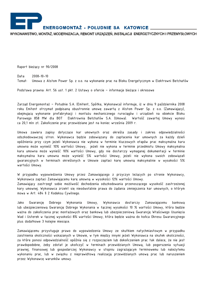 Raport bieżący nr 90/2008 Data: Temat: 2008-10-10 Umowa z Alstom Power Sp. z o.o. na wykonanie prac na Bloku Energetycznym w Elektrowni Bełchatów Podstawa prawna: Art. 56 ust. 1 pkt. 2 Ustawy o ofercie – informacje bieżące i okresowe Zarząd Energomontaż – Południe S.A. (Emitent, Spółka, Wykonawca) informuje, iż w dniu 9 października 2008 roku Emitent otrzymał podpisaną obustronnie umowę zawartą z Alstom Power Sp. z o.o. (Zamawiający), obejmującą wykonanie prefabrykacji i montażu mechanicznego rurociągów i urządzeń na obiekcie Bloku Parowego 858 MW dla BOT Elektrownia Bełchatów S.A. (Umowa). Wartość zawartej Umowy wynosi ca 20,1 mln zł. Zakończenie prac przewidziane jest na koniec września 2009 r. Umowa zawiera zapisy dotyczące kar umownych oraz określa zasady i zakres odpowiedzialności odszkodowawczej stron. Wykonawca będzie zobowiązany do zapłacenia kar umownych za każdy dzień opóźnienia przy czym jeżeli Wykonawca nie wykona w terminie kluczowych etapów prac maksymalna kara umowna może wynieść 10% wartości Umowy, jeżeli nie wykona w terminie przedmiotu Umowy maksymalna kara umowna może wynieść 10% wartości Umowy, gdy nie dostarczy wymaganej dokumentacji w terminie maksymalna kara umowna może wynieść 5% wartości Umowy, jeżeli nie wykona swoich zobowiązań gwarancyjnych w terminach określonych w Umowie zapłaci karę umowną maksymalnie w wysokości 5% wartości Umowy. W przypadku wypowiedzenia Umowy przez Zamawiającego z przyczyn leżących po stronie Wykonawcy, Wykonawca zapłaci Zamawiającemu karę umowną w wysokości 12% wartości Umowy. Zamawiający zastrzegł sobie możliwość dochodzenia odszkodowania przenoszącego wysokość zastrzeżonej kary umownej. Wykonawca zrzekł się nieodwołalnie prawa do żądania zmniejszenia kar umownych, o którym mowa w Art. 484 § 2 Kodeksu Cywilnego. Jako Gwarancję Dobrego Wykonania Umowy, Wykonawca dostarczy Zamawiającemu bankową lub ubezpieczeniową Gwarancję Dobrego Wykonania w łącznej wysokości 10 % wartości Umowy, która będzie ważna do zakończenia prac montażowych oraz bankową lub ubezpieczeniową Gwarancję Właściwego Usunięcia Wad i Usterek w łącznej wysokości 8% wartości Umowy, która będzie ważna do końca Okresu Gwarancyjnego plus dodatkowe 3 kolejne miesiące. Zamawiającemu przysługuje prawo do wypowiedzenia Umowy ze skutkiem natychmiastowym w przypadku zaistnienia okoliczności wskazanych w Umowie, w tym między innymi jeżeli Wykonawca na skutek okoliczności, za które ponosi odpowiedzialność opóźnia się z rozpoczęciem lub dokończeniem prac tak dalece, że nie jest prawdopodobne, żeby zdołał je ukończyć w terminach przewidzianych Umową, lub pogorszenia sytuacji prawnej, finansowej lub gospodarczej Wykonawcy w stopniu zagrażającym terminowemu lub należytemu wykonaniu prac, lub w związku z nieprawidłową realizacją przewidzianych umową prac lub naruszeniem przez Wykonawcę warunków umowy. Wykonawcy przysługuje prawo do wypowiedzenia Umowy w przypadku opóźnienia Zamawiającego w zapłacie wynagrodzenia Wykonawcy przekraczającego 60 dni od dnia jej wymagalności, po uprzednim pisemnym wezwaniu Zamawiającego do dokonania zapłaty. Pozostałe warunki ww. umowy nie odbiegają od powszechnie stosowanych dla tego typu umów. Emitent uznaje 10% kapitałów własnych jako kryterium uznania umowy za znaczącą. PODPISY OSÓB REPREZENTUJĄCYCH SPÓŁKĘ Wojciech Nazarek Alina Sowa Prezes Zarządu Prokurent 1