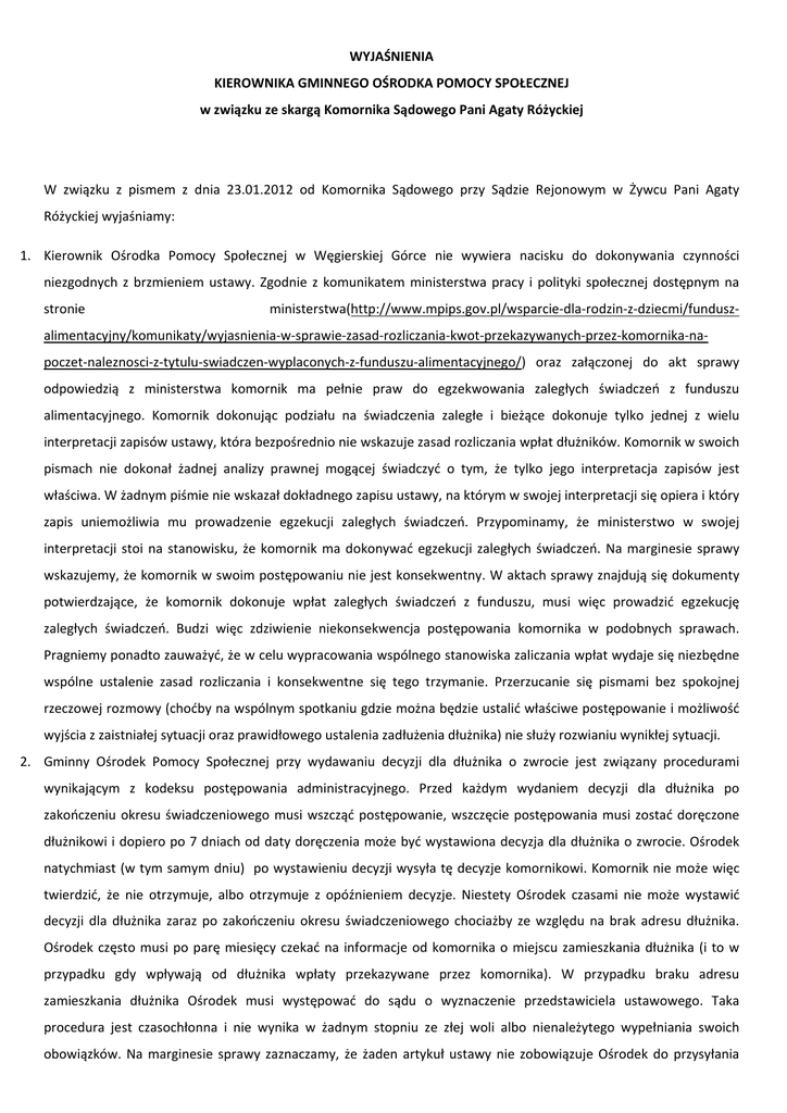 WYJAŚNIENIA KIEROWNIKA GMINNEGO OŚRODKA POMOCY SPOŁECZNEJ w związku ze skargą Komornika Sądowego Pani Agaty Różyckiej W związku z pismem z dnia 23.01.2012 od Komornika Sądowego przy Sądzie Rejonowym w Żywcu Pani Agaty Różyckiej wyjaśniamy: 1. Kierownik Ośrodka Pomocy Społecznej w Węgierskiej Górce nie wywiera nacisku do dokonywania czynności niezgodnych z brzmieniem ustawy. Zgodnie z komunikatem ministerstwa pracy i polityki społecznej dostępnym na stronie ministerstwa(http://www.mpips.gov.pl/wsparcie-dla-rodzin-z-dziecmi/fundusz- alimentacyjny/komunikaty/wyjasnienia-w-sprawie-zasad-rozliczania-kwot-przekazywanych-przez-komornika-napoczet-naleznosci-z-tytulu-swiadczen-wyplaconych-z-funduszu-alimentacyjnego/) oraz załączonej do akt sprawy odpowiedzią z ministerstwa komornik ma pełnie praw do egzekwowania zaległych świadczeń z funduszu alimentacyjnego. Komornik dokonując podziału na świadczenia zaległe i bieżące dokonuje tylko jednej z wielu interpretacji zapisów ustawy, która bezpośrednio nie wskazuje zasad rozliczania wpłat dłużników. Komornik w swoich pismach nie dokonał żadnej analizy prawnej mogącej świadczyć o tym, że tylko jego interpretacja zapisów jest właściwa. W żadnym piśmie nie wskazał dokładnego zapisu ustawy, na którym w swojej interpretacji się opiera i który zapis uniemożliwia mu prowadzenie egzekucji zaległych świadczeń. Przypominamy, że ministerstwo w swojej interpretacji stoi na stanowisku, że komornik ma dokonywać egzekucji zaległych świadczeń. Na marginesie sprawy wskazujemy, że komornik w swoim postępowaniu nie jest konsekwentny. W aktach sprawy znajdują się dokumenty potwierdzające, że komornik dokonuje wpłat zaległych świadczeń z funduszu, musi więc prowadzić egzekucję zaległych świadczeń. Budzi więc zdziwienie niekonsekwencja postępowania komornika w podobnych sprawach. Pragniemy ponadto zauważyć, że w celu wypracowania wspólnego stanowiska zaliczania wpłat wydaje się niezbędne wspólne ustalenie zasad rozliczania i konsekwentne się tego trzymanie. Przerzucanie się pismami bez spokojnej rzeczowej rozmowy (choćby na wspólnym spotkaniu gdzie można będzie ustalić właściwe postępowanie i możliwość wyjścia z zaistniałej sytuacji oraz prawidłowego ustalenia zadłużenia dłużnika) nie służy rozwianiu wynikłej sytuacji. 2. Gminny Ośrodek Pomocy Społecznej przy wydawaniu decyzji dla dłużnika o zwrocie jest związany procedurami wynikającym z kodeksu postępowania administracyjnego. Przed każdym wydaniem decyzji dla dłużnika po zakończeniu okresu świadczeniowego musi wszcząć postępowanie, wszczęcie postępowania musi zostać doręczone dłużnikowi i dopiero po 7 dniach od daty doręczenia może być wystawiona decyzja dla dłużnika o zwrocie. Ośrodek natychmiast (w tym samym dniu) po wystawieniu decyzji wysyła tę decyzje komornikowi. Komornik nie może więc twierdzić, że nie otrzymuje, albo otrzymuje z opóźnieniem decyzje. Niestety Ośrodek czasami nie może wystawić decyzji dla dłużnika zaraz po zakończeniu okresu świadczeniowego chociażby ze względu na brak adresu dłużnika. Ośrodek często musi po parę miesięcy czekać na informacje od komornika o miejscu zamieszkania dłużnika (i to w przypadku gdy wpływają od dłużnika wpłaty przekazywane przez komornika). W przypadku braku adresu zamieszkania dłużnika Ośrodek musi występować do sądu o wyznaczenie przedstawiciela ustawowego. Taka procedura jest czasochłonna i nie wynika w żadnym stopniu ze złej woli albo nienależytego wypełniania swoich obowiązków. Na marginesie sprawy zaznaczamy, że żaden artykuł ustawy nie zobowiązuje Ośrodek do przysyłania decyzji dla dłużnika do komornika i jest to tylko przejaw dobrej woli Ośrodka w ramach lepszej współpracy z komornikiem; 3. Co do zarzutu, że Ośrodek księguje wpłaty dłużnika na zaległe świadczenia z funduszu to jak już nadmieniliśmy wcześniej komornik sądowy również to robi (w aktach znajdują się m.in. dowody na przekazywanie kwot przez komornika na zaległe świadczenia – np. wpłaty Pana Zbigniewa Kupczaka). Zdziwienie zatem budzi stwierdzenie, że komornik nie może egzekwować tych kwot skoro dokonuje takiej czynności. Jak wspomnieliśmy wyżej takie księgowanie wpłat dłużnika jest jedna z zalecanych przez ministerstwo interpretacji. Komornik w żadnym piśmie nie wskazał, który artykuł i jakiej ustawy został naruszony przy takim księgowaniu akt. Pismo Kierownika Ośrodka Pomocy Społecznej nie służyło pouczaniu komornika o zasadach księgowania wpłat, ale miało na celu wypracowanie spójnego i konsekwentnego modelu księgowania wpłat dłużników. Z analizy dokumentów zebranych w sprawie nietrudno zauważyć, że komornik sam postępuje niekonsekwentnie przesyłając wyższą kwotę zwrotu niż zadłużenie bieżące dłużnika (wpłata Pana Józefa Krzysztofka) czy przekazując wpłaty gdy nie ma bieżącego zadłużenia (sprawa Pana Zbigniewa Kupczaka). Nie znajdujemy w żadnym piśmie sugestii, jakoby Pani Komornik podlegała pracownikom GOPS, jest tylko prośba o rozliczenie wpłat w taki a nie inny sposób; 4. Pisma przesyłane do Państwa kancelarii nie zawierają gróźb, tylko cytat z ustawy (art. 3 ust. 8 ustawy o pomocy osobom uprawnionym do alimentów: „Organ właściwy dłużnika oraz organ właściwy wierzyciela informują sąd o bezczynności lub wszelkich przejawach opieszałości komornika sądowego prowadzącego postępowanie egzekucyjne przeciwko dłużnikowi alimentacyjnemu”), który obliguje do takiego działania. Kierownik działając zgodnie i na podstawie prawa (art. 6 kpa) w przypadku nie udzielenia odpowiedzi na jego pisma w sprawie dłużnika jest zmuszony do wystąpienia ze skargą do Prezesa Sądu. Takie działanie Kierownika w żadnym stopniu nie wynika ani ze złośliwości ani z chęci straszenia, jest konsekwencją zapisu w ustawi
