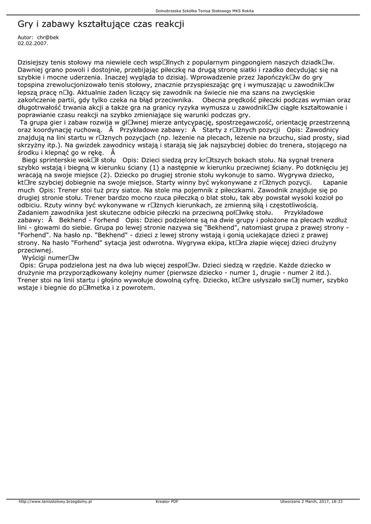 Dolnobrzeska Szkółka Tenisa Stołowego MKS Rokita Gry i zabawy kształtujące czas reakcji Autor: chr@bek 02.02.2007. Dzisiejszy tenis stołowy ma niewiele cech wspÃłlnych z popularnym pingpongiem naszych dziadkÃłw. Dawniej grano powoli i dostojnie, przebijając piłeczkę na drugą stronę siatki i rzadko decydując się na szybkie i mocne uderzenia. Inaczej wygląda to dzisiaj. Wprowadzenie przez JapończykÃłw do gry topspina zrewolucjonizowało tenis stołowy, znacznie przyspieszając grę i wymuszając u zawodnikÃłw lepszą pracę nÃłg. Aktualnie żaden liczący się zawodnik na świecie nie ma szans na zwycięskie zakończenie partii, gdy tylko czeka na błąd przeciwnika. Obecna prędkość piłeczki podczas wymian oraz długotrwałość trwania akcji a także gra na granicy ryzyka wymusza u zawodnikÃłw ciągłe kształtowanie i poprawianie czasu reakcji na szybko zmieniające się warunki podczas gry. Ta grupa gier i zabaw rozwija w głÃłwnej mierze antycypację, spostrzegawczość, orientację przestrzenną oraz koordynację ruchową.  Przykładowe zabawy:  Starty z rÃłżnych pozycji Opis: Zawodnicy znajdują na lini startu w rÃłznych pozycjach (np. leżenie na plecach, leżenie na brzuchu, siad prosty, siad skrzyżny itp.). Na gwizdek zawodnicy wstają i starają się jak najszybciej dobiec do trenera, stojącego na środku i klepnąć go w rękę.  Biegi sprinterskie wokÃłł stołu Opis: Dzieci siedzą przy krÃłtszych bokach stołu. Na sygnał trenera szybko wstają i biegną w kierunku ściany (1) a następnie w kierunku przeciwnej ściany. Po dotknięciu jej wracają na swoje miejsce (2). Dziecko po drugiej stronie stołu wykonuje to samo. Wygrywa dziecko, ktÃłre szybciej dobiegnie na swoje miejsce. Starty winny być wykonywane z rÃłżnych pozycji. Łapanie much Opis: Trener stoi tuż przy siatce. Na stole ma pojemnik z piłeczkami. Zawodnik znajduje się po drugiej stronie stołu. Trener bardzo mocno rzuca piłeczką o blat stołu, tak aby powstał wysoki kozioł po odbiciu. Rzuty winny być wykonywane w rÃłżnych kierunkach, ze zmienną siłą i częstotliwością. Zadaniem zawodnika jest skuteczne odbicie piłeczki na przeciwną połÃłwkę stołu. Przykładowe zabawy:  Bekhend - Forhend Opis: Dzieci podzielone są na dwie grupy i położone na plecach wzdłuż lini - głowami do siebie. Grupa po lewej stronie nazywa się "Bekhend", natomiast grupa z prawej strony "Forhend". Na hasło np. "Bekhend" - dzieci z lewej strony wstają i gonią uciekające dzieci z prawej strony. Na hasło "Forhend" sytacja jest odwrotna. Wygrywa ekipa, ktÃłra złapie więcej dzieci drużyny przeciwnej. Wyścigi numerÃłw Opis: Grupa podzielona jest na dwa lub więcej zespołÃłw. Dzieci siedzą w rzędzie. Każde dziecko w drużynie ma przyporządkowany kolejny numer (pierwsze dziecko - numer 1, drugie - numer 2 itd.). Trener stoi na linii startu i głośno wywołuje dowolną cyfrę. Dziecko, ktÃłre usłyszało swÃłj numer, szybko wstaje i biegnie do pÃłłmetka i z powrotem. http://www.tenisstolowy.brzegdolny.pl Kreator PDF Utworzono 2 March, 2017, 18:33