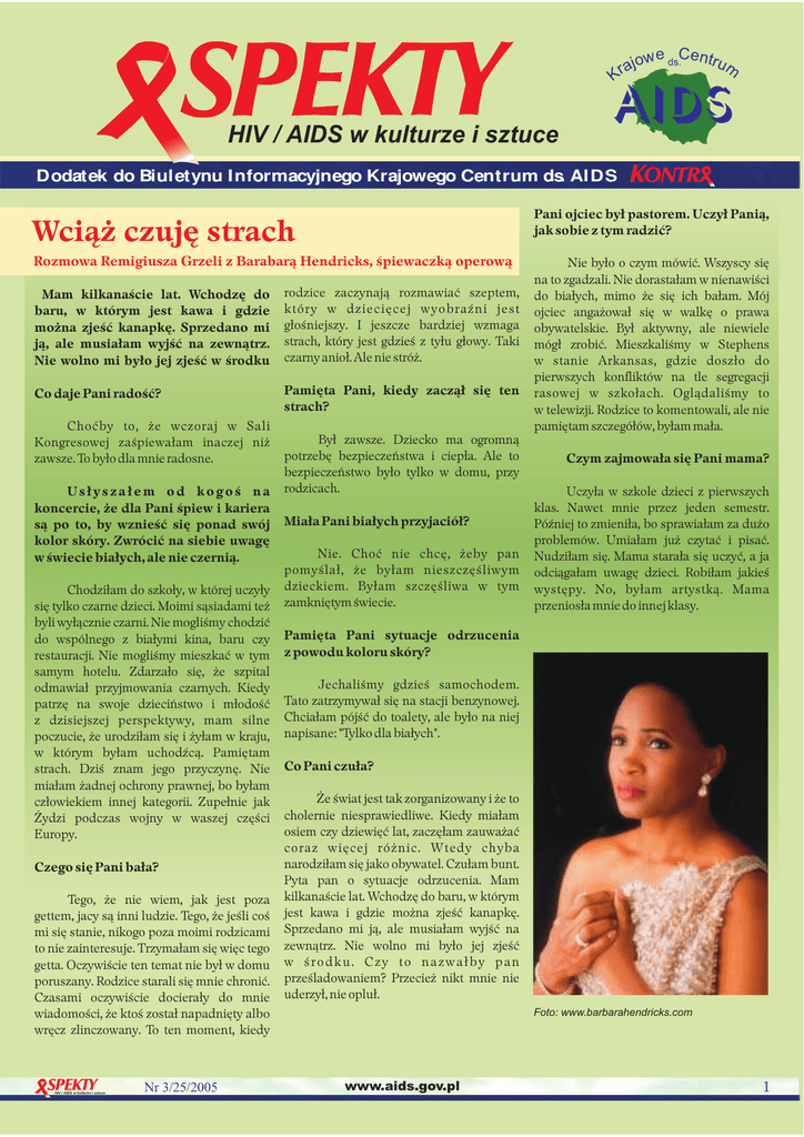 we Centrum ajo ds. r K HIV / AIDS w kulturze i sztuce Dodatek do Biuletynu Informacyjnego Krajowego Centrum ds. AIDS Pani ojciec był pastorem. Uczył Panią, jak sobie z tym radzić? Wciąż czuję strach Rozmowa Remigiusza Grzeli z Barabarą Hendricks, śpiewaczką operową Mam kilkanaście lat. Wchodzę do baru, w którym jest kawa i gdzie można zjeść kanapkę. Sprzedano mi ją, ale musiałam wyjść na zewnątrz. Nie wolno mi było jej zjeść w środku rodzice zaczynają rozmawiać szeptem, który w dziecięcej wyobraźni jest głośniejszy. I jeszcze bardziej wzmaga strach, który jest gdzieś z tyłu głowy. Taki czarny anioł. Ale nie stróż. Co daje Pani radość? Pamięta Pani, kiedy zaczął się ten strach? Choćby to, że wczoraj w Sali Kongresowej zaśpiewałam inaczej niż zawsze. To było dla mnie radosne. Usłyszałem od kogoś na koncercie, że dla Pani śpiew i kariera są po to, by wznieść się ponad swój kolor skóry. Zwrócić na siebie uwagę w świecie białych, ale nie czernią. Chodziłam do szkoły, w której uczyły się tylko czarne dzieci. Moimi sąsiadami też byli wyłącznie czarni. Nie mogliśmy chodzić do wspólnego z białymi kina, baru czy restauracji. Nie mogliśmy mieszkać w tym samym hotelu. Zdarzało się, że szpital odmawiał przyjmowania czarnych. Kiedy patrzę na swoje dzieciństwo i młodość z dzisiejszej perspektywy, mam silne poczucie, że urodziłam się i żyłam w kraju, w którym byłam uchodźcą. Pamiętam strach. Dziś znam jego przyczynę. Nie miałam żadnej ochrony prawnej, bo byłam człowiekiem innej kategorii. Zupełnie jak Żydzi podczas wojny w waszej części Europy. Czego się Pani bała? Tego, że nie wiem, jak jest poza gettem, jacy są inni ludzie. Tego, że jeśli coś mi się stanie, nikogo poza moimi rodzicami to nie zainteresuje. Trzymałam się więc tego getta. Oczywiście ten temat nie był w domu poruszany. Rodzice starali się mnie chronić. Czasami oczywiście docierały do mnie wiadomości, że ktoś został napadnięty albo wręcz zlinczowany. To ten moment, kiedy HIV / AIDS w kulturze i sztuce Nr 3/25/2005 Był zawsze. Dziecko ma ogromną potrzebę bezpieczeństwa i ciepła. Ale to bezpieczeństwo było tylko w domu, przy rodzicach. Miała Pani białych przyjaciół? Nie. Choć nie chcę, żeby pan pomyślał, że byłam nieszczęśliwym dzieckiem. Byłam szczęśliwa w tym zamkniętym świecie. Nie było o czym mówić. Wszyscy się na to zgadzali. Nie dorastałam w nienawiści do białych, mimo że się ich bałam. Mój ojciec angażował się w walkę o prawa obywatelskie. Był aktywny, ale niewiele mógł zrobić. Mieszkaliśmy w Stephens w stanie Arkansas, gdzie doszło do pierwszych konfliktów na tle segregacji rasowej w szkołach. Oglądaliśmy to w telewizji. Rodzice to komentowali, ale nie pamiętam szczegółów, byłam mała. Czym zajmowała się Pani mama? Uczyła w szkole dzieci z pierwszych klas. Nawet mnie przez jeden semestr. Później to zmieniła, bo sprawiałam za dużo problemów. Umiałam już czytać i pisać. Nudziłam się. Mama starała się uczyć, a ja odciągałam uwagę dzieci. Robiłam jakieś występy. No, byłam artystką. Mama przeniosła mnie do innej klasy. Pamięta Pani sytuacje odrzucenia z powodu koloru skóry? Jechaliśmy gdzieś samochodem. Tato zatrzymywał się na stacji benzynowej. Chciałam pójść do toalety, ale było na niej napisane: "Tylko dla białych". Co Pani czuła? Że świat jest tak zorganizowany i że to cholernie niesprawiedliwe. Kiedy miałam osiem czy dziewięć lat, zaczęłam zauważać coraz więcej różnic. Wtedy chyba narodziłam się jako obywatel. Czułam bunt. Pyta pan o sytuacje odrzucenia. Mam kilkanaście lat. Wchodzę do baru, w którym jest kawa i gdzie można zjeść kanapkę. Sprzedano mi ją, ale musiałam wyjść na zewnątrz. Nie wolno mi było jej zjeść w środku. Czy to nazwałby pan prześladowaniem? Przecież nikt mnie nie uderzył, nie opluł. Foto: www.barbarahendricks.com www.aids.gov.pl 1