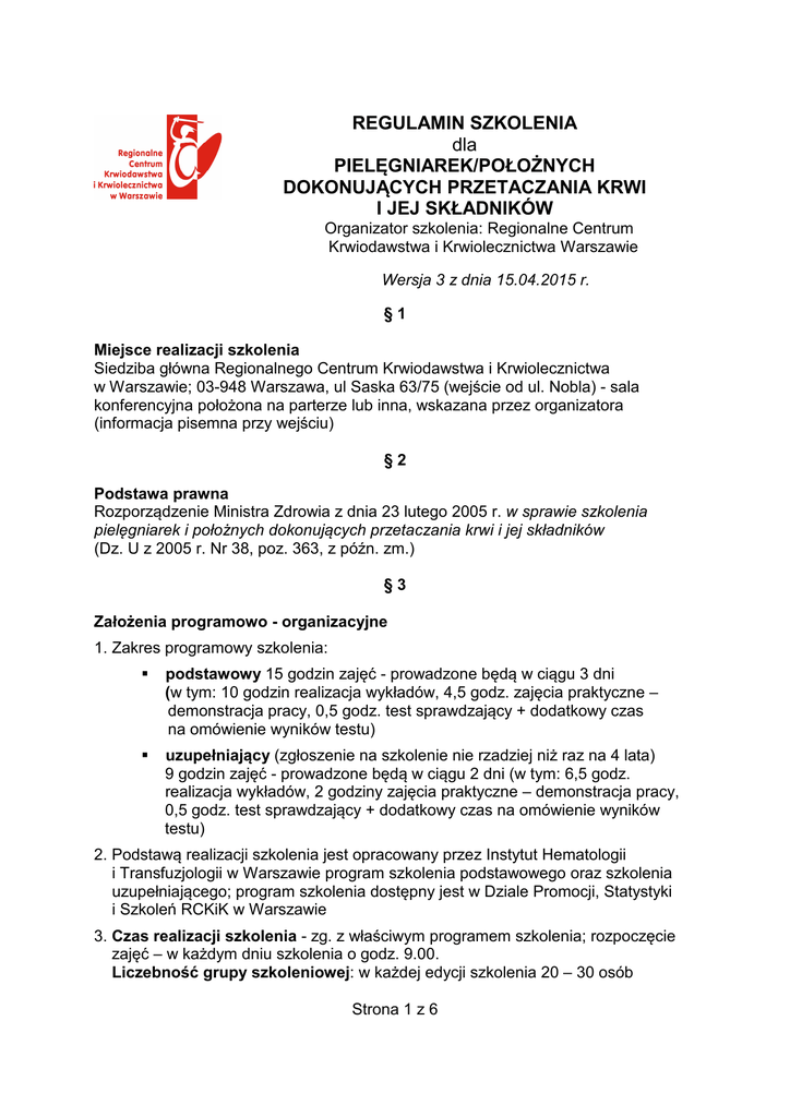REGULAMIN SZKOLENIA dla PIELĘGNIAREK/POŁOŻNYCH DOKONUJĄCYCH PRZETACZANIA KRWI I JEJ SKŁADNIKÓW Organizator szkolenia: Regionalne Centrum Krwiodawstwa i Krwiolecznictwa Warszawie Wersja 3 z dnia 15.04.2015 r. §1 Miejsce realizacji szkolenia Siedziba główna Regionalnego Centrum Krwiodawstwa i Krwiolecznictwa w Warszawie; 03-948 Warszawa, ul Saska 63/75 (wejście od ul. Nobla) - sala konferencyjna położona na parterze lub inna, wskazana przez organizatora (informacja pisemna przy wejściu) §2 Podstawa prawna Rozporządzenie Ministra Zdrowia z dnia 23 lutego 2005 r. w sprawie szkolenia pielęgniarek i położnych dokonujących przetaczania krwi i jej składników (Dz. U z 2005 r. Nr 38, poz. 363, z późn. zm.) §3 Założenia programowo - organizacyjne 1. Zakres programowy szkolenia: podstawowy 15 godzin zajęć - prowadzone będą w ciągu 3 dni (w tym: 10 godzin realizacja wykładów, 4,5 godz. zajęcia praktyczne – demonstracja pracy, 0,5 godz. test sprawdzający + dodatkowy czas na omówienie wyników testu) uzupełniający (zgłoszenie na szkolenie nie rzadziej niż raz na 4 lata) 9 godzin zajęć - prowadzone będą w ciągu 2 dni (w tym: 6,5 godz. realizacja wykładów, 2 godziny zajęcia praktyczne – demonstracja pracy, 0,5 godz. test sprawdzający + dodatkowy czas na omówienie wyników testu) 2. Podstawą realizacji szkolenia jest opracowany przez Instytut Hematologii i Transfuzjologii w Warszawie program szkolenia podstawowego oraz szkolenia uzupełniającego; program szkolenia dostępny jest w Dziale Promocji, Statystyki i Szkoleń RCKiK w Warszawie 3. Czas realizacji szkolenia - zg. z właściwym programem szkolenia; rozpoczęcie zajęć – w każdym dniu szkolenia o godz. 9.00. Liczebność grupy szkoleniowej: w każdej edycji szkolenia 20 – 30 osób Strona 1 z 6 § 4 Do udziału w szkoleniu może przystąpić pielęgniarka/położna, która posiada: prawo wykonywania zawodu co najmniej 3 - miesięczny staż pracy w zawodzie udział w szkoleniu uzupełniającym warunkowany jest okazaniem zaświadczenia, potwierdzającego ukończenie (w czasie nie dłuższym niż okres 4 lat) szkolenia podstawowego, bądź ostatnio realizowanego szkolenia uzupełniającego §5 Koszt jednostkowy szkolenia wynosi: 180,00 zł za udział pielęgniarki/położnej w szkoleniu w zakresie podstawowym 110,00 zł - uczestnictwo w szkoleniu uzupełniającym §6 Zgłoszenie na szkolenie może dokonać jednostka organizacyjna zatrudniająca pielęgniarkę/położną, bądź osoba fizyczna 1. Jednostka organizacyjna zgłasza pielęgniarki/położne do udziału w szkoleniu zgodnie ze wzorem Zbiorczego formularza zgłoszenia na szkolenie dla pielęgniarek/położnych dokonujących przetaczania krwi i jej składników /Zał. Nr 1/. Zgodność danych zawartych w formularzu potwierdza dyrektor jednostki organizacyjnej 2. Osoba fizyczna (forma zgłoszenia indywidualna) zgłaszająca udział w szkoleniu wypełnia Indywidualny formularz zgłoszenia na szkolenie dla pielęgniarek/położnych dokonujących przetaczania krwi i jej składników. Zgodność danych w formularzu poświadczona zostaje własnoręcznym, czytelnym (z podaniem daty) podpisem uczestnika szkolenia Formularz wypełniony nieczytelnie może być przyczyną nie zakwalifikowania na szkolenie §7 I. Procedura zgłoszenia przez jednostkę organizacyjną potrzeb szkoleniowych 1. Jednostka organizacyjna dokonuje zgłoszenia na szkolenie w formie pisemnej (pismo skierowane do Dyrekcji RCKiK w Warszawie, przesłane pocztą lub faxem) z podaniem danych: określenie rodzaju szkolenia (dla pielęgniarek i położnych); zakresu (podstawowe/uzupełniające) określenie liczebności grupy personelu pielęgniarskiego zgłoszonego do udziału w szkoleniu potwierdzenie akceptacji kosztów szkolenia oraz wskazanie płatnika (deklarację płatności zgłasza jednostka organizacyjna zatrudniająca pielęgniarkę/płatność realizuje osoba przystępująca do szkolenia Strona 2 z 6 wskazanie możliwości bieżącego kontaktu (np. z osobą pełniącą funkcję Naczelnej Pielęgniarki) z podaniem danych: nazwisko i imię, stanowisko służbowe, telefon kontaktowy podpis i pieczątka dyrektora jednostki organizacyjnej, zamawiającej usługę szkoleniową RCKiK w Warszawie udziela Dyrekcji jednostki organizacyjnej pisemnej odpowiedzi nt. aktualnych możliwości realizacji szkolenia. W przypadku akceptacji zgłoszenia - w załączeniu pisma przekazany zostaje niniejszy Regulamin oraz wzór druku. „Zbiorczy formularz ....” (patrz § 6, pkt 1) 2. Płatność przez jednostkę organizacyjną za szkolenie dokonywana jest w formie przedpłaty - nie później niż 7 dni przed rozpoczęciem szkolenia na konto Regionalnego Centrum Krwiodawstwa i Krwiolecznictwa w Warszawie: 07 1130 1017 0020 1467 2820 0001 Bank Gospodarstwa Krajowego Potwierdzenie płatności wraz z listą uczestników szkolenia należy przesłać do Działu Księgowości RCKiK w Warszawie faksem na nr 22 514 60 13 3. W nieprzekraczalnym terminie – 7 dni przed rozpoczęciem szkolenia jednostka organizacyjna zobowiązana jest przekazać do Działu Promocji, Statystyki i Szkoleń RCKiK w Warszawie pocztą tradycyjną, mailową (z podpisem elektronicznym Dyrektora Placówki) lub faxem : Listę uczestników szkolenia (z podaniem nazwiska i imienia każdej zgłoszonej do udziału w szkoleniu pielęgniarki) - opatrzoną podpisem i pieczątką Dyrekcji jednostki organizacyjnej zamawiającej szkolenie wypełniony czytelnie „Zbiorczy formularz ...” o którym mowa w § 6, pkt 1 uwzględniający ustaloną wcześniej liczebność grupy pielęgniarek (formularz powinien być wypełniony z zachowaniem porządku, zgodnego z Listą uczestników szkolenia - zgodność danych zawartych w formularzu potwierdzona zostaje podpisem oraz pieczątką Dyrekcji jednostki organizacyjnej) w przypadku zgłoszenia do udziału w szkoleniu uzupełniającym (w odniesieniu do każdej zgłoszonej pielęgniarki) wymagane je