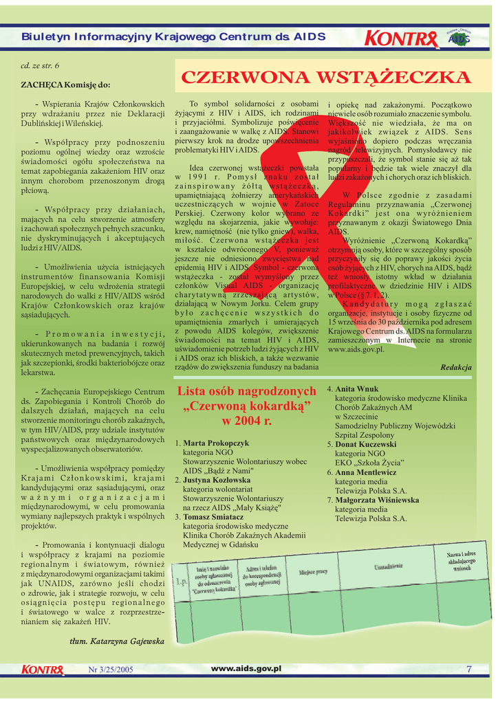 Biul etyn I nformacyjny Krajowego Centrum ds. AI DS cd. ze str. 6 ZACHĘCA Komisję do: - Wspierania Krajów Członkowskich przy wdrażaniu przez nie Deklaracji Dublińskiej i Wileńskiej. - Współpracy przy podnoszeniu poziomu ogólnej wiedzy oraz wzroście świadomości ogółu społeczeństwa na temat zapobiegania zakażeniom HIV oraz innym chorobom przenoszonym drogą płciową. - Współpracy przy działaniach, mających na celu stworzenie atmosfery i zachowań społecznych pełnych szacunku, nie dyskryminujących i akceptujących ludzi z HIV/AIDS. - Umożliwienia użycia istniejących instrumentów finansowania Komisji Europejskiej, w celu wdrożenia strategii narodowych do walki z HIV/AIDS wśród Krajów Członkowskich oraz krajów sąsiadujących. - Promowania inwestycji, ukierunkowanych na badania i rozwój skutecznych metod prewencyjnych, takich jak szczepionki, środki bakteriobójcze oraz lekarstwa. - Zachęcania Europejskiego Centrum ds. Zapobiegania i Kontroli Chorób do dalszych działań, mających na celu stworzenie monitoringu chorób zakaźnych, w tym HIV/AIDS, przy udziale instytutów państwowych oraz międzynarodowych wyspecjalizowanych obserwatoriów. - Umożliwienia współpracy pomiędzy Krajami Członkowskimi, krajami kandydującymi oraz sąsiadującymi, oraz w a ż n y m i o r g a n i z a c j a m i międzynarodowymi, w celu promowania wymiany najlepszych praktyk i wspólnych projektów. - Promowania i kontynuacji dialogu i współpracy z krajami na poziomie regionalnym i światowym, również z międzynarodowymi organizacjami takimi jak UNAIDS, zarówno jeśli chodzi o zdrowie, jak i strategie rozwoju, w celu osiągnięcia postępu regionalnego i światowego w walce z rozprzestrzenianiem się zakażeń HIV. we Centrum ajo ds. Kr CZERWONA WSTĄŻECZKA To symbol solidarności z osobami żyjącymi z HIV i AIDS, ich rodzinami i przyjaciółmi. Symbolizuje poświęcenie i zaangażowanie w walkę z AIDS. Stanowi pierwszy krok na drodze upowszechnienia problematyki HIV iAIDS. Idea czerwonej wstążeczki powstała w 1 9 9 1 r. P o m y s ł z n a k u z o s t a ł zainspirowany żółtą wstążeczką, upamiętniającą żołnierzy amerykańskich uczestniczących w wojnie w Zatoce Perskiej. Czerwony kolor wybrano ze względu na skojarzenia, jakie wywołuje: krew, namiętność (nie tylko gniew), walka, miłość. Czerwona wstążeczka jest w kształcie odwróconego V, ponieważ jeszcze nie odniesiono zwycięstwa nad epidemią HIV i AIDS. Symbol - czerwona wstążeczka - został wymyślony przez członków Visual AIDS - organizację charytatywną zrzeszającą artystów, działającą w Nowym Jorku. Celem grupy było zachęcenie wszystkich do upamiętnienia zmarłych i umierających z powodu AIDS kolegów, zwiększenie świadomości na temat HIV i AIDS, uświadomienie potrzeb ludzi żyjących z HIV i AIDS oraz ich bliskich, a także wezwanie rządów do zwiększenia funduszy na badania Lista osób nagrodzonych „Czerwoną kokardką” w 2004 r. 1. Marta Prokopczyk kategoria NGO Stowarzyszenie Wolontariuszy wobec AIDS „Bądź z Nami" 2. Justyna Kozłowska kategoria wolontariat Stowarzyszenie Wolontariuszy na rzecz AIDS „Mały Książę" 3. Tomasz Smiatacz kategoria środowisko medyczne Klinika Chorób Zakaźnych Akademii Medycznej w Gdańsku i opiekę nad zakażonymi. Początkowo niewiele osób rozumiało znaczenie symbolu. Większość nie wiedziała, że ma on jakikolwiek związek z AIDS. Sens wyjaśniono dopiero podczas wręczania nagród telewizyjnych. Pomysłodawcy nie przypuszczali, że symbol stanie się aż tak popularny i będzie tak wiele znaczył dla ludzi zakażonych i chorych oraz ich bliskich. W Polsce zgodnie z zasadami Regulaminu przyznawania „Czerwonej Kokardki” jest ona wyróżnieniem przyznawanym z okazji Światowego Dnia AIDS. Wyróżnienie „Czerwoną Kokardką” otrzymują osoby, które w szczególny sposób przyczyniły się do poprawy jakości życia osób żyjących z HIV, chorych na AIDS, bądź też wniosły istotny wkład w działania profilaktyczne w dziedzinie HIV i AIDS w Polsce (§ 7. 1, 2). Kandydatury mogą zgłaszać organizacje, instytucje i osoby fizyczne od 15 września do 30 października pod adresem Krajowego Centrum ds. AIDS na formularzu zamieszczonym w Internecie na stronie www.aids.gov.pl. Redakcja 4. Anita Wnuk kategoria środowisko medyczne Klinika Chorób Zakaźnych AM w Szczecinie Samodzielny Publiczny Wojewódzki Szpital Zespolony 5. Donat Kuczewski kategoria NGO EKO „Szkoła Życia” 6. Anna Mentlewicz kategoria media Telewizja Polska S.A. 7. Małgorzata Wiśniewska kategoria media Telewizja Polska S.A. tłum. Katarzyna Gajewska Nr 3/25/2005 www.aids.gov.pl 7
