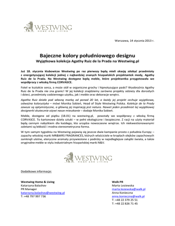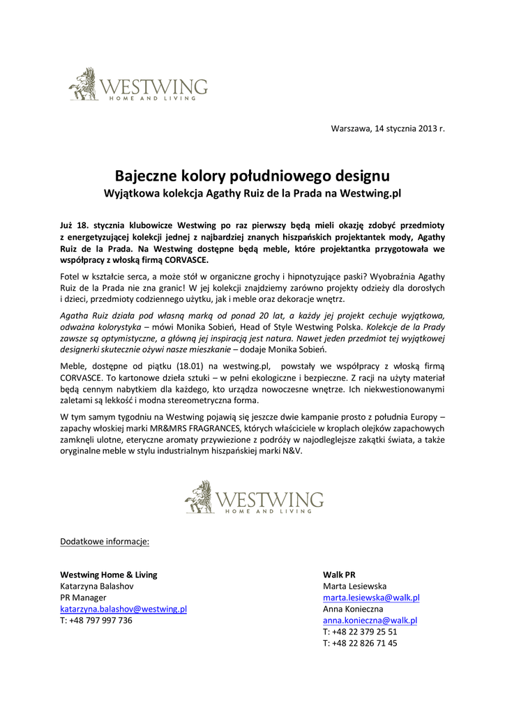 Warszawa, 14 stycznia 2013 r. Bajeczne kolory południowego designu Wyjątkowa kolekcja Agathy Ruiz de la Prada na Westwing.pl Już 18. stycznia klubowicze Westwing po raz pierwszy będą mieli okazję zdobyć przedmioty z energetyzującej kolekcji jednej z najbardziej znanych hiszpańskich projektantek mody, Agathy Ruiz de la Prada. Na Westwing dostępne będą meble, które projektantka przygotowała we współpracy z włoską firmą CORVASCE. Fotel w kształcie serca, a może stół w organiczne grochy i hipnotyzujące paski? Wyobraźnia Agathy Ruiz de la Prada nie zna granic! W jej kolekcji znajdziemy zarówno projekty odzieży dla dorosłych i dzieci, przedmioty codziennego użytku, jak i meble oraz dekoracje wnętrz. Agatha Ruiz działa pod własną marką od ponad 20 lat, a każdy jej projekt cechuje wyjątkowa, odważna kolorystyka – mówi Monika Sobień, Head of Style Westwing Polska. Kolekcje de la Prady zawsze są optymistyczne, a główną jej inspiracją jest natura. Nawet jeden przedmiot tej wyjątkowej designerki skutecznie ożywi nasze mieszkanie – dodaje Monika Sobień. Meble, dostępne od piątku (18.01) na westwing.pl, powstały we współpracy z włoską firmą CORVASCE. To kartonowe dzieła sztuki – w pełni ekologiczne i bezpieczne. Z racji na użyty materiał będą cennym nabytkiem dla każdego, kto urządza nowoczesne wnętrze. Ich niekwestionowanymi zaletami są lekkość i modna stereometryczna forma. W tym samym tygodniu na Westwing pojawią się jeszcze dwie kampanie prosto z południa Europy – zapachy włoskiej marki MR&MRS FRAGRANCES, których właściciele w kroplach olejków zapachowych zamknęli ulotne, eteryczne aromaty przywiezione z podróży w najodleglejsze zakątki świata, a także oryginalne meble w stylu industrialnym hiszpańskiej marki N&V. Dodatkowe informacje: Westwing Home & Living Katarzyna Balashov PR Manager [email protected] T: +48 797 997 736 Walk PR Marta Lesiewska [email protected] Anna Konieczna [email protected] T: +48 22 379 25 51 T: +48 22 826 71 45 ________________________________________________________________________________________ Westwing jest pierwszym w Polsce internetowym klubem zakupowym z branży Home & Living, oferującym produkty zarówno znanych, jak i dopiero zdobywających popularność designerów z całego świata. Założycielką Westwing jest Delia Fischer – była redaktorka magazynów ELLE oraz ELLE Decoration. W Polsce wyboru ekskluzywnych marek, prezentujących na portalu swoje meble i akcesoria dekoracyjne, dokonują doświadczone stylistki i projektantki wnętrz. Głównym zadaniem pięcioosbowego zespołu, którym kieruje Monika Sobień, jest śledzenie światowych trendów i wyszukiwanie designerskich perełek z całego świata. Westwing wydaje również magazyn on-line, będący inspirującym źródłem w urządzaniu domowego wnętrza. Redaktor naczelną magazynu jest Marta Suchodolska, była szefowa działu w magazynie „Dom i Wnętrze“ oraz redaktor naczelna „Czterech Kątów“.