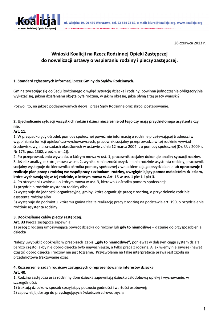 26 czerwca 2013 r. Wnioski Koalicji na Rzecz Rodzinnej Opieki Zastępczej do nowelizacji ustawy o wspieraniu rodziny i pieczy zastępczej. 1. Standard zgłaszanych informacji przez Gminy do Sądów Rodzinnych. Gmina zwracając się do Sądu Rodzinnego o wgląd sytuację dziecka i rodziny, powinna jednocześnie obligatoryjnie wykazać się, jakimi działaniami objęta była rodzina, w jakim okresie, jakie płyną z tej pracy wnioski? Pozwoli to, na jakość podejmowanych decyzji przez Sądy Rodzinne oraz skróci postępowanie. 2. Ujednolicenie sytuacji wszystkich rodzin i dzieci niezależnie od tego czy mają przydzielonego asystenta czy nie. Art. 11. 1. W przypadku gdy ośrodek pomocy społecznej poweźmie informację o rodzinie przeżywającej trudności w wypełnianiu funkcji opiekuńczo-wychowawczych, pracownik socjalny przeprowadza w tej rodzinie wywiad środowiskowy, na za-sadach określonych w ustawie z dnia 12 marca 2004 r. o pomocy społecznej (Dz. U. z 2009 r. Nr 175, poz. 1362, z późn. zm.2)). 2. Po przeprowadzeniu wywiadu, o którym mowa w ust. 1, pracownik socjalny dokonuje analizy sytuacji rodziny. 3. Jeżeli z analizy, o której mowa w ust. 2, wynika konieczność przydzielenia rodzinie asystenta rodziny, pracownik socjalny występuje do kierownika ośrodka pomocy społecznej z wnioskiem o jego przydzielenie lub opracowuje i realizuje plan pracy z rodziną we współpracy z członkami rodziny, uwzględniający pomoc małoletnim dzieciom, które wychowują się w tej rodzinie, o którym mowa w Art. 15 w ust. 1 pkt 1 i pkt 3. 4. Po otrzymaniu wniosku, o którym mowa w ust. 3, kierownik ośrodka pomocy społecznej: 1) przydziela rodzinie asystenta rodziny albo 2) występuje do jednostki organizacyjnej gminy, która organizuje pracę z rodziną, o przydzielenie rodzinie asystenta rodziny albo 3) występuje do podmiotu, któremu gmina zleciła realizację pracy z rodziną na podstawie art. 190, o przydzielenie rodzinie asystenta rodziny. 3. Dookreślenie celów pieczy zastępczej. Art. 33 Piecza zastępcza zapewnia: 1) pracę z rodziną umożliwiającą powrót dziecka do rodziny lub gdy to niemożliwe – dążenie do przysposobienia dziecka Należy uwypuklić dookreślić w przepisach zapis „gdy to niemożliwe”, ponieważ w dalszym ciągu system działa bardzo często jakby nie dobro dziecka było najważniejsze, a tylko praca z rodziną. A jak wiemy nie zawsze (nawet często) dobro dziecka i rodziny nie jest tożsame. Przyzwolenie na takie interpretacje prawa jest zgodą na przedmiotowe traktowanie dzieci. 4. Rozszerzenie zadań rodziców zastępczych o reprezentowanie interesów dziecka. Art. 40. 1. Rodzina zastępcza oraz rodzinny dom dziecka zapewniają dziecku całodobową opiekę i wychowanie, w szczególności: 1) traktują dziecko w sposób sprzyjający poczuciu godności i wartości osobowej; 2) zapewniają dostęp do przysługujących świadczeń zdrowotnych; 1 3) zapewniają kształcenie, wyrównywanie braków rozwojowych i szkolnych; 4) zapewniają rozwój uzdolnień i zainteresowań; 5) zaspokajają jego potrzeby emocjonalne, bytowe, rozwojowe, społeczne oraz religijne; 6) zapewniają ochronę przed arbitralną lub bezprawną ingerencją w życie prywatne dziecka; 7) umożliwiają kontakt z rodzicami i innymi osobami bliskimi, chyba że sąd postanowi inaczej. 8) reprezentują interesy dziecka 2. Rodzina zastępcza oraz prowadzący rodzinny dom dziecka współpracują z ośrodkiem adopcyjnym, koordynatorem rodzinnej pieczy zastępczej i organizatorem rodzinnej pieczy zastępczej. 5. Zaświadczenie lekarskie. Art. 42. 1. Pełnienie funkcji rodziny zastępczej oraz prowadzenie rodzinnego domu dziecka może być powierzone osobom, które: 5) są zdolne do sprawowania właściwej opieki nad dzieckiem, co zostało potwierdzone zaświadczeniami o braku przeciwwskazań zdrowotnych do pełnienia funkcji rodziny zastępczej lub prowadzenia rodzinnego domu dziecka, wystawionymi przez lekarza podstawowej opieki zdrowotnej; Kwestia wymaga uregulowania, jaki zakres obejmują badania, kto jest zobowiązany do ich wystawienia. 6. Zabezpieczenie stabilizacji sytuacji dziecka i jego poczucia bezpieczeństwa. Art. 50. 1. Jeżeli przeciwko osobie pełniącej funkcję rodziny zastępczej lub prowadzącemu rodzinny dom dziecka wszczęto postępowanie karne o umyślne przestępstwo ścigane z oskarżenia publicznego, do czasu prawomocnego zakończenia postępowania starosta może odpowiednio: 1) zapewnić dziecku pieczę w innej rodzinie zastępczej; 1a) pozostawić dziecko w dotychczasowej rodzinie zastępczej lub rodzinnym domu dziecka, pod warunkiem odseparowania osoby przeciwko, której wszczęto postępowanie karne o umyślne przestępstwo ścigane z oskarżenia publicznego; 2) wyznaczyć inną osobę, spełniającą warunki dla prowadzącego rodzinny dom dziecka, o których mowa w art. 42, i powierzyć jej prowadzenie rodzinnego domu dziecka, a gdy nie jest to możliwe, zapewnić dzieciom pieczę w rodzinie zastępczej lub innym rodzinnym domu dziecka. 2. W przypadku gdy starosta zapewnił dziecku pieczę zastępczą w innej rodzinie zastępczej lub w rodzinnym domu dziecka albo powierzył innej osobie prowadzenie rodzinnego domu dziecka, przepisy art. 13 stosuje się odpowiednio. 7. Podniesienie jakości szkoleń dla rodziców zastępczych, którzy juz sprawują pieczę. Art. 51. 1. Rodzina zastępcza zawodowa oraz prowadzący rodzinny dom dziecka są obowiązani do systematycznego podnoszenia swoich kwalifikacji, w szczególności przez udział w szkoleniach. 2. Program szkolenia, o którym mowa w ust. 1,może zatwierdzać, na okres 5 lat, na wniosek podmiotu prowadzącego szkolenie, minister właściwy do spraw rodziny. 3. Przepisy z art. 44 ust 3-4 stosuje się odpowiednio. 8. Podniesienie standardu opieki, szczególnie w stosunku do małych dzieci powierzanych w trybie interwencyjnym. a) Zatrudnienie pomocy – pogotowia, specjalistyczne Art 57 ust 2 1. W przypadku gd