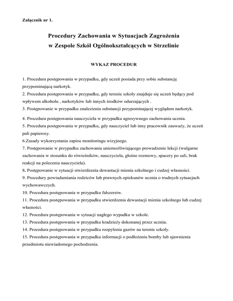 Załącznik nr 1. Procedury Zachowania w Sytuacjach Zagrożenia w Zespole Szkół Ogólnokształcących w Strzelinie WYKAZ PROCEDUR 1. Procedura postępowania w przypadku, gdy uczeń posiada przy sobie substancję przypominającą narkotyk. 2. Procedura postępowania w przypadku, gdy terenie szkoły znajduje się uczeń będący pod wpływem alkoholu , narkotyków lub innych środków odurzających . 3. Postępowanie w przypadku znalezienia substancji przypominającej wyglądem narkotyk. 4. Procedura postępowania nauczyciela w przypadku agresywnego zachowania ucznia. 5. Procedura postępowania w przypadku, gdy nauczyciel lub inny pracownik zauważy, że uczeń pali papierosy. 6.Zasady wykorzystania zapisu monitoringu wizyjnego. 7. Postępowanie w przypadku zachowania uniemożliwiającego prowadzenie lekcji (wulgarne zachowania w stosunku do rówieśników, nauczyciela, głośne rozmowy, spacery po sali, brak reakcji na polecenia nauczyciela). 8. Postępowanie w sytuacji stwierdzenia dewastacji mienia szkolnego i cudzej własności. 9. Procedury powiadamiania rodziców lub prawnych opiekunów ucznia o trudnych sytuacjach wychowawczych. 10. Procedura postępowania w przypadku fałszerstw. 11. Procedura postępowania w przypadku stwierdzenia dewastacji mienia szkolnego lub cudzej własności. 12. Procedura postępowania w sytuacji nagłego wypadku w szkole. 13. Procedura postępowania w przypadku kradzieży dokonanej przez ucznia. 14. Procedura postępowania w przypadku rozpylenia gazów na terenie szkoły. 15. Procedura postępowania w przypadku informacji o podłożeniu bomby lub ujawnienia przedmiotu niewiadomego pochodzenia. 1. PROCEDURY POSTĘPOWANIA W PRZYPADKU,GDY UCZEŃ POSIADA PRZY SOBIE ALKOHOL LUB SUBSTANCJĘ PRZYPOMINAJĄCĄ NARKOTYK 1. Nauczyciel, który podejrzewa, iż uczeń posiada przy sobie alkohol lub substancję przypominającą narkotyk w obecności innej osoby (wychowawca, pedagog, dyrektor, itp.) ma prawo żądać, aby uczeń przekazał mu tę substancję, pokazał zawartość torby szkolnej oraz kieszeni (we własnej odzieży itp.) Nauczyciel nie ma prawa samodzielnie wykonać czynności przeszukania odzieży ani teczki ucznia. 2. O swoich spostrzeżeniach powiadamia dyrektora szkoły oraz rodziców/opiekunów ucznia i wzywa ich do natychmiastowego stawiennictwa. 3. W przypadku, gdy uczeń odmawia przekazania nauczycielowi alkoholu lub substancji i pokazania zawartości teczki, dyrektor szkoły wzywa policję, która przeszukuje odzież i przedmioty należące do ucznia oraz zabezpiecza znaleziony alkohol lub substancję i zabiera do ekspertyzy. 4. W przypadku oddania nauczycielowi przez ucznia podejrzanej substancji, szkoła przekazuje ją niezwłocznie policji. 5. Jeżeli uczeń posiadający alkohol lub substancję odurzającą jest niepełnoletni, dyrektor szkoły zobowiązany jest zawiadomić o zaistniałym fakcie policję. 6. Całe zdarzenie nauczyciel dokumentuje, sporządzając możliwie dokładną notatkę z ustaleń wraz ze swoimi spostrzeżeniami. 7.Uczeń zostaje ukarany zgodnie ze Statutem Szkoły 2. PROCEDURY POSTĘPOWANIA W PRZYPADKU, GDY NA TERENIE SZKOŁY ZNAJDUJE SIĘ UCZEŃ BĘDĄCY POD WPŁYWEM ALKOHOLU LUB INNYCH ŚRODKÓW ODURZAJĄCYCH 1. Powiadomienie wychowawcy oddziału oraz dyrekcji a także pielęgniarki szkolnej. 2. Odizolowanie ucznia od reszty uczniów, lecz nie pozostawienie go samego. 3. Wezwanie rodziców. W przypadku odmowy przyjazdu rodziców lub niemożności skontaktowania się z rodzicami/prawnymi opiekunami, zawiadomienie najbliżej jednostki policji. 4. Wezwanie lekarza, który podejmie decyzję o skierowaniu ucznia do domu lub placówki służby zdrowia lub przekazania ucznia do dyspozycji policji – w porozumieniu z dyrekcją szkoły. 5. Przeprowadzenie – późniejsze – rozmów z rodzicami w obecności ucznia i pedagoga szkolnego – zobowiązanie ucznia do zaniechania negatywnego zachowania – podjęcie ewentualnych działań terapeutycznych. 6. Kara zgodnie ze statutem szkoły.. 7. W przypadku powtórzenia się zdarzenia obligatoryjne powiadomienie policji i sądu rodzinnego. 8.Całe zdarzenie nauczyciel dokumentuje, sporządzając możliwie dokładną notatkę z ustaleń wraz ze swoimi spostrzeżeniami. 3. POSTĘPOWANIE W PRZYPADKU ZNALEZIENIA SUBSTANCJI PRZYPOMINAJĄCEJ WYGLĄDEM NARKOTYK 1. Powiadomienie dyrekcji szkoły. 2. Zabezpieczenie substancji przez pracownika szkoły z zachowaniem środków ostrożności sanitarnej, przed dostępem innych osób do czasu przyjazdu policji. 3. Próba ustalenia właściciela substancji. 4. Przekazanie substancji policji. 4. PROCEDURA POSTĘPOWANIA NAUCZYCIELA W PRZYPADKU AGRESYWNEGO ZACHOWANIA UCZNIA 1. Nauczyciel - świadek zdarzenia przeprowadza rozmowę z uczniem, uświadamiając mu nieodpowiednie zachowanie polegające na naruszeniu norm społecznych i zasad obowiązujących w szkole. Jednocześnie – jeżeli jest to niezbędne - wysyła innego ucznia po pomoc (wychowawca, psycholog/pedagog). Jeśli jest to konieczne nauczyciel zawiadamia pogotowie ratunkowe. 2. Nauczyciel - świadek zdarzenia zawiadamia o zdarzeniu wychowawcę i dyrektora szkoły. 3. Uczniem, który zachował się agresywnie, zajmuje się pedagog/psycholog lub wychowawca. Wychowawca lub (w przypadku nieobecności wychowawcy) nauczyciel- świadek zdarzenia zawiadamia telefonicznie rodziców ucznia o agresywnym zachowaniu dziecka i prosi o osobisty kontakt na terenie szkoły. 4. Wychowawca zawiadamia o zdarzeniu rodziców dziecka poszkodowanego i – jeśli jest to konieczne – prosi o przybycie do szkoły. Jednocześnie informuje rodzica o zgłoszeniu zdarzenia na policję. 5. Jeżeli jest to zdarzenie noszące znamiona czynu karalnego, dyrektor szkoły zawiadamia policję. Następnie dyrektor szkoły zawiadamia Kuratorium Oświaty. 6. Dyrektor szkoły oraz nauczyciel – świadek zdarzenia, wychowawca klasy i pedagog/psycholog przeprowadzają rozmowę z rodzicami oraz z uczniem mającym problemy z zacho