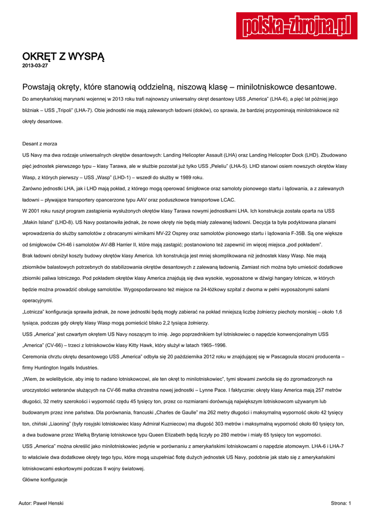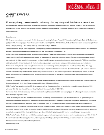 OKRĘT Z WYSPĄ 2013-03-27 Powstają okręty, które stanowią oddzielną, niszową klasę – minilotniskowce desantowe. Do amerykańskiej marynarki wojennej w 2013 roku trafi najnowszy uniwersalny okręt desantowy USS „America” (LHA-6), a pięć lat później jego bliźniak – USS „Tripoli” (LHA-7). Obie jednostki nie mają zalewanych ładowni (doków), co sprawia, że bardziej przypominają minilotniskowce niż okręty desantowe. Desant z morza US Navy ma dwa rodzaje uniwersalnych okrętów desantowych: Landing Helicopter Assault (LHA) oraz Landing Helicopter Dock (LHD). Zbudowano pięć jednostek pierwszego typu – klasy Tarawa, ale w służbie pozostał już tylko USS „Peleliu” (LHA-5). LHD stanowi osiem nowszych okrętów klasy Wasp, z których pierwszy – USS „Wasp” (LHD-1) – wszedł do służby w 1989 roku. Zarówno jednostki LHA, jak i LHD mają pokład, z którego mogą operować śmigłowce oraz samoloty pionowego startu i lądowania, a z zalewanych ładowni – pływające transportery opancerzone typu AAV oraz poduszkowce transportowe LCAC. W 2001 roku ruszył program zastąpienia wysłużonych okrętów klasy Tarawa nowymi jednostkami LHA. Ich konstrukcja została oparta na USS „Makin Island” (LHD-8). US Navy postanowiła jednak, że nowe okręty nie będą miały zalewanej ładowni. Decyzja ta była podyktowana planami wprowadzenia do służby samolotów z obracanymi wirnikami MV-22 Osprey oraz samolotów pionowego startu i lądowania F-35B. Są one większe od śmigłowców CH-46 i samolotów AV-8B Harrier II, które mają zastąpić; postanowiono też zapewnić im więcej miejsca „pod pokładem”. Brak ładowni obniżył koszty budowy okrętów klasy America. Ich konstrukcja jest mniej skomplikowana niż jednostek klasy Wasp. Nie mają zbiorników balastowych potrzebnych do stabilizowania okrętów desantowych z zalewaną ładownią. Zamiast nich można było umieścić dodatkowe zbiorniki paliwa lotniczego. Pod pokładem okrętów klasy America znajdują się dwa wysokie, wyposażone w dźwigi hangary lotnicze, w których będzie można prowadzić obsługę samolotów. Wygospodarowano też miejsce na 24-łóżkowy szpital z dwoma w pełni wyposażonymi salami operacyjnymi. „Lotnicza” konfiguracja sprawiła jednak, że nowe jednostki będą mogły zabierać na pokład mniejszą liczbę żołnierzy piechoty morskiej – około 1,6 tysiąca, podczas gdy okręty klasy Wasp mogą pomieścić blisko 2,2 tysiąca żołnierzy. USS „America” jest czwartym okrętem US Navy noszącym to imię. Jego poprzednikiem był lotniskowiec o napędzie konwencjonalnym USS „America” (CV-66) – trzeci z lotniskowców klasy Kitty Hawk, który służył w latach 1965–1996. Ceremonia chrztu okrętu desantowego USS „America” odbyła się 20 października 2012 roku w znajdującej się w Pascagoula stoczni producenta – firmy Huntington Ingalls Industries. „Wiem, że wolelibyście, aby imię to nadano lotniskowcowi, ale ten okręt to minilotniskowiec”, tymi słowami zwróciła się do zgromadzonych na uroczystości weteranów służących na CV-66 matka chrzestna nowej jednostki – Lynne Pace. I faktycznie: okręty klasy America mają 257 metrów długości, 32 metry szerokości i wyporność rzędu 45 tysięcy ton, przez co rozmiarami dorównują największym lotniskowcom używanym lub budowanym przez inne państwa. Dla porównania, francuski „Charles de Gaulle” ma 262 metry długości i maksymalną wyporność około 42 tysięcy ton, chiński „Liaoning” (były rosyjski lotniskowiec klasy Admirał Kuzniecow) ma długość 303 metrów i maksymalną wyporność około 60 tysięcy ton, a dwa budowane przez Wielką Brytanię lotniskowce typu Queen Elizabeth będą liczyły po 280 metrów i miały 65 tysięcy ton wyporności. USS „America” można określić jako minilotniskowiec jedynie w porównaniu z amerykańskimi lotniskowcami o napędzie atomowym. LHA-6 i LHA-7 to właściwie dwa dodatkowe okręty tego typu, które mogą uzupełniać flotę dużych jednostek US Navy, podobnie jak stało się z amerykańskimi lotniskowcami eskortowymi podczas II wojny światowej. Główne konfiguracje Autor: Paweł Henski Strona: 1 W tak zwanej konfiguracji dominacji powietrznej USS „America” będzie zabierać na pokład 20 myśliwców F-35B oraz sześć śmigłowców wielozadaniowych SH-60/MH-60 Seahawk. W konfiguracji standardowej w wyposażeniu znajdą się: sześć myśliwców F-35B, 12 samolotów MV-22, cztery śmigłowce transportowe CH-53E/K, dwa śmigłowce wielozadaniowe SH-60/MH-60 oraz siedem śmigłowców szturmowych AH-1Z lub transportowych UH-1Y. W konfiguracji desantowej z pokładu USS „America” będzie mogło operować 20 samolotów MV-22. F-35B mają większy zasięg niż AV-8B i dlatego okręty będą mogły rozpocząć działania w dużo większej odległości od brzegu. Tak samo w wypadku desantu – samoloty MV-22 mają promień działania większy o 220 kilometrów od wycofywanych ze służby śmigłowców CH-46 Sea Knight. LHA-6 i LHA-7 będą więc pełnić funkcję dodatkowego wsparcia powietrznego w ramach operacji prowadzonych przez grupy gotowości desantowej (Amphibious Ready Group) przewożące ekspedycyjne jednostki marines (Marines Expeditionary Unit). Portem macierzystym USS „America” będzie baza US Navy w San Diego w Kalifornii, a USS „Tripoli” prawdopodobnie będzie stacjonować na wschodnim wybrzeżu. Klasa niszowa Już w 2009 roku dowódcy marines wyrażali wątpliwości, czy brak zalewanych ładowni w okrętach LHA to dobry pomysł, ponieważ ogranicza możliwość prowadzenia desantu morskiego. Planów dotyczących budowy LHA-6 i LHA-7 już nie zmieniono, ale konfiguracja kolejnego okrętu pozostała kwestią otwartą. Wstępnie zakładano, że przyszły LHA-8 będzie miał jeszcze większe rozmiary oraz wyporność niż USS „America”. Po miesiącach studiów w lutym 2012 roku dowódca marines