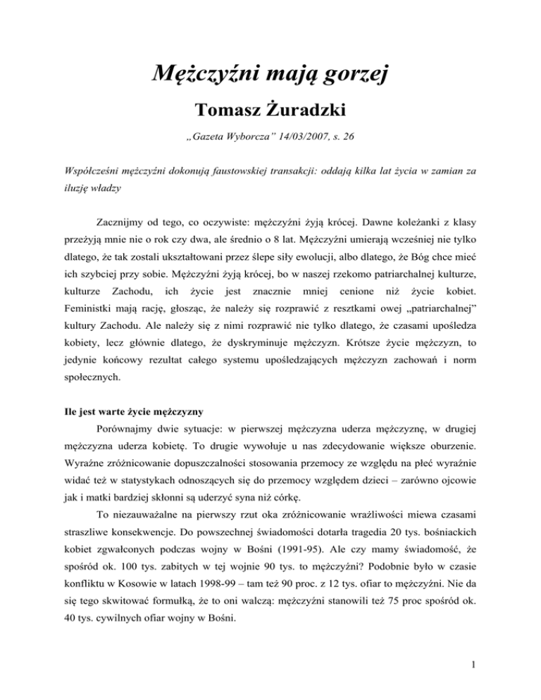 Mężczyźni mają gorzej Tomasz Żuradzki „Gazeta Wyborcza” 14/03/2007, s. 26 Współcześni mężczyźni dokonują faustowskiej transakcji: oddają kilka lat życia w zamian za iluzję władzy Zacznijmy od tego, co oczywiste: mężczyźni żyją krócej. Dawne koleżanki z klasy przeżyją mnie nie o rok czy dwa, ale średnio o 8 lat. Mężczyźni umierają wcześniej nie tylko dlatego, że tak zostali ukształtowani przez ślepe siły ewolucji, albo dlatego, że Bóg chce mieć ich szybciej przy sobie. Mężczyźni żyją krócej, bo w naszej rzekomo patriarchalnej kulturze, kulturze Zachodu, ich życie jest znacznie mniej cenione niż życie kobiet. Feministki mają rację, głosząc, że należy się rozprawić z resztkami owej „patriarchalnej” kultury Zachodu. Ale należy się z nimi rozprawić nie tylko dlatego, że czasami upośledza kobiety, lecz głównie dlatego, że dyskryminuje mężczyzn. Krótsze życie mężczyzn, to jedynie końcowy rezultat całego systemu upośledzających mężczyzn zachowań i norm społecznych. Ile jest warte życie mężczyzny Porównajmy dwie sytuacje: w pierwszej mężczyzna uderza mężczyznę, w drugiej mężczyzna uderza kobietę. To drugie wywołuje u nas zdecydowanie większe oburzenie. Wyraźne zróżnicowanie dopuszczalności stosowania przemocy ze względu na płeć wyraźnie widać też w statystykach odnoszących się do przemocy względem dzieci – zarówno ojcowie jak i matki bardziej skłonni są uderzyć syna niż córkę. To niezauważalne na pierwszy rzut oka zróżnicowanie wrażliwości miewa czasami straszliwe konsekwencje. Do powszechnej świadomości dotarła tragedia 20 tys. bośniackich kobiet zgwałconych podczas wojny w Bośni (1991-95). Ale czy mamy świadomość, że spośród ok. 100 tys. zabitych w tej wojnie 90 tys. to mężczyźni? Podobnie było w czasie konfliktu w Kosowie w latach 1998-99 – tam też 90 proc. z 12 tys. ofiar to mężczyźni. Nie da się tego skwitować formułką, że to oni walczą: mężczyźni stanowili też 75 proc spośród ok. 40 tys. cywilnych ofiar wojny w Bośni. 1 Specjalnie cytuję statystyki najnowszych konfliktów zbrojnych, w których wśród ofiar jest relatywnie dużo cywili, w tym kobiet. Gdy przyjrzymy się dawniejszym wojnom, będziemy mieć bardziej wstrząsający obraz: wśród 8,5 miliona ofiar I wojny światowej, kobiety stanowiły nieliczne wyjątki. Dawne wojny to holocaust mężczyzn. Czy wojna to naprawdę „męska sprawa”? Odpowiedź, że mężczyźni są „z natury” bardziej agresywni nie załatwia sprawy, bo zdecydowana większość zdrowych na umyśle mężczyzn nie chce i nigdy nie chciała służyć w wojsku. Tymczasem nawet we współczesnych społeczeństwach pokutuje przekonanie, że życie kobiet jest bardziej święte. Choć stanowią one ok. 11 proc. personelu amerykańskich sił zbrojnych wysłanych do Iraku, to spośród prawie 4 tys. zabitych tam dotąd amerykańskich żołnierzy, tylko 95 to kobiety (2,4 proc.). Ta pogarda wobec męskiego życia przenika do kultury masowej. Jak wyliczył Warren Farrell w wydanej w tym roku przez Oxford University Press książce Does Feminism Discriminate Against Men? [Czy feminizm dyskryminuje mężczyzn?], przeciętne amerykańskie dziecko do 18 roku życia ogląda na ekranach telewizorów i kin 40 tys. zabójstw. 97 proc. ofiar tej jatki to mężczyźni. Mężczyźni są zabijani, bo tak się przyjęło w naszej „patriarchalnej” kulturze. A trudno zaprzeczyć, że jest coś bardzo niepokojącego w zróżnicowaniu naszej wrażliwości w zależności od płci ofiary. Kobiety przodem To zróżnicowanie odbija się w systemie sprawiedliwości. Amerykańskie statystyki pokazują, że kobiety popełniają niemal tyle samo zabójstw w małżeństwie (41 proc.), co mężczyźni. Ale już średni wyrok za takie zabójstwo w USA różni się znacząco: 17,5 roku więzienia dla mężczyzny i tylko 6,2 dla kobiety. Jeśli mężczyzna zabija kobietę, to znaczy, że jest zwyrodnialcem, dla którego nie ma usprawiedliwienia. Jeśli jest odwrotnie, to kobieta miała jakiś słuszny powód, a ofierze i tak się należało. Ta łatwość, z jaką podchodzimy do przemocy wobec mężczyzn, odzwierciedla się w naszej codziennej obojętności względem życia i zdrowia mężczyzny. Polscy mężczyźni ponad trzy razy częściej niż kobiety umierają na skutek nieszczęśliwych wypadków, stanowią też ponad 90 proc. zmarłych w wypadkach podczas pracy. Mężczyźni stają się ofiarami utrwalonej w „patriarchalnej” kulturze Zachodu zasady „kobiety przodem”, czego symbolicznym przykładem jest znacznie większa liczba kobiet, która przeżyła katastrofę „Titanica”. Nie łudźmy się, że był to odległy w czasie wyjątek. Jak zauważył David Benatar w eseju The Second Sexism [Drugi Seksizm] opublikowanym w 2003 roku w piśmie „Social 2 Theory and Practice”, nawet rutynowa informacja w telewizyjnych wiadomościach o jakiejś wojnie czy katastrofie zawsze zawiera informację o tym, ile zginęło „kobiet i dzieci”. Mężczyznom zostaje kategoria: „inni”. Powszechną obojętność dla życia i zdrowia mężczyzn doskonale widać też na przykładzie służby zdrowia. Mimo skandalicznej różnicy w średniej długości życia na niekorzyść mężczyzn, opieka zdrowotna w krajach Zachodu nastawiona jest głównie na leczenie kobiet. 85 proc. wydatków National Institutes of Health – amerykańskiej instytucji zajmującej się badaniami medycznymi – to wydatki na choroby niezwiązane z płcią. Jednak aż 10 proc. wydatków dotyczy chorób typowo kobiecych, a tylko 5 proc. – typowo męskich, choć w USA mężczyzna przeciętnie żyje o 5 lat krócej niż kobieta. Przykładowo, na badania nad rakiem piersi przeznacza się w USA 600 proc. tego co badania nad rakiem prostaty, choć mężczyzna ma prawie takie same szanse umrzeć na raka prostaty, jak kobieta na raka piersi. Mężczyźni żyją