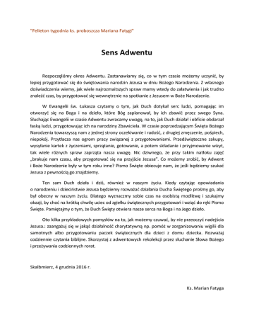 "Felieton tygodnia ks. proboszcza Mariana Fatygi" Sens Adwentu Rozpoczęliśmy okres Adwentu. Zastanawiamy się, co w tym czasie możemy uczynić, by lepiej przygotować się do świętowania narodzin Jezusa w dniu Bożego Narodzenia. Z własnego doświadczenia wiemy, jak wiele najrozmaitszych spraw mamy wtedy do załatwienia i jak trudno znaleźć czas, by przygotować się wewnętrznie na spotkanie z Jezusem w Boże Narodzenie. W Ewangelii św. Łukasza czytamy o tym, jak Duch dotykał serc ludzi, pomagając im otworzyć się na Boga i na dzieło, które Bóg zaplanował, by ich zbawić przez swego Syna. Słuchając Ewangelii w czasie Adwentu zwracamy uwagę, na to, jak Duch działał i obficie obdarzał łaską ludzi, przygotowując ich na narodziny Zbawiciela. W czasie poprzedzającym Święta Bożego Narodzenia towarzyszą nam z jednej strony oczekiwanie i radość, z drugiej zmęczenie, pośpiech, niepokój. Przytłacza nas ogrom pracy związanej z przygotowaniami. Przedświąteczne zakupy, wysyłanie kartek z życzeniami, sprzątanie, gotowanie, a potem składanie i przyjmowanie wizyt, tak wiele różnych spraw zaprząta nasza uwagę. Nic dziwnego, że przy takim natłoku zajęć „brakuje nam czasu, aby przygotować się na przyjście Jezusa”. Co możemy zrobić, by Adwent i Boże Narodzenie były w tym roku inne? Pismo Święte obiecuje nam, że jeśli będziemy szukać Jezusa z pewnością go znajdziemy. Ten sam Duch działa i dziś, również w naszym życiu. Kiedy czytając opowiadania o narodzeniu i dzieciństwie Jezusa będziemy rozważać działania Ducha Świętego prośmy go, aby był obecny w naszym życiu. Dlatego wyznaczmy sobie czas na osobistą modlitwę i szukajmy okazji, by choć na krótką chwilę uciec od zgiełku świątecznych przygotowań i wziąć do ręki Pismo Święte. Pamiętajmy o tym, że Duch Święty otwiera nasze serca na Boga i na Jego dzieło. Oto kilka przykładowych pomysłów na to, jak możemy czuwać, by nie przeoczyć nadejścia Jezusa.: zaangażuj się w jakąś działalność charytatywną np. pomóż w zorganizowaniu wigilii dla samotnych albo przygotowaniu paczek świątecznych dla dzieci z domu dziecka. Rozważaj codziennie czytania biblijne. Skorzystaj z adwentowych rekolekcji przez słuchanie Słowa Bożego i przeżywania codziennych rorat. Skalbmierz, 4 grudnia 2016 r. Ks. Marian Fatyga