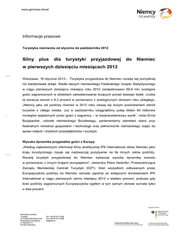 www.germany.travel Informacje prasowe Turystyka niemiecka od stycznia do października 2012 Silny plus dla turystyki przyjazdowej do Niemiec w pierwszych dziesięciu miesiącach 2012 Warszawa, 16 stycznia 2013 - Turystyka przyjazdowa do Niemiec rozwija się pomyślniej niż kiedykolwiek dotąd. Wedle danych niemieckiego Federalnego Urzędu Statystycznego w ciągu pierwszych dziesięciu miesięcy roku 2012 zarejestrowano 59,8 mln noclegów gości zagranicznych w obiektach zakwaterowania liczących ponad dziesięć łóżek. Liczba ta oznacza wzrost o 8,3 procent w porównaniu z analogicznym okresem roku ubiegłego. „Niemcy jako cel podróży również w 2012 roku cieszą się dużym powodzeniem wśród turystów z całego świata. Już w październiku osiągnęliśmy pułap blisko 60 milionów noclegów spędzonych przez gości z zagranicy – to bezprecedensowy wynik”, mówi Ernst Burgbacher, członek niemieckiego Bundestagu, parlamentarny sekretarz stanu przy federalnym ministrze gospodarki i technologii oraz pełnomocnik niemieckiego rządu do spraw małych i średnich przedsiębiorstw i turystyki. Wysoka dynamika przyjazdów gości z Europy „Według najświeższych informacji firmy analitycznej IPK International obraz Niemiec jako kraju turystycznego rysuje się nadzwyczaj pozytywnie na tle innych celów podróży. Rozwój turystyki przyjazdowej do Niemiec wykazuje wysoką dynamikę wzrostu w porównaniu z innymi krajami europejskimi”, stwierdza Petra Hedorfer, Przewodnicząca Zarządu Niemieckiej Centrali Turystyki (DZT). Ilość wszystkich odbywanych przez Europejczyków podróży do Niemiec wzrosła zgodnie ze wstępnymi doniesieniami IPK International w ciągu pierwszych ośmiu miesięcy 2012 o siedem procent, podczas gdy ilość podróży zagranicznych Europejczyków ogółem w tym samym okresie wzrosła tylko o dwa procent. Niemiecka Centrala Turystyki c/o Polsko-Niemiecka Izba Przemysłowo-Handlowa ul. Miodowa 14 00-246 Warszawa Tel. +48 22 53 10 528 Fax +48 22 53 10 688 [email protected] www.germany.travel Stały wzrost liczebności turystów z krajów sąsiednich „Po rekordach osiągniętych w latach 2010 i 2011 obserwujemy również bardzo pozytywny rozwój turystyki przyjazdowej w ciągu pierwszych dziesięciu miesięcy roku 2012, a Niemcy jako cel podróży wyraźnie zmierzają ku kolejnemu rekordowi pod względem liczby noclegów gości zagranicznych w roku 2012”, kontynuuje Petra Hedorfer. Blisko 75 procent gości odwiedzających Niemcy pochodzi z Europy, która jest ich najważniejszym rynkiem źródłowym. W okresie od stycznia do października 2012 zarejestrowano prawie 45,3 mln noclegów gości z Europy. Tradycyjnie już najsilniejszy progres dotyczy przede wszystkim Holandii, która jest kluczowym rynkiem źródłowym dla Niemiec. Tutaj zwyżka ponownie sięgnęła 2,5 procent w porównaniu z analogicznym okresem roku poprzedzającego i wyniosła ogółem blisko 9,9 mln noclegów w ciągu pierwszych jego dziesięciu miesięcy. Według ostatnich analiz IPK International nasilenie podróży do Niemiec ze strony turystów z Holandii kształtuje się na poziomie czterech procent, co jest wielkością dwukrotnie wyższą od wzrostu liczby podróży turystów holenderskich ogółem. Niemcy nadal utrzymują swoją znaczną przewagę jako najpopularniejszy cel podróży Holendrów w 2012 i już po raz szósty są numerem jeden na rynku. Również Szwajcaria, drugi co do znaczenia rynek źródłowy dla turystyki przyjazdowej do Niemiec, rozwija się – podobnie jak dotychczas – bardzo pozytywnie i z przyrostem rzędu 9,6 procent istotnie przyczynia się powiększenia wolumenu noclegów. Silna progresja Europy Północnej i Południowej Kolejny pokaźny wzrost z liczbą noclegów wyższą o 5,1 procent pochodzi z Wielkiej Brytanii. Według IPK International wzrost liczby podróży gości brytyjskich podróżujących do Niemiec, kształtujący się na poziomie około 5 procent, jest wyraźnie większy niż ilość podróży zagranicznych turystów z Wielkiej Brytanii ogółem (+1 procent w porównaniu z analogicznym okresem w roku poprzedzającym). Dobre dziesięć procent na plus noclegów zanotowano na przestrzeni od stycznia do października 2012 ze sporego rozmiarowo rynku duńskiego (około 2,5 miliona noclegów ogółem). Także Włochy ze wzrostem 6,6 procent w porównaniu z analogicznym okresem roku poprzedzającego Niemiecka Centrala Turystyki c/o Polsko-Niemiecka Izba Przemysłowo-Handlowa ul. Miodowa 14 00-246 Warszawa Tel. +48 22 53 10 528 Fax +48 22 53 10 688 [email protected] www.germany.travel bardzo pozytywnie rozwijają się jako rynek źródłowy dla turystyki przyjazdowej do Niemiec. To jednak przede wszystkim dlatego, że podróże zagraniczne Włochów ogółem niestety spadły o 5 procent, za to liczba podróży do Niemiec wzrosła o 4 procent. Nieprzeciętne wzrosty z krajów BRIC i Zatoki Perskiej Szczególnie wysokie wzrosty odnotowały Rosja i Chiny. Każdy z obu tych rynków źródłowych zarejestrował plus o ponad 20 procent. Chiny i Rosja są również liderami pod względem zakupów dokonywanych w Niemczech: w okresie od stycznia do września 2012 obie te nacje wygenerowały prawie 54 procent całkowitego obrotu bezcłowego. Bardzo pozytywny plus o 29,4 procent, co stanowi ponad milion noclegów, osiągnęły kraje Zatoki Perskiej w ciągu pierwszych dziesięciu miesięcy 2012. Turyści z tego regionu są wyjątkowo hojni: według danych dostarczonych przez IPK International w opublikowanych World Travel Monitor wydali oni w 2011 roku średnio 3850 euro na podróż do Niemiec. Dla porównania turyści europejscy zapłacili średnio 511 euro za podróż do Niemiec. Podsumowując, światowe prognozy turystyczne dla podróży zagranicznych na 2013 rok wypadają obiecująco. 28 procent ankietowanych w badaniu IPK zadeklarowało chęć odbycia przynajmniej jednej, a może nawet kilku podróży zagranicznych w 2013. To niemalże pięć p