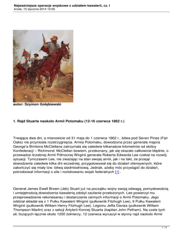 Najważniejsze operacje wojskowe z udziałem kawalerii, cz. I środa, 15 stycznia 2014 10:05 autor: Szymon Gołębiewski 1. Rajd Stuarta naokoło Armii Potomaku (12-16 czerwca 1862 r.) Trwająca dwa dni, a mianowicie od 31 maja do 1 czerwca 1862 r., bitwa pod Seven Pines (Fair Oaks) nie przyniosła rozstrzygnięcia. Armia Potomaku, dowodzona przez generała majora George’a Brintona McClellana zatrzymała się zaledwie kilkanaście kilometrów od stolicy Konfederacji – Richmond. McClellan bowiem, przekonany, jak się okazało całkowicie błędnie, o przewadze liczebnej Armii Północnej Wirginii generała Roberta Edwarda Lee czekał na rozwój sytuacji. Tymczasem Lee, nie zważając na stan swojej armii, jak i na fakt, że przejął dowodzenie zaledwie kilka dni wcześniej, przygotowywał się do działań ofensywnych, które zakończyć się miały tzw. bitwą siedmiodniową. Jednak, ażeby móc przystąpić do działań, potrzebował informacji o sile i rozlokowaniu wojsk federalnych [1] . Generał James Ewell Brown (Jeb) Stuart już na początku wojny swoją odwagą, pomysłowością i umiejętnością dowodzenia kawalerią zdobył zaufanie przełożonych. Lee powierzył mu przeprowadzenie rekonesansu i dostarczenie cennych informacji o Armii Potomaku. Jego oddział składał się z 1 Pułku Kawalerii Wirginii (pułkownik Fitzhugh Lee), 9 Pułku Kawalerii Wirginii (pułkownik William Henry Fitzhugh Lee), Legionu Jeffa Davisa (pułkownik William Thompson Martin) oraz z sekcji Artylerii Konnej Stuarta (kapitan John Pelham). Na czele tych sił, liczących łącznie około 1200 żołnierzy, 12 czerwca wyruszył w słynny rajd naokoło Armii 1/4 Najważniejsze operacje wojskowe z udziałem kawalerii, cz. I środa, 15 stycznia 2014 10:05 Potomaku, który stał się jednym z jego pierwszych, legendarnych wyczynów [2] . Kierując się początkowo na północ, w stronę Fredericksburga, kawalerzyści Konfederacji wprowadzili w błąd żołnierzy federalnych, co do swoich rzeczywistych zamiarów. Przez cztery dni oddział generała Stuarta zdołał objechać i rozpoznać całą Armię Potomaku, po czym bezpiecznie powrócił do swojego obozu. Zebrano cenne informacje o liczebności oraz rozlokowaniu sił wroga. W trakcie tego zagonu doszło do kilku nieznaczących potyczek, a Stuart stracił jednego kawalerzystę, mianowicie kapitana Williama Latane’a z 9 Pułku Kawalerii Wirginii, który zginął w walce 13 czerwca. Poza tym miał kilkunastu rannych, a nikt nie został wzięty do niewoli. Natomiast, dokonując zniszczeń składów, przerywając druty telegraficzne oraz zdobywając cenne zaopatrzenie, Stuart przyprowadził ze sobą 165 jeńców, wliczając w to także woźniców i innych cywili pracujących na rzecz armii Unii. Niezmiernie istotnym czynnikiem było też potwierdzenie wyższości wyszkolenia i operatywności kawalerii Konfederacji nad jazdą Unii, przynajmniej w tym okresie wojny, oraz podbudowanie morale armii generała Lee. Stąd też generał Jeb Stuart zdobył jego bezgraniczne zaufanie. Od tego momentu był on „oczami i uszami” Armii Północnej Wirginii, wykonując swoje zadanie skutecznie, poza niefortunną dla niego kampanią gettysburską w 1863 r., aż do swojej śmierci w bitwie pod Yellow Tavern w dniu 11 maja 1864 r. [3] W swoim artykule zamieszczonym w drugim tomie Battles and Leaders of the Civil War jeden z dowódców kawalerii Unii, mianowicie generał brygady William Woods Averell, chwaląc generała Stuarta za zaplanowanie i przeprowadzenie całej operacji, jednocześnie słusznie podkreślił, że konfederacki dowódca nie wykorzystał doskonałej okazji do zniszczenia bazy zaopatrzeniowej Armii Potomaku w White House, co by znacznie utrudniło siłom federalnym prowadzenie działań wojennych na Półwyspie [4] . Reasumując należy stwierdzić, że był to pierwszy z całkowicie samodzielnych rajdów kawalerii w amerykańskiej wojnie secesyjnej, i co ważne – znakomicie przeprowadzony. Zainspirował on następnie wielu innych dowódców uczestniczących w tym konflikcie do podejmowania mniej lub bardziej udanych prób powtórzenia sukcesu Jeba Stuarta [5] . 2/4 Najważniejsze operacje wojskowe z udziałem kawalerii, cz. I środa, 15 stycznia 2014 10:05 2. Rajd Griersona (17 kwietnia-2 maja 1863 r.) Połowa 1863 r. była okresem przełomowym w przebiegu wojny secesyjnej. Na froncie wschodnim generał Lee zdecydował się na podjęcie ofensywy na Północ, zakończonej bolesną klęską poniesioną na początku lipca przez konfederatów pod Gettysburgiem. Natomiast w tym samym czasie na zachodzie generał major Ulysses Simpson Grant uparcie dążył do zdobycia „Gibraltaru Zachodu”, czyli Vicksburga, co ostatecznie nastąpiło 4 lipca 1863 r. Zanim Grant mógł przyjąć bezwarunkową kapitulację z rąk dowódcy obrony Vicksburga generała porucznika Johna Clifforda Pembertona, zezwolił na przeprowadzenie szeroko zakrojonego rajdu kawaleryjskiego na tyły wroga. Jego celem była dywersja, która miała wesprzeć działania głównych sił wojsk Unii prowadzone przeciwko tej konfederackiej twierdzy. Dowództwo nad rajdem objął pułkownik Benjamin Henry Grierson. Do swojej dyspozycji miał on około 1700 żołnierzy służących w szeregach 6 i 7 Ochotniczych Pułków Kawalerii Illinois oraz 2 Ochotniczego Pułk Kawalerii Iowa. 3/4 Najważniejsze operacje wojskowe z udziałem kawalerii, cz. I środa, 15 stycznia 2014 10:05 pułkownik Benjamin Henry Grierson Wyruszając przemierzając tereny zniszczenia. składy tego Ponadto, konfederackich zagonu Konfederacji, zaopatrzenia wysyłając zwolną Niszczył zadał południowego stan w błąd nieprzyjacielowi Missisipi mniejsze oraz na bowiem co które burzył do Tennessee, ibył swoich oddziały dotychczas bezpiecznie linie mosty, kolejowe, straty rzeczywistych na budynki mianowicie nie samodzielne dziesięciokrotnie docierając uwalniał wkroczyli kolejowe celów zlinii do niewolników, La żo