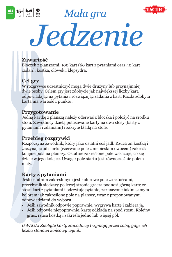 rodzina 15 + lat 2+ graczy 30+ min. Jedzenie Zawartość Bloczek z planszami, 100 kart (60 kart z pytaniami oraz 40 kart zadań), kostka, ołówek i klepsydra. Cel gry W rozgrywce uczestniczyć mogą dwie drużyny lub przynajmniej dwie osoby. Celem gry jest zdobycie jak największej liczby kart, odpowiadając na pytania i rozwiązując zadania z kart. Każda zdobyta karta ma wartość 1 punktu. Przygotowanie Jedną kartkę z planszą należy oderwać z bloczka i położyć na środku stołu. Zawodnicy dzielą potasowane karty na dwa stosy (karty z pytaniami i zdaniami) i zakryte kładą na stole. Przebieg rozgrywki Rozpoczyna zawodnik, który jako ostatni coś jadł. Rzuca on kostką i zaczynając od startu (czerwone pole z niebieskim owocem) zakreśla kolejne pola na planszy. Ostatnie zakreślone pole wskazuje, co się dzieje w jego kolejce. Uwaga: pole startu jest równocześnie polem mety. Karty z pytaniami Jeśli ostatnim zakreślonym jest kolorowe pole ze sztućcami, przeciwnik siedzący po lewej stronie gracza podnosi górną kartę ze stosu kart z pytaniami i odczytuje pytanie, zaznaczone takim samym kolorem jak zakreślone pole na planszy, wraz z proponowanymi odpowiedziami do wyboru. • Jeśli zawodnik odpowie poprawnie, wygrywa kartę i zabiera ją. • Jeśli odpowie niepoprawnie, kartę odkłada na spód stosu. Kolejny gracz rzuca kostką i zakreśla jedno lub więcej pól. UWAGA! Zdobyte karty zawodnicy trzymają przed sobą, gdyż ich liczba stanowi końcowy wynik. Karty Zadań – dwa rodzaje Jeśli ostatnie zakreślone jest białe pole z łyżeczką, zawodnik bierze górna kartę ze stosu kart zadań. Może wylosować dwa rodzaje kart: Memory Rysunkowe i Anagramy. • Memory Rysunkowe Zawodnik, który rzucał kostką, ma 30 sekund na obejrzenie i zapamiętanie zawartości karty (do odmierzenia czasu używa się klepsydry). Po upływie tego czasu osoba siedząca po lewej otrzymuje tę kartę i wymyśla jedno pytanie związane z obrazkami na niej. Na przykład: „Jaki jest kolor…?”, „Ile jest tam...?”, „Kto trzyma …?”, itp. Jeśli zawodnik odpowie poprawnie, wygrywa kartę. Jeśli odpowie niepoprawnie, kartę odkłada się na spód stosu kart zadań. • Anagramy Na koszulkach tych kart znajduje się napis „ANAGRAMY” . Gracz nie może obejrzeć zawartości takiej karty zanim nie obróci klepsydry. Kiedy to uczyni musi jak najszybciej, zanim przesypie się piasek, podać poprawną nazwę słów z karty (na wszystkich kartach znajdują się trzy słowa z wymieszanymi literami). Podczas zastanawiania się może oglądać kartę, ponieważ pod każdym słowem znajduje się podpowiedź. Jeśli zawodnik zna odpowiedź, musi ją głośno podać. Jeśli odpowiedział niepoprawnie, kartę zdobywa osoba siedząca po jego lewej stronie. Jeśli 2 z 3 słów zostały odgadnięte, kartę zdobywa odpowiadający. Jeśli mniej niż 2 słowa zostały odgadnięte, kartę odkłada się na spód stosu kart zadań i kontynuuje grę. Na kartach z anagramami nie ma odpowiedzi, dlatego zawodnicy muszą dokładnie je sprawdzić np. zapisując dłuższe słowa. Zwycięzca Gra kończy się, gdy którykolwiek zawodnik dotrze do mety. Zwycięzcą zostaje posiadacz największej ilości kart. Art. no. 40844 A Więcej gier znajdziesz na: rodzina 18 + lat 2+ graczy 30+ Wino min. Zawartość: Bloczek z planszami, 100 kart (60 kart z pytaniami oraz 40 kart zadań), kostka, ołówek i klepsydra. Cel gry W rozgrywce uczestniczyć mogą dwie drużyny lub przynajmniej dwie osoby. Celem gry jest zdobycie jak największej liczby kart, odpowiadając na pytania i rozwiązując zadania z kart. Każda zdobyta karta ma wartość 1 punktu. Przygotowanie Jedną kartkę z planszą należy oderwać z bloczka i położyć na środku stołu. Zawodnicy dzielą potasowane karty na dwa stosy (karty z pytaniami i zdaniami) i zakryte kładą na stole. Przebieg rozgrywki Rozpoczyna najstarszy zawodnik. Rzuca on kostką i zaczynając od startu (czerwone pole z winogronem) zakreśla kolejne pola na planszy. Ostatnie zakreślone pole wskazuje, co się dzieje w jego kolejce. Uwaga: pole startu jest równocześnie polem mety. Karty z pytaniami Jeśli ostatnim zakreślonym jest kolorowe pole, przeciwnik siedzący po lewej stronie gracza podnosi górną kartę ze stosu kart z pytaniami i odczytuje pytanie, zaznaczone takim samym kolorem jak zakreślone pole na planszy, wraz z proponowanymi odpowiedziami do wyboru. • Jeśli zawodnik odpowie poprawnie, wygrywa kartę i zabiera ją. • Jeśli odpowie niepoprawnie, kartę odkłada na spód stosu. Kolejny gracz rzuca kostką i zakreśla jedno lub więcej pól. UWAGA! Zdobyte karty zawodnicy trzymają przed sobą, gdyż ich liczba stanowi końcowy wynik. Karty Zadań – dwa rodzaje Jeśli ostatnie zakreślone jest białe pole, zawodnik bierze górna kartę ze stosu kart zadań. Może wylosować dwa rodzaje kart: Memory Rysunkowe i Anagramy. • Memory Rysunkowe Zawodnik, który rzucał kostką, ma 30 sekund na obejrzenie i zapamiętanie zawartości karty (do odmierzenia czasu używa się klepsydry). Po upływie tego czasu osoba siedząca po lewej otrzymuje tę kartę i wymyśla jedno pytanie związane z obrazkami na niej. Na przykład: „Jaki jest kolor…?”, „Ile jest tam...?”, „Kto trzyma …?”, itp. Jeśli zawodnik odpowie poprawnie, wygrywa kartę. Jeśli odpowie niepoprawnie, kartę odkłada się na spód stosu kart zadań. • Anagramy Na koszulkach tych kart znajduje się napis „ANAGRAMY” . Gracz nie może obejrzeć zawartości takiej karty zanim nie obróci klepsydry. Kiedy to uczyni musi jak najszybciej, zanim przesypie się piasek, podać poprawną nazwę słów z karty (na wszystkich kartach znajdują się trzy słowa z wymieszanymi literami). Podczas zastanawiania się może oglądać kartę, ponieważ pod każdym słowem znajduje się podpowiedź. Jeśli zawodnik zna odpowiedź, musi ją głośno podać. Jeśli odpowiedział niepoprawnie, kart